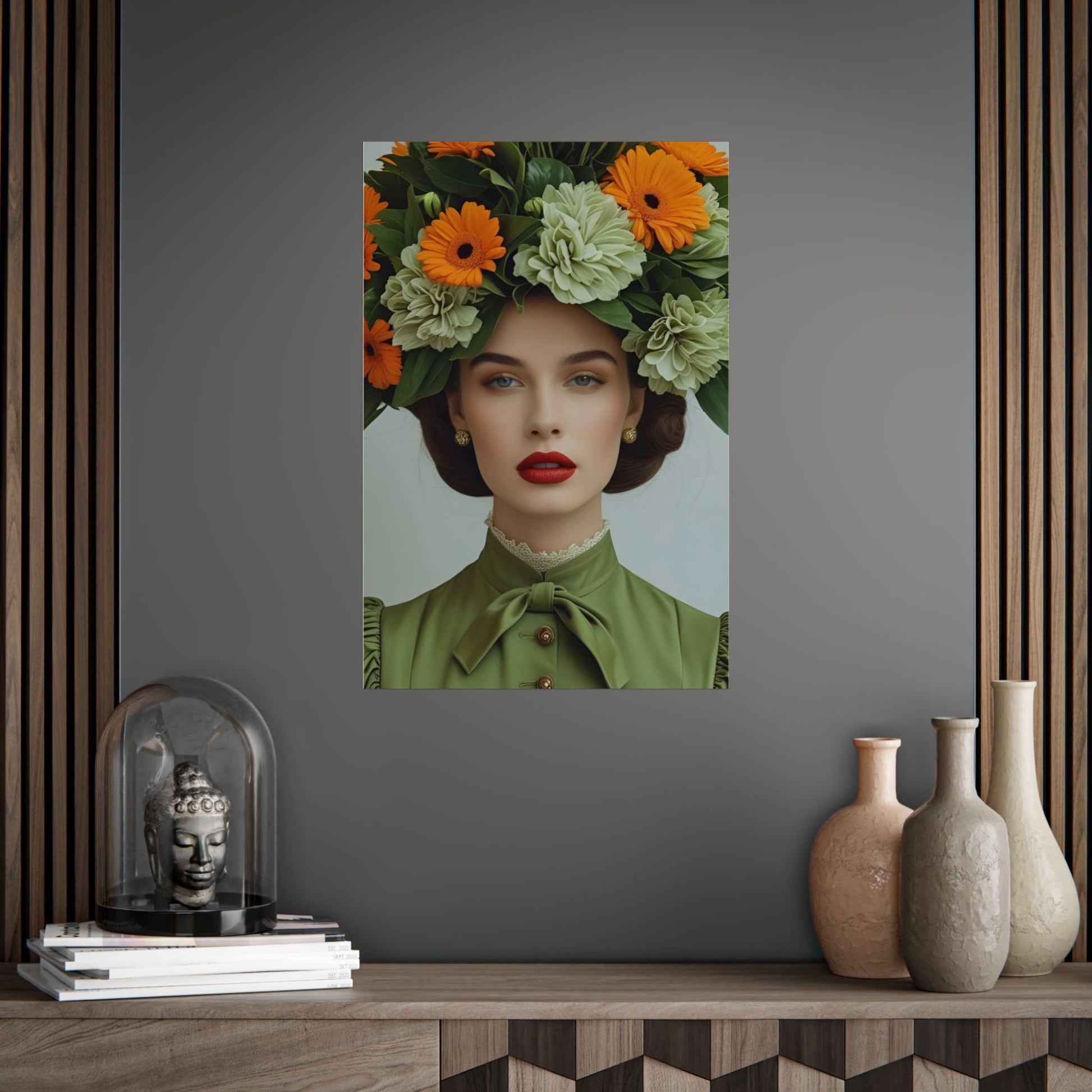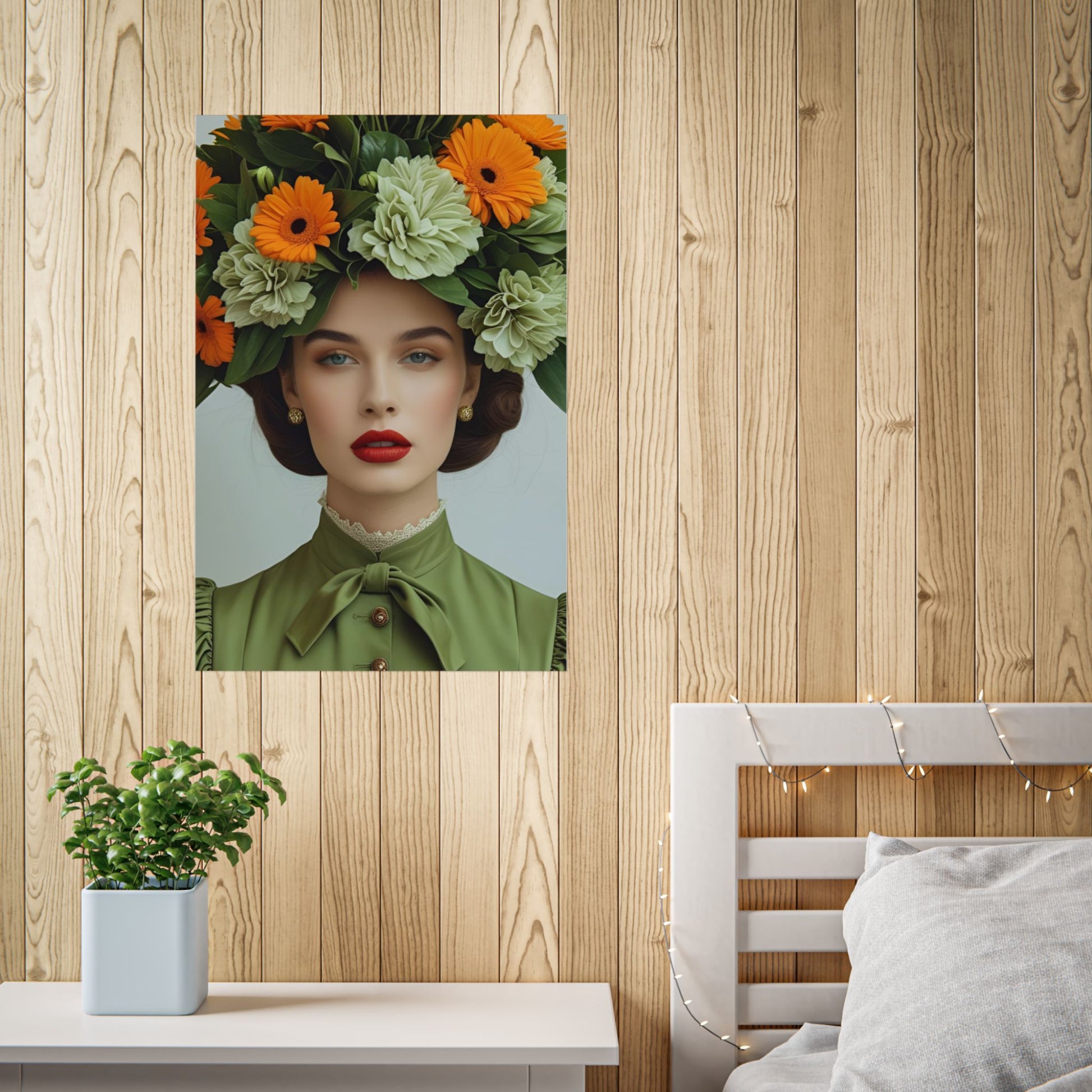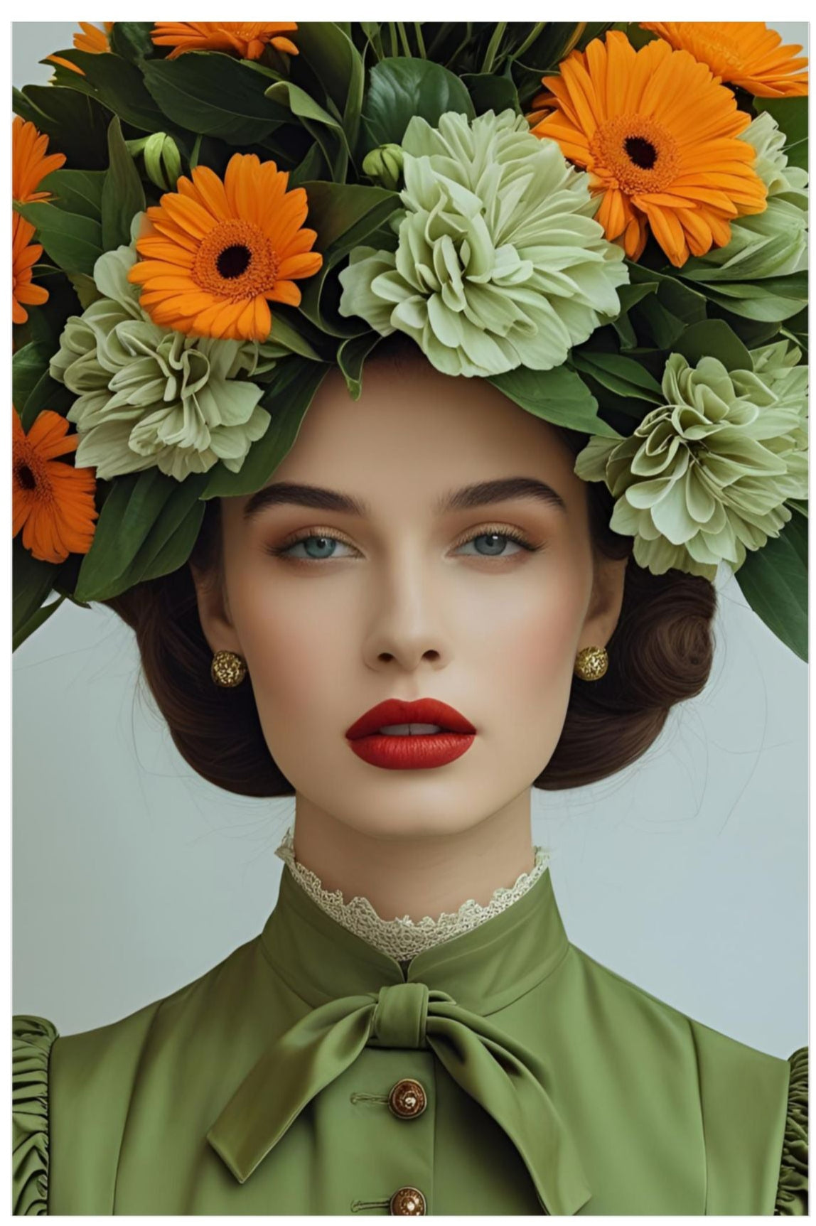 Amelia is an elegant portrait that celebrates the harmony between human grace and the natural world. Wearing a crown of radiant orange gerberas and soft green blooms, Amelia embodies both sophistication and vitality. Her poised expression and classic style reflect her devotion to cultivating life and beauty, making her not just a figure of art but a symbol of growth, renewal, and timeless elegance.