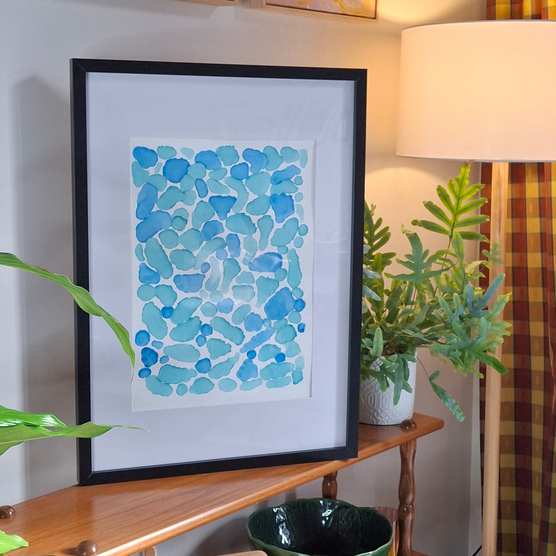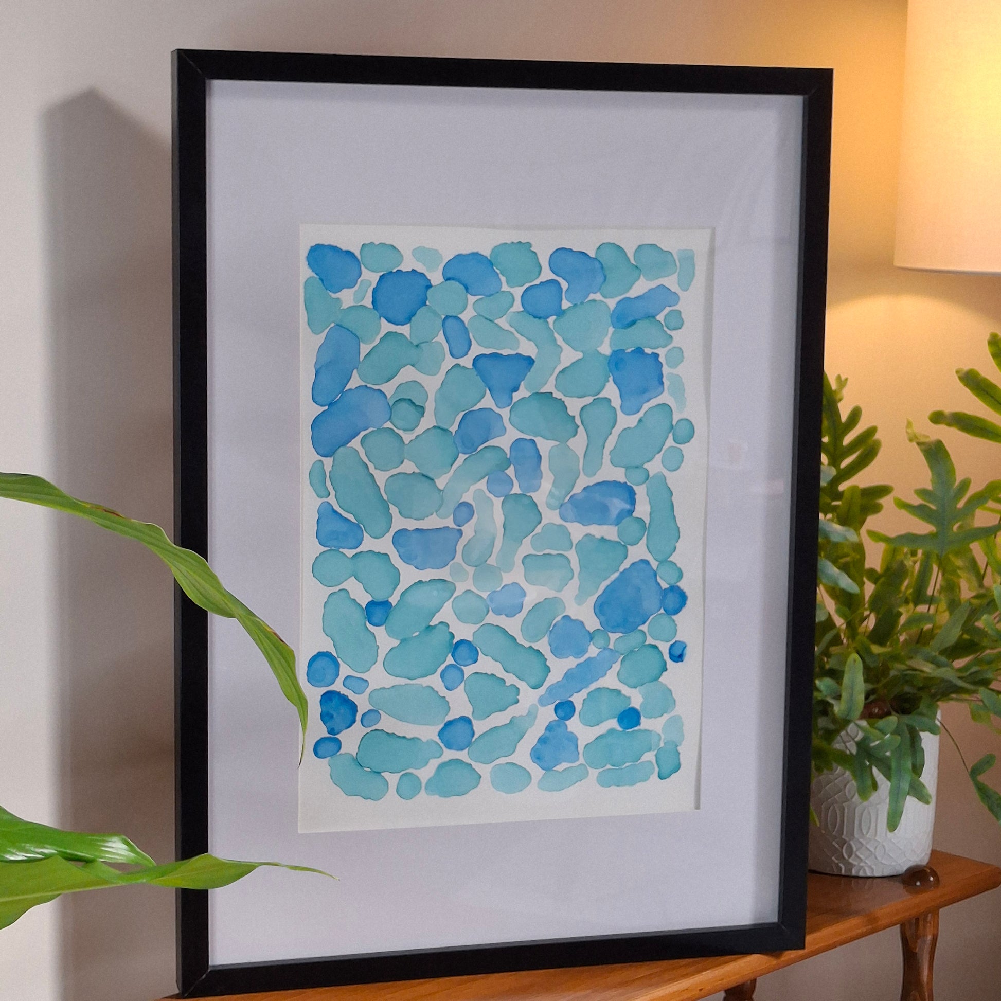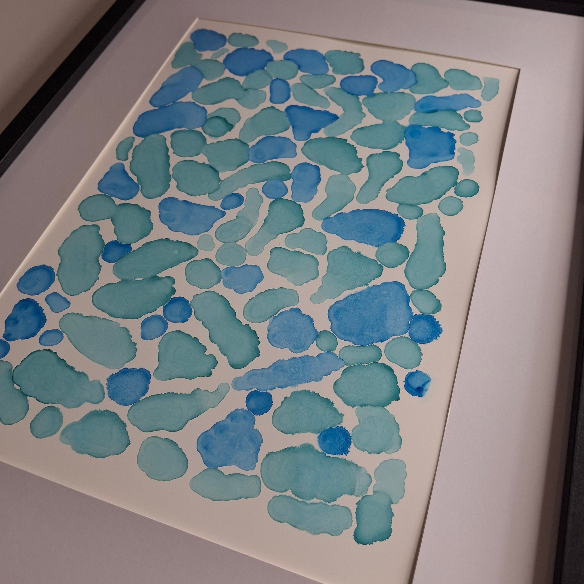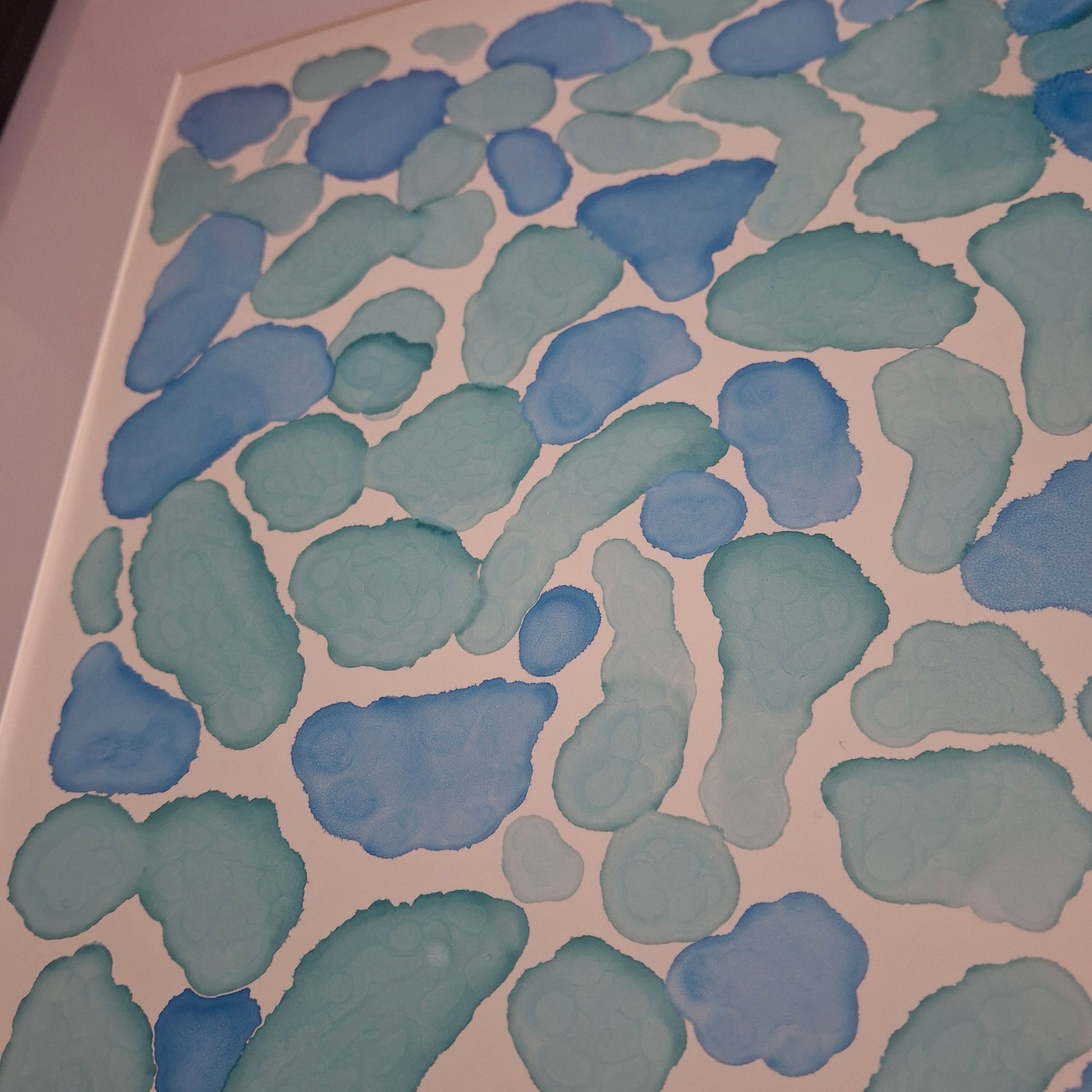 By the Sea is an A3 original artwork created with alcohol inks, inspired by the shapes, movement, and colours found along cold, quiet beaches. Layers of soft turquoise and deep ocean blue flow together in organic forms, echoing scattered seashells, smooth pebbles, sea glass and tidal pools revealed at low tide. Each shape has been carefully placed to evoke the meditative rhythm of wandering the shoreline, breathing in salty air, and feeling the crisp sea breeze. This piece captures the beauty of still moments by the water, offering a sense of calm and connection to the raw, untamed edge of the ocean.