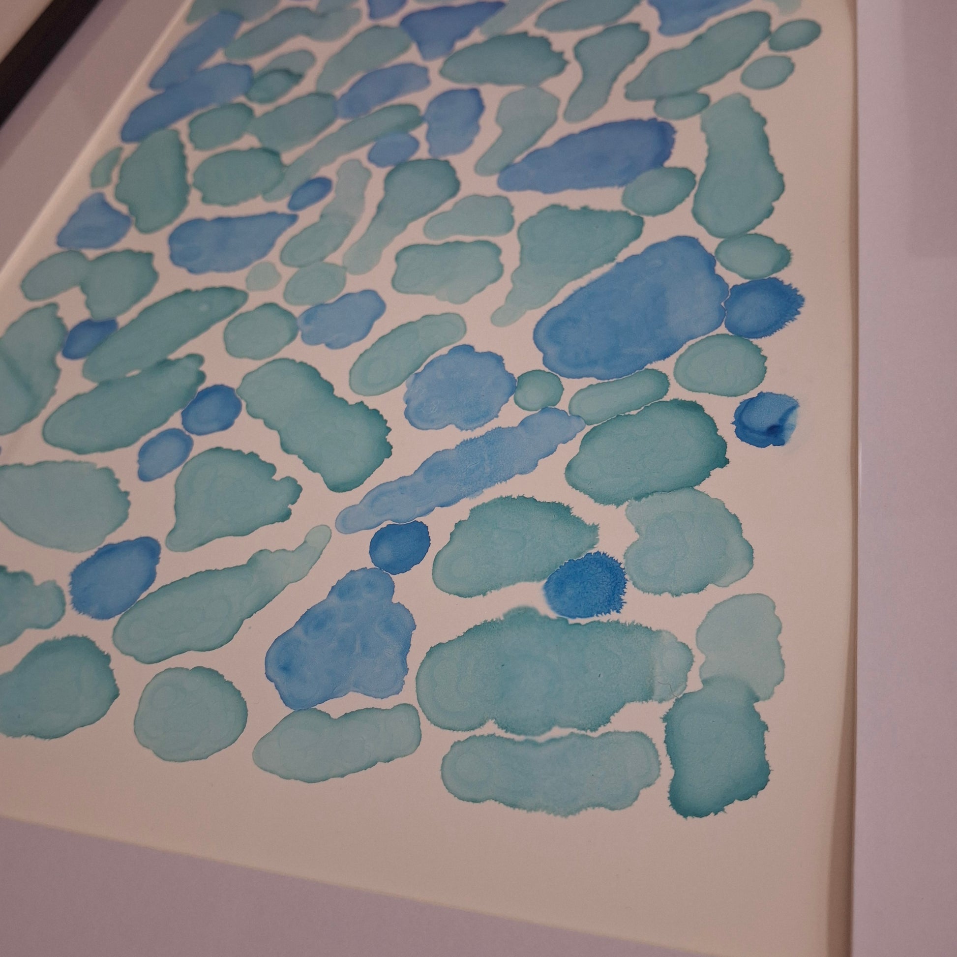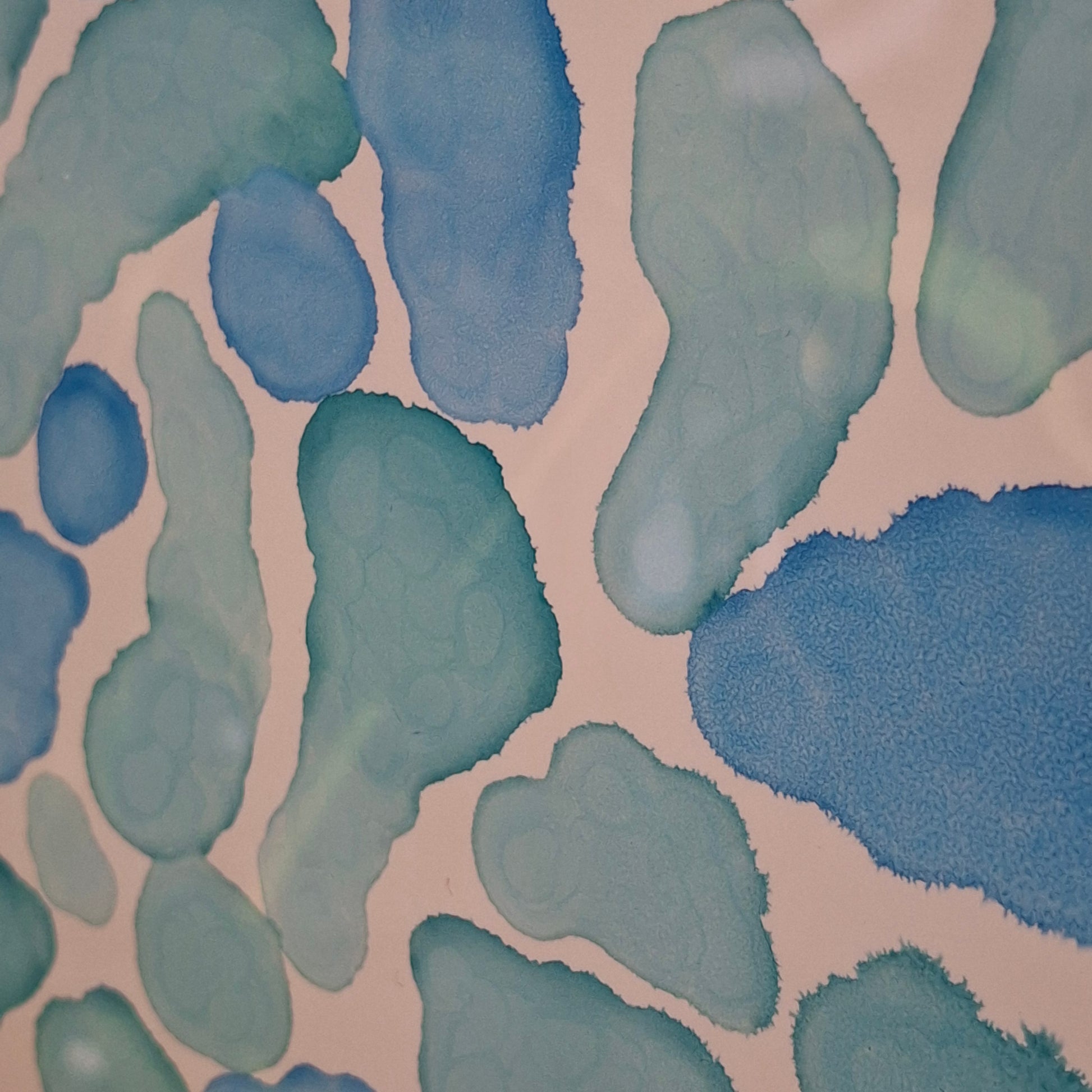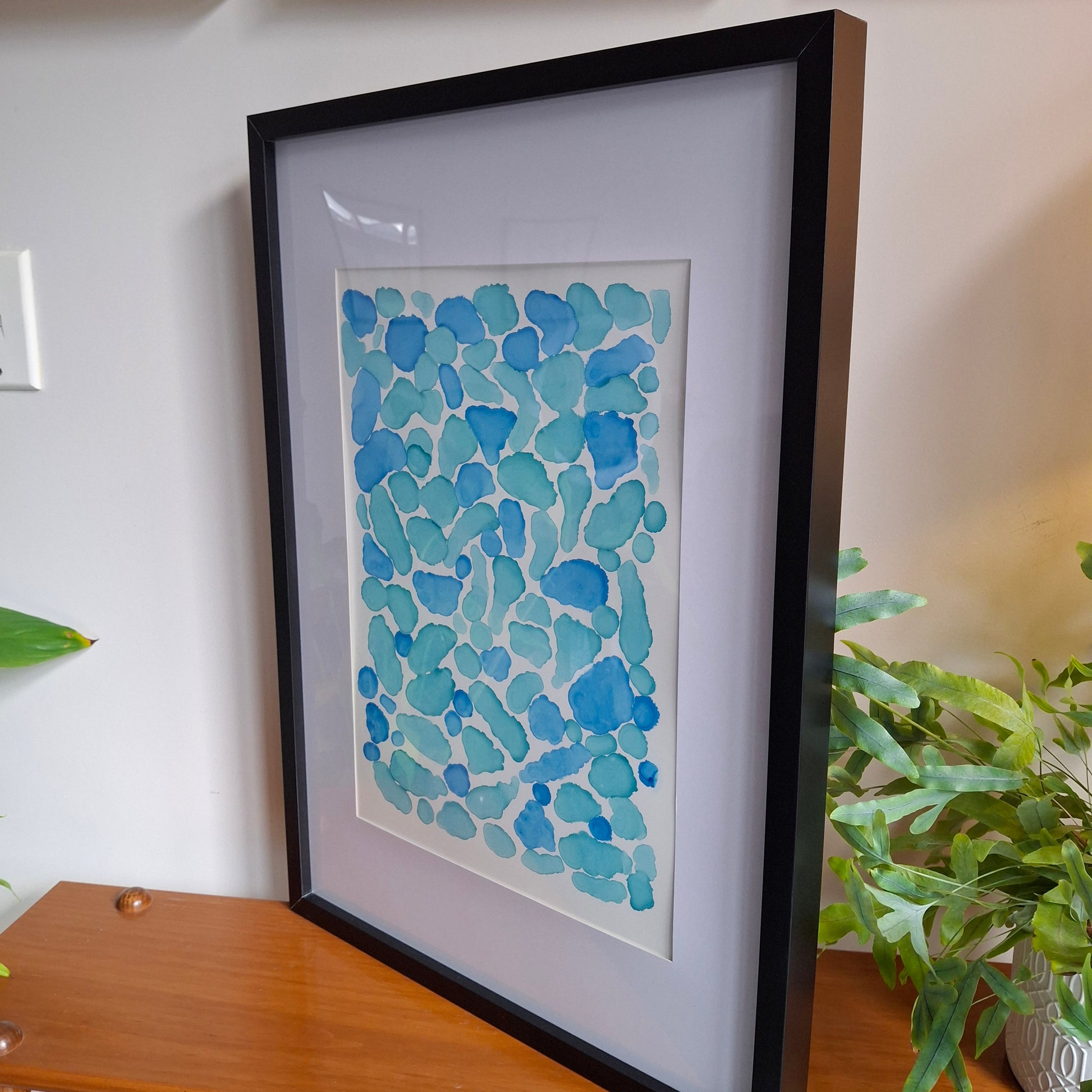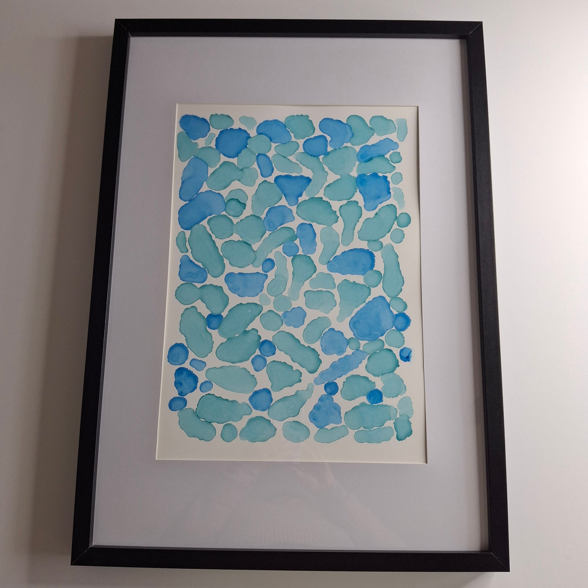 By the Sea is an A3 original artwork created with alcohol inks, inspired by the shapes, movement, and colours found along cold, quiet beaches. Layers of soft turquoise and deep ocean blue flow together in organic forms, echoing scattered seashells, smooth pebbles, sea glass and tidal pools revealed at low tide. Each shape has been carefully placed to evoke the meditative rhythm of wandering the shoreline, breathing in salty air, and feeling the crisp sea breeze. This piece captures the beauty of still moments by the water, offering a sense of calm and connection to the raw, untamed edge of the ocean.