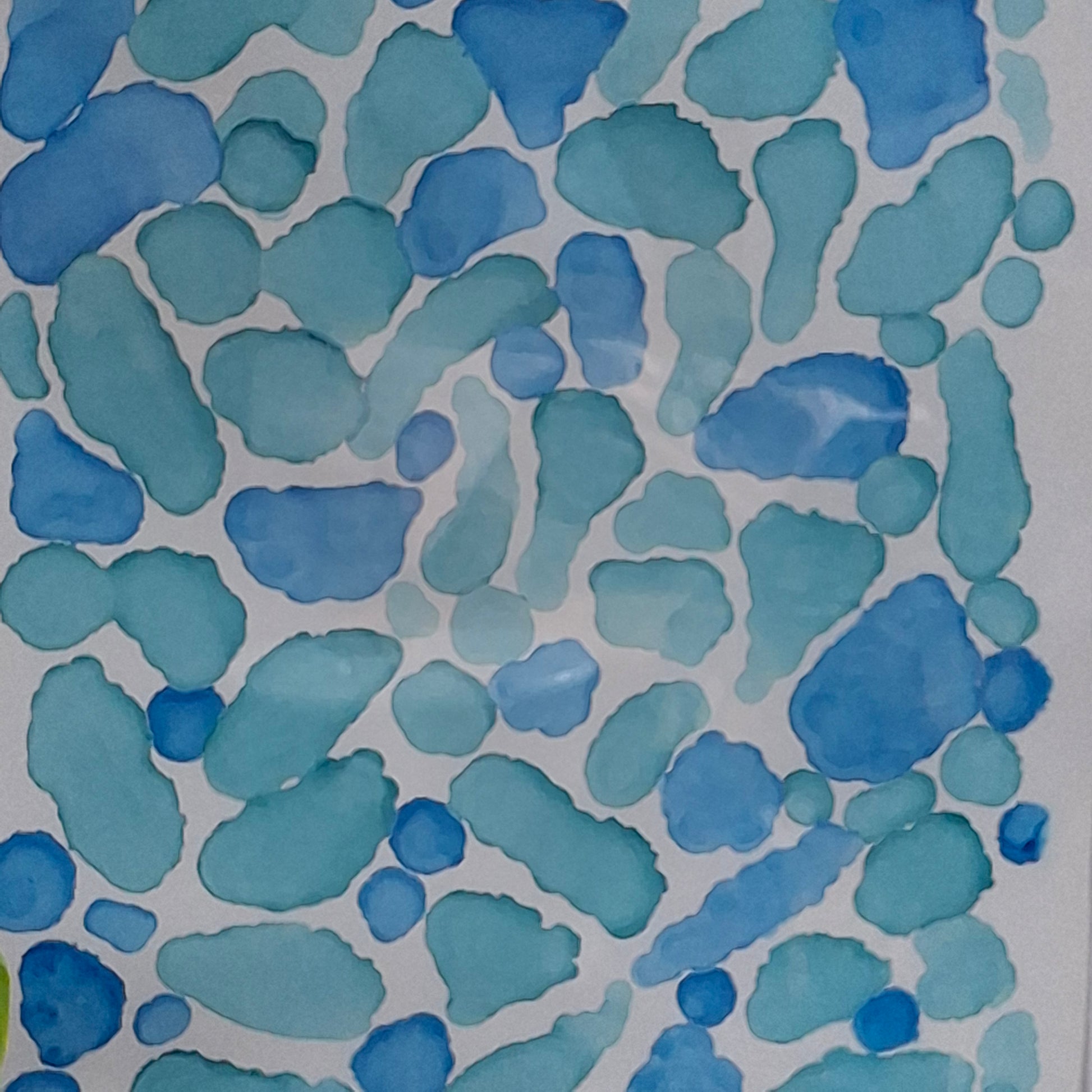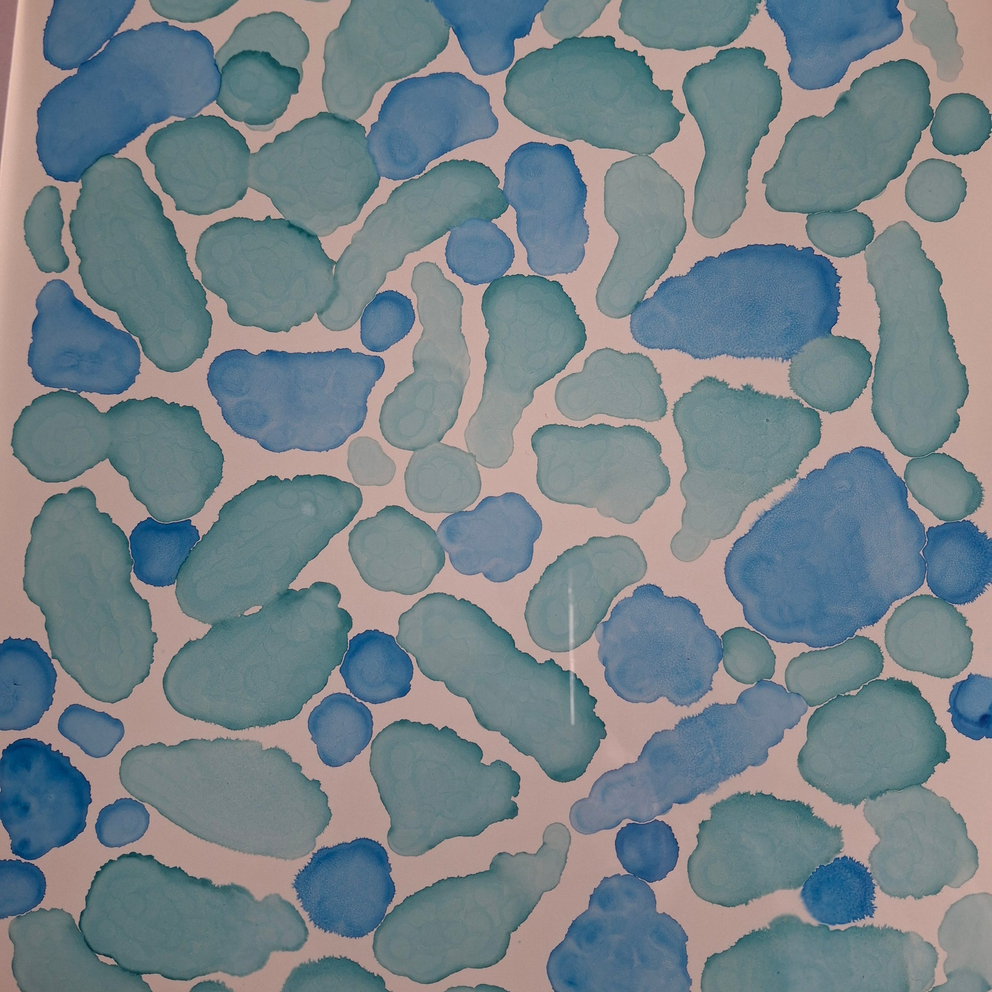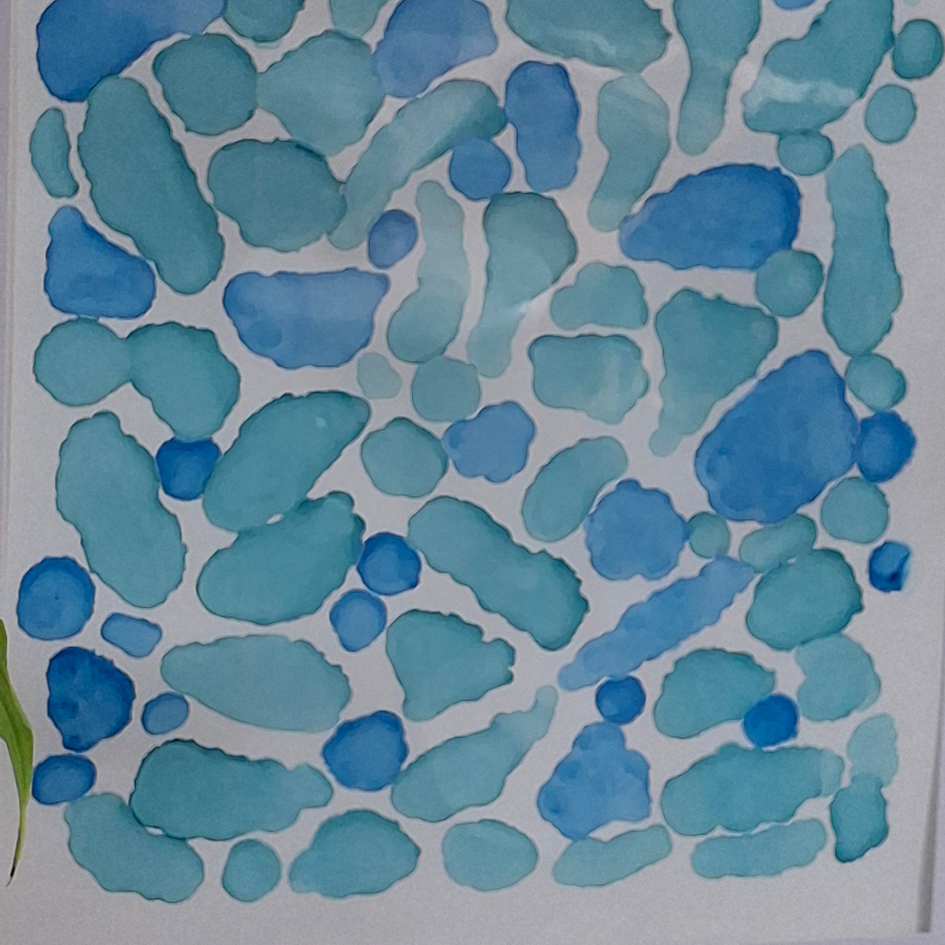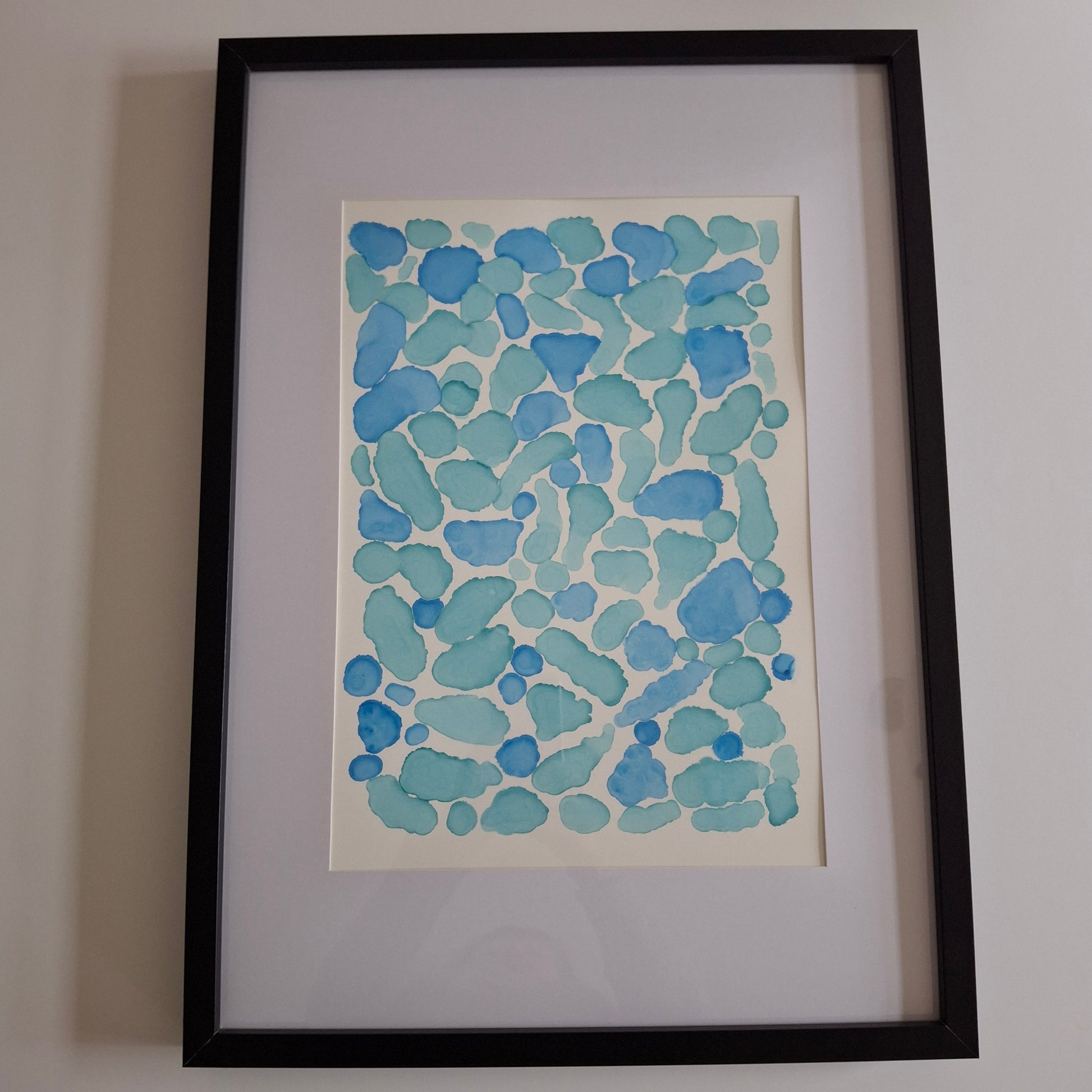 By the Sea is an A3 original artwork created with alcohol inks, inspired by the shapes, movement, and colours found along cold, quiet beaches. Layers of soft turquoise and deep ocean blue flow together in organic forms, echoing scattered seashells, smooth pebbles, sea glass and tidal pools revealed at low tide. Each shape has been carefully placed to evoke the meditative rhythm of wandering the shoreline, breathing in salty air, and feeling the crisp sea breeze. This piece captures the beauty of still moments by the water, offering a sense of calm and connection to the raw, untamed edge of the ocean.