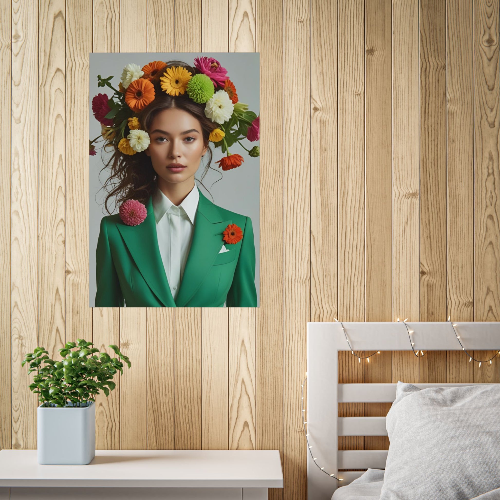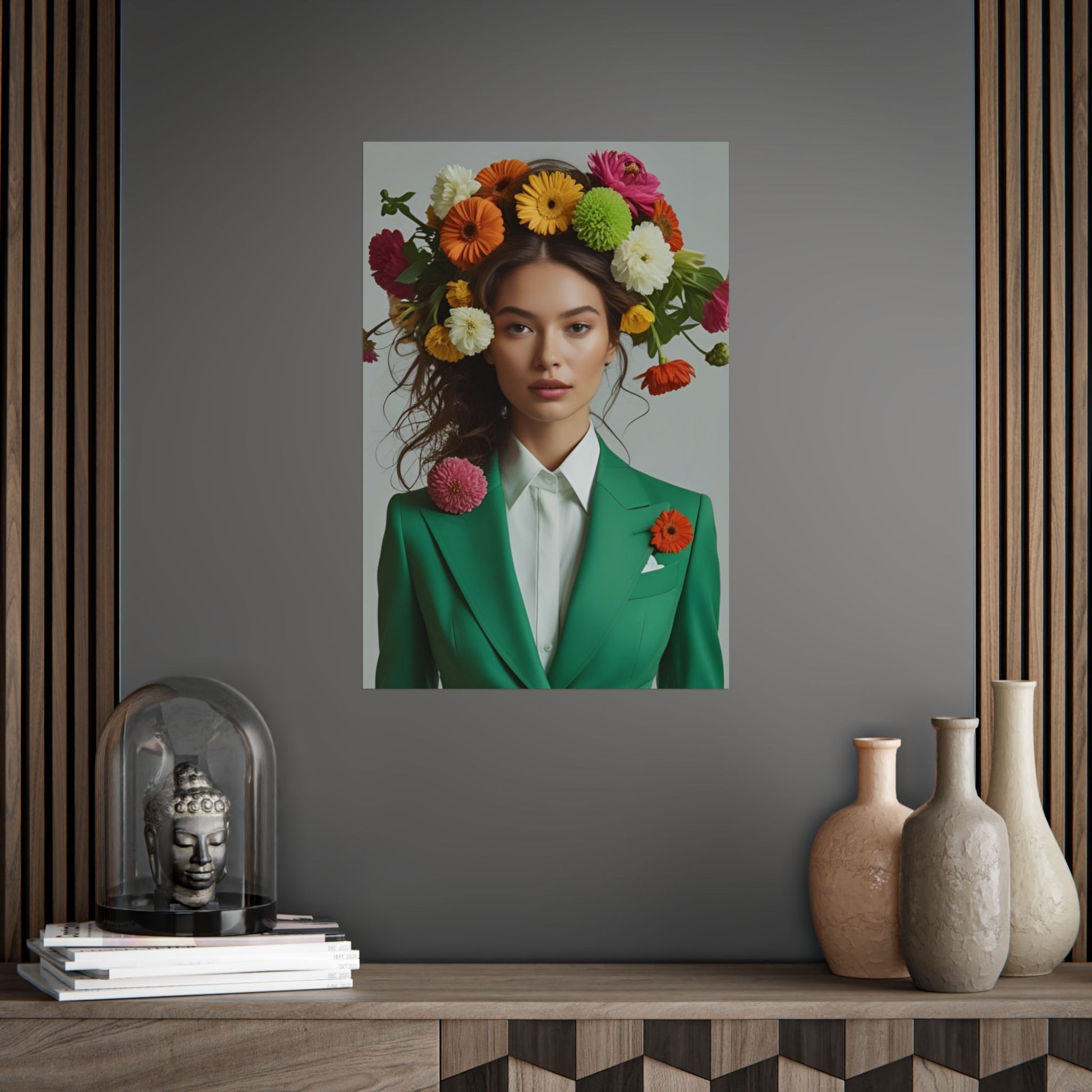 Charlotte is a striking vision of balance between power and grace. Dressed in a vintage emerald-green suit, she embodies sophistication and intellect, her crown of bold blossoms hinting at the vibrancy she carries within. Her calm, assured expression radiates quiet strength, while the playful burst of flowers suggests creativity and warmth—a woman who leads with both logic and heart.