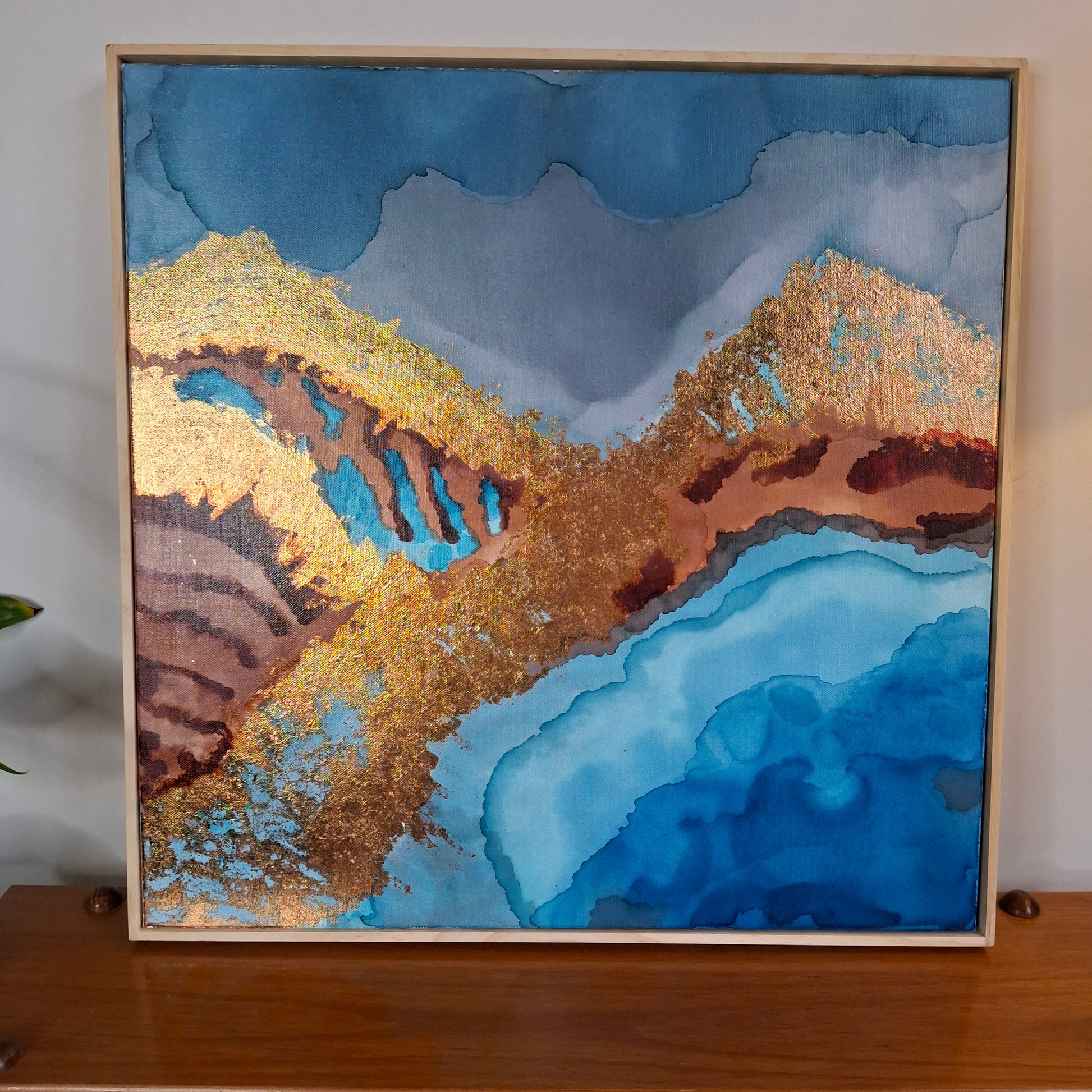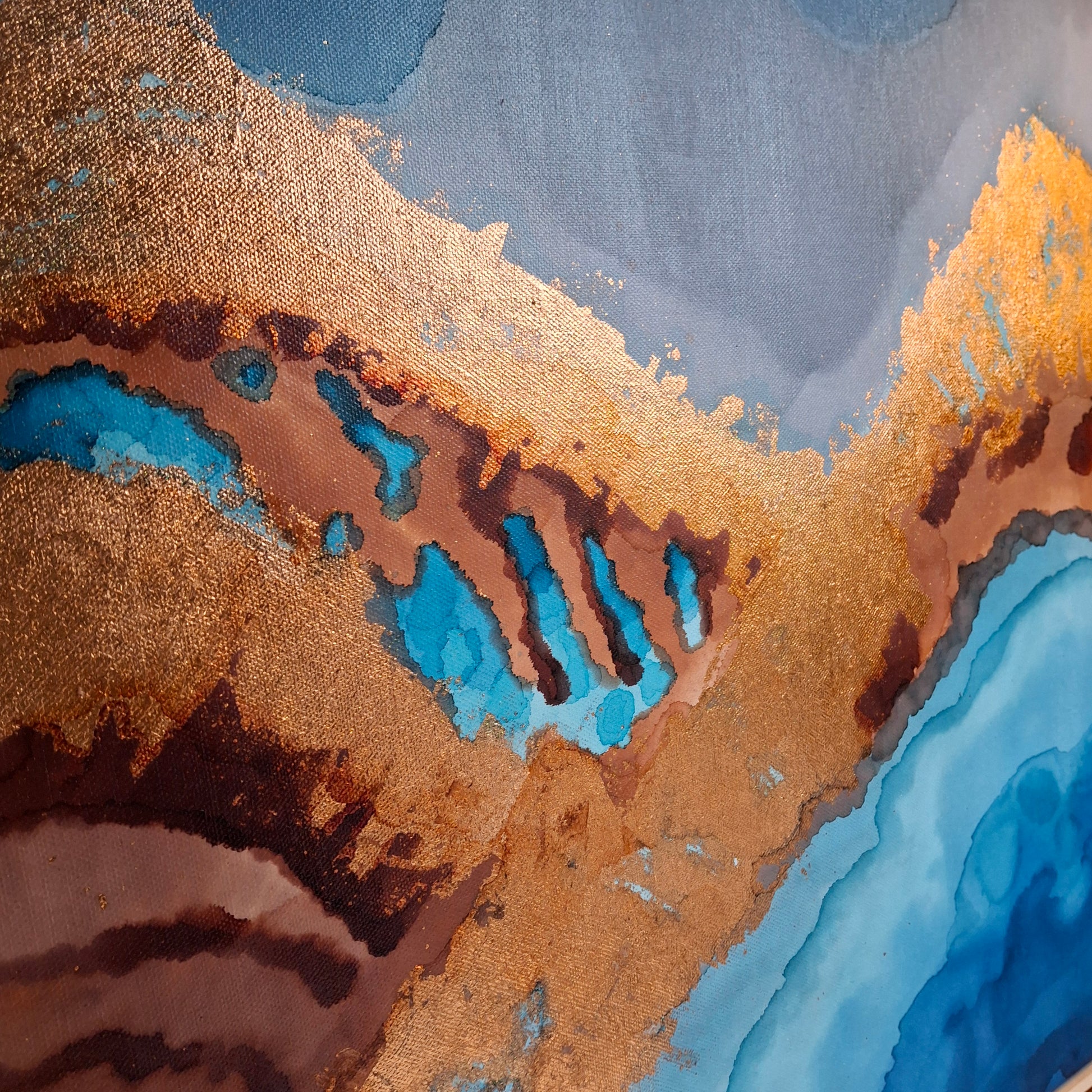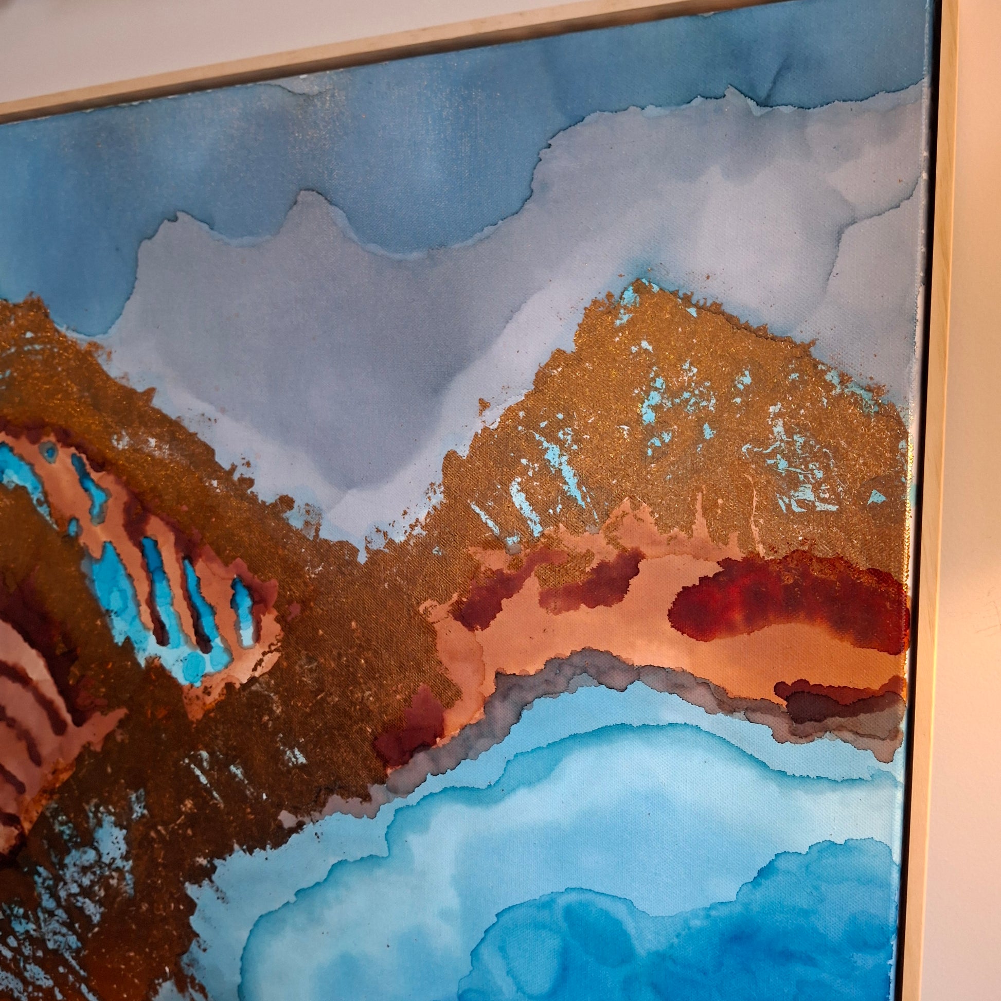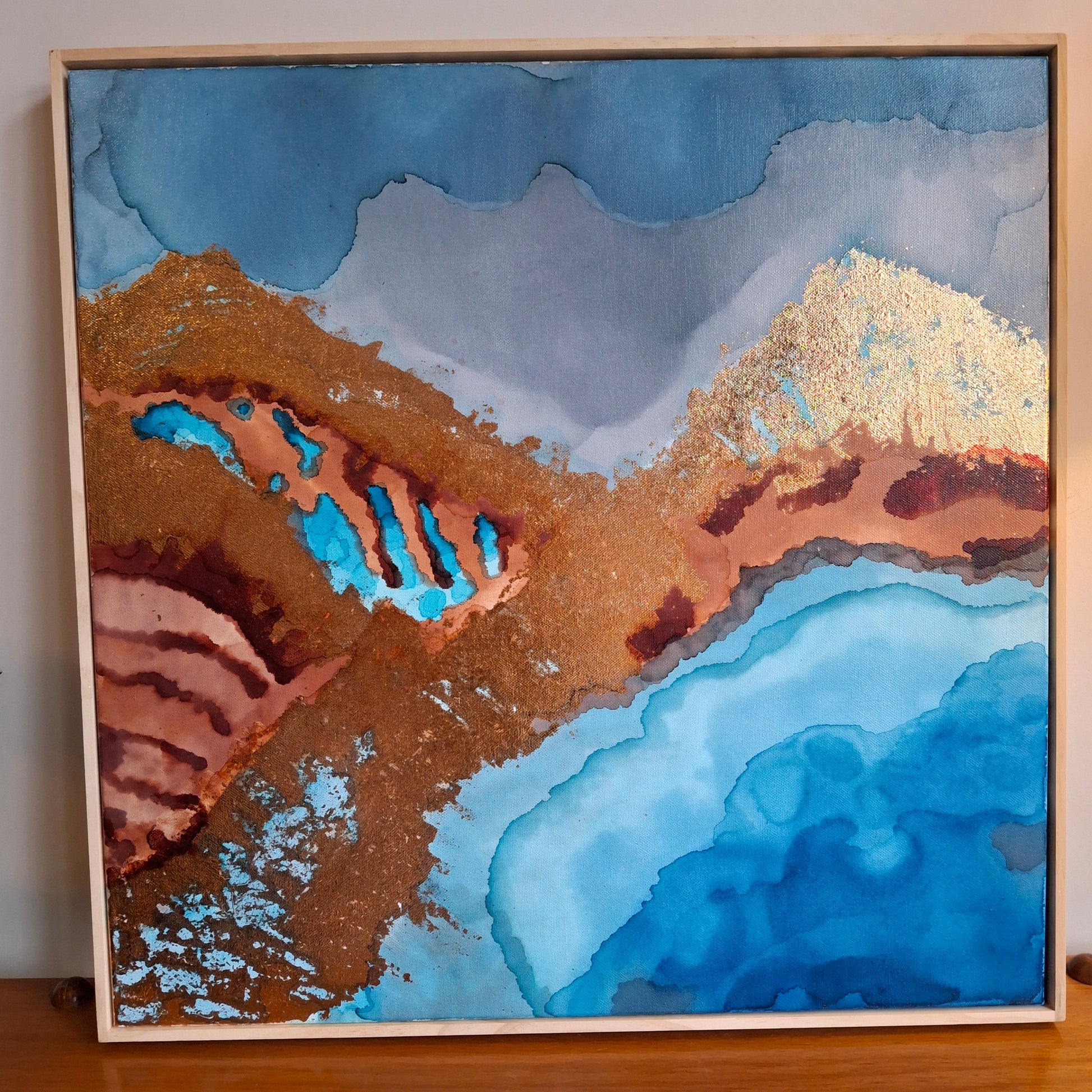 My Heart Runs Free , part of the My Country, captures the majestic beauty of New Zealand’s Southern Alps, focusing on the Alps to Ocean cycle trail journey. Using shimmering metallic foil and richly layered alcohol inks, creates a luminous landscape that shifts with the light. Bronze copper tones evoke sunlit peaks, while deep earthy reds and browns ground the composition, reflecting the rugged terrain. Moody blue accents hint at alpine skies holding snow and glacial waters, adding depth and contrast. The combination of textured foil and fluid ink creates a sense of movement and vitality, celebrating the dramatic, awe-inspiring forms of the mountains in a contemporary, abstract style.