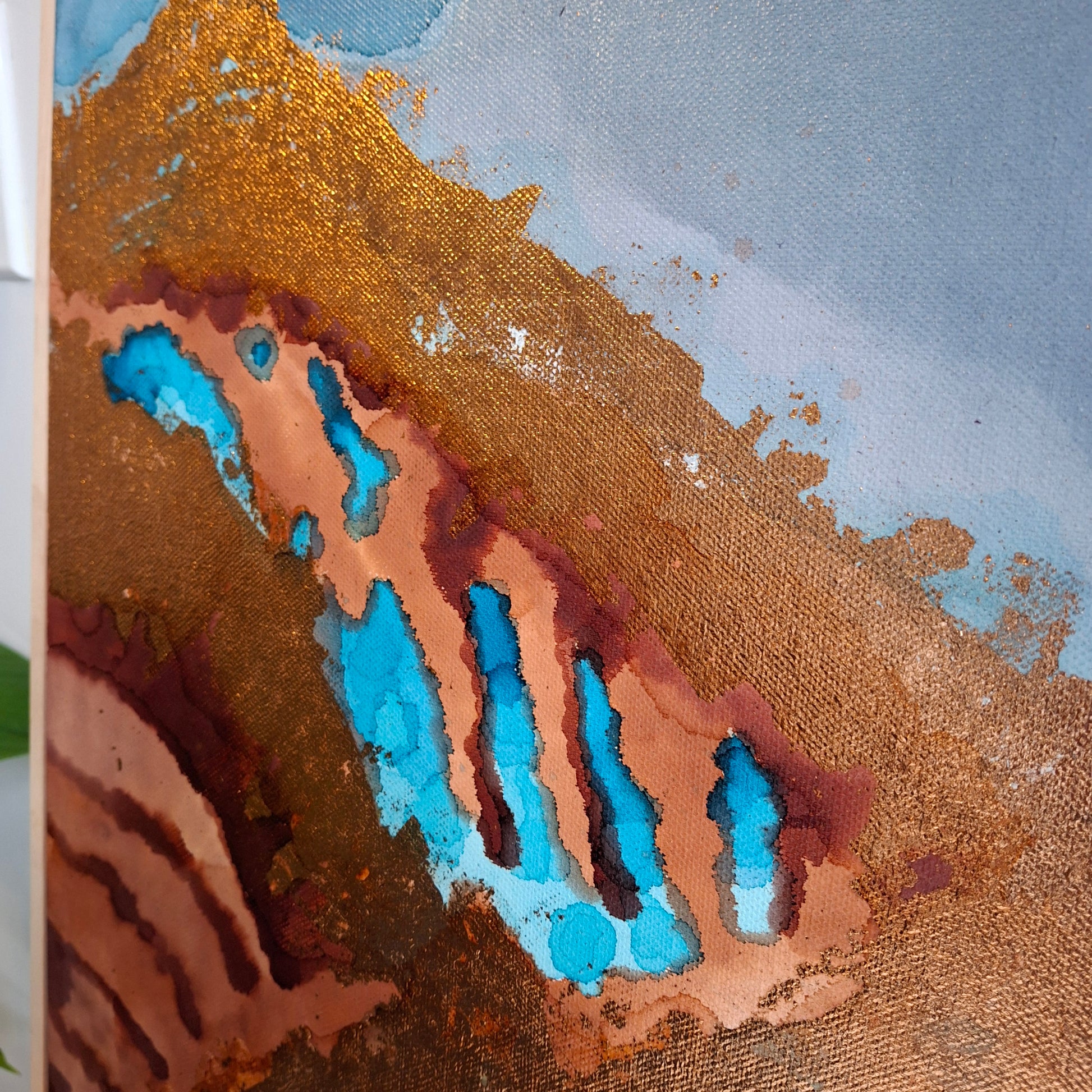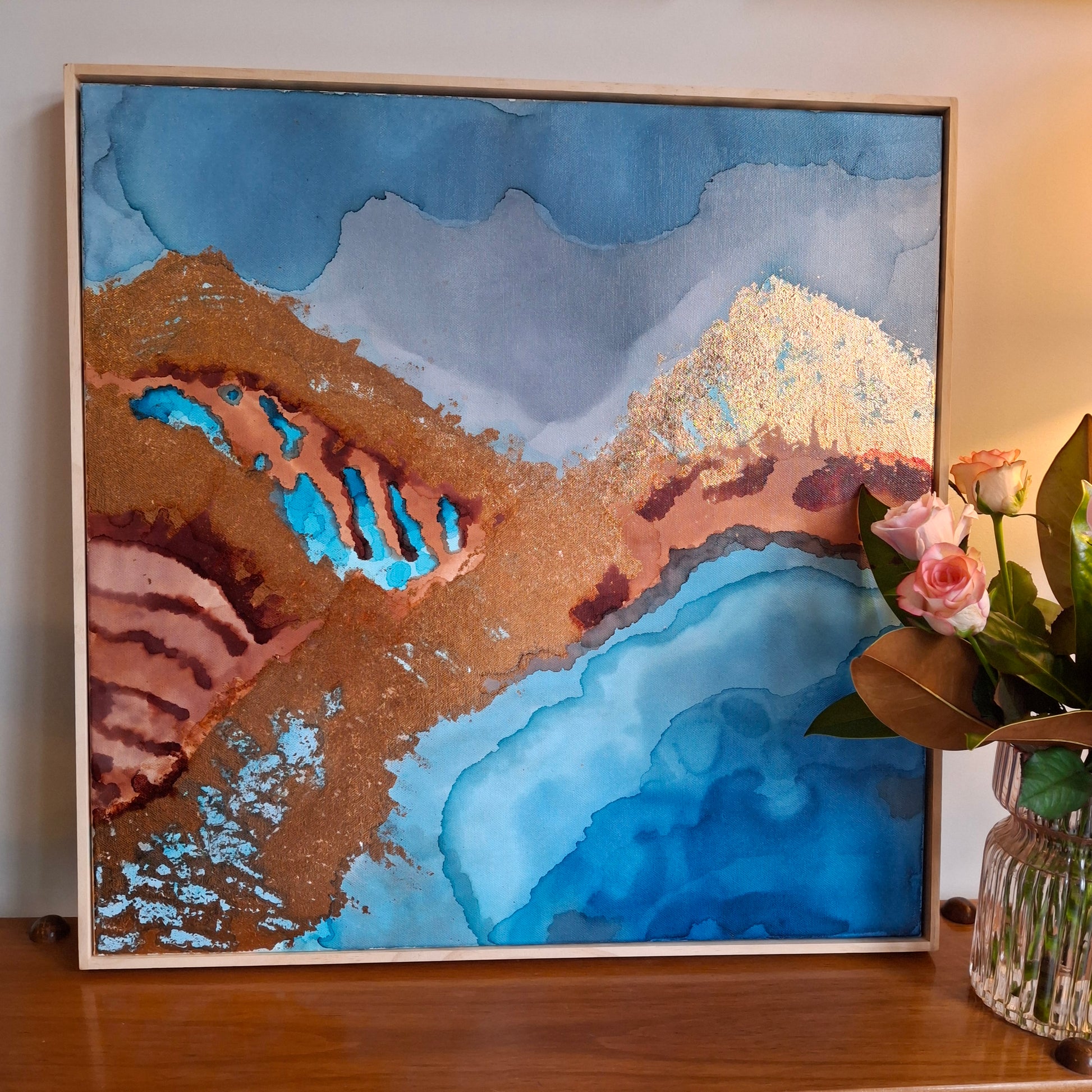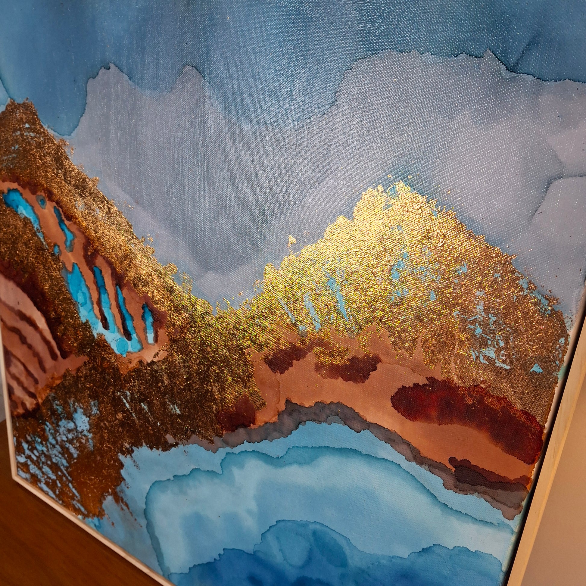 My Heart Runs Free , part of the My Country, captures the majestic beauty of New Zealand’s Southern Alps, focusing on the Alps to Ocean cycle trail journey. Using shimmering metallic foil and richly layered alcohol inks, creates a luminous landscape that shifts with the light. Bronze copper tones evoke sunlit peaks, while deep earthy reds and browns ground the composition, reflecting the rugged terrain. Moody blue accents hint at alpine skies holding snow and glacial waters, adding depth and contrast. The combination of textured foil and fluid ink creates a sense of movement and vitality, celebrating the dramatic, awe-inspiring forms of the mountains in a contemporary, abstract style.