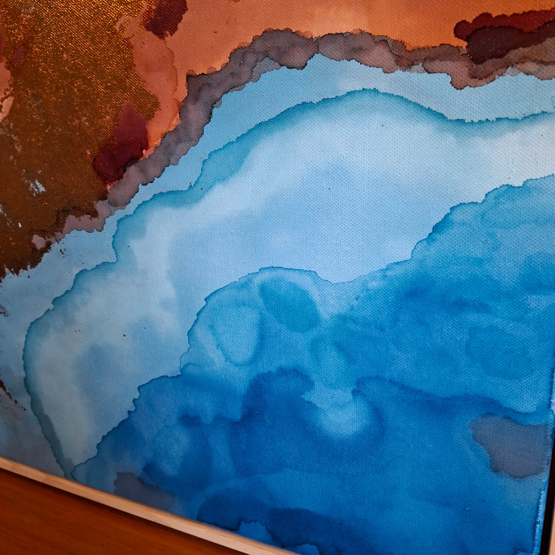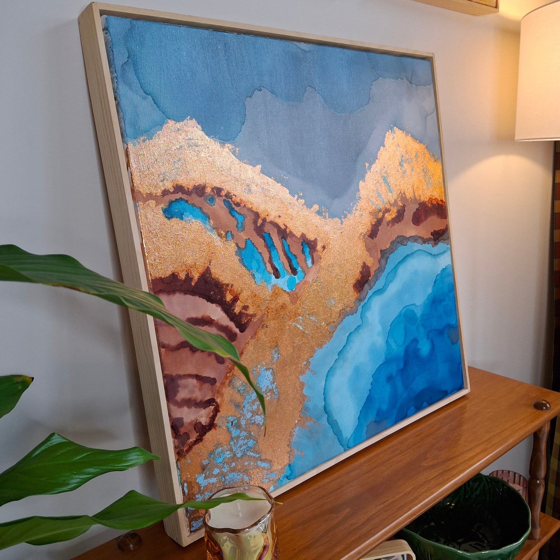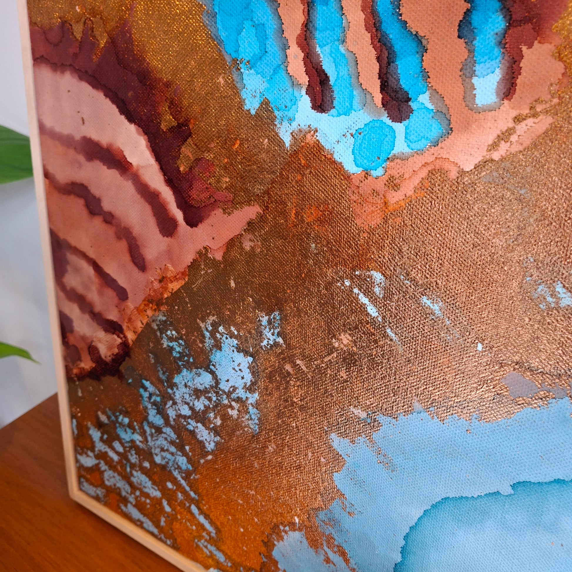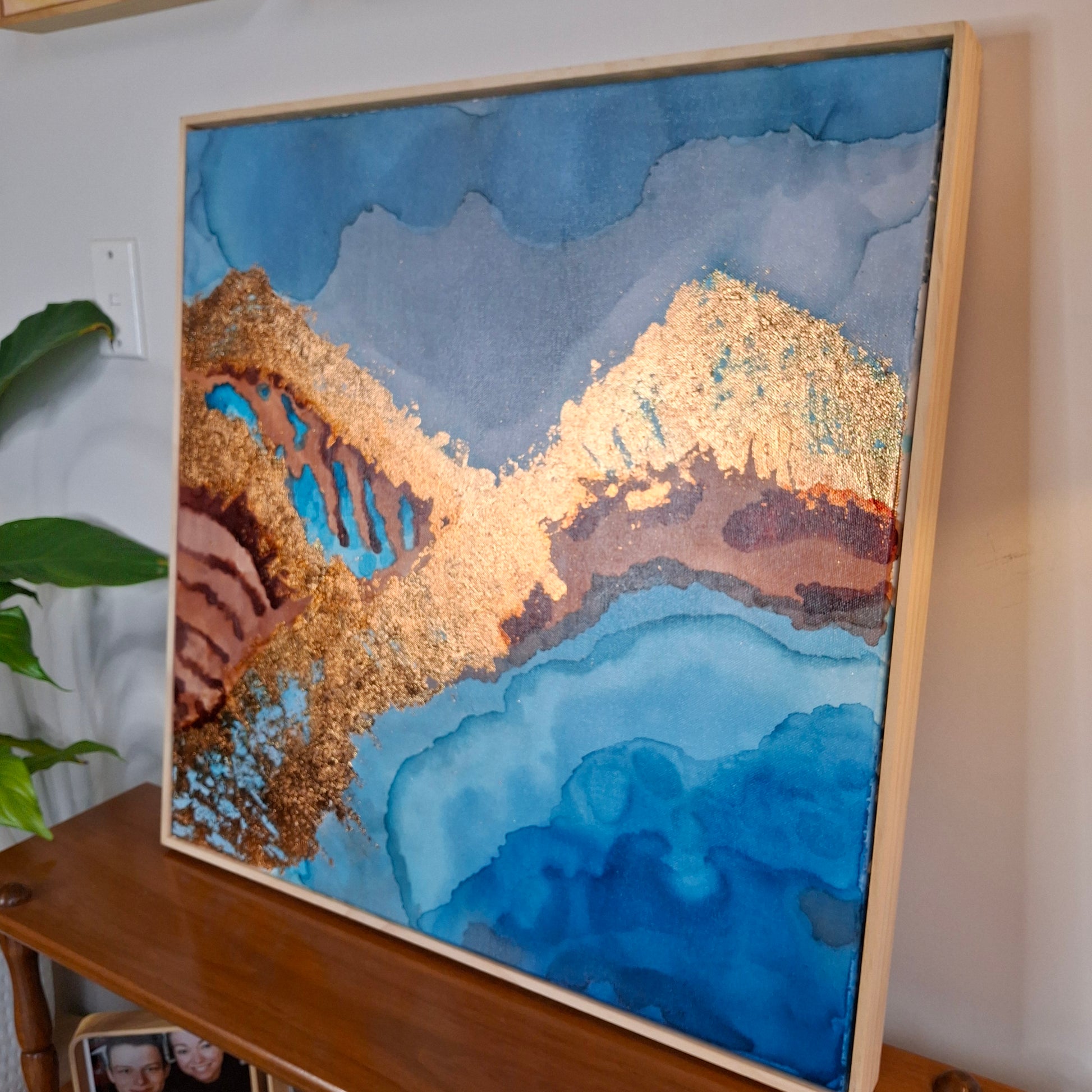 My Heart Runs Free , part of the My Country, captures the majestic beauty of New Zealand’s Southern Alps, focusing on the Alps to Ocean cycle trail journey. Using shimmering metallic foil and richly layered alcohol inks, creates a luminous landscape that shifts with the light. Bronze copper tones evoke sunlit peaks, while deep earthy reds and browns ground the composition, reflecting the rugged terrain. Moody blue accents hint at alpine skies holding snow and glacial waters, adding depth and contrast. The combination of textured foil and fluid ink creates a sense of movement and vitality, celebrating the dramatic, awe-inspiring forms of the mountains in a contemporary, abstract style.