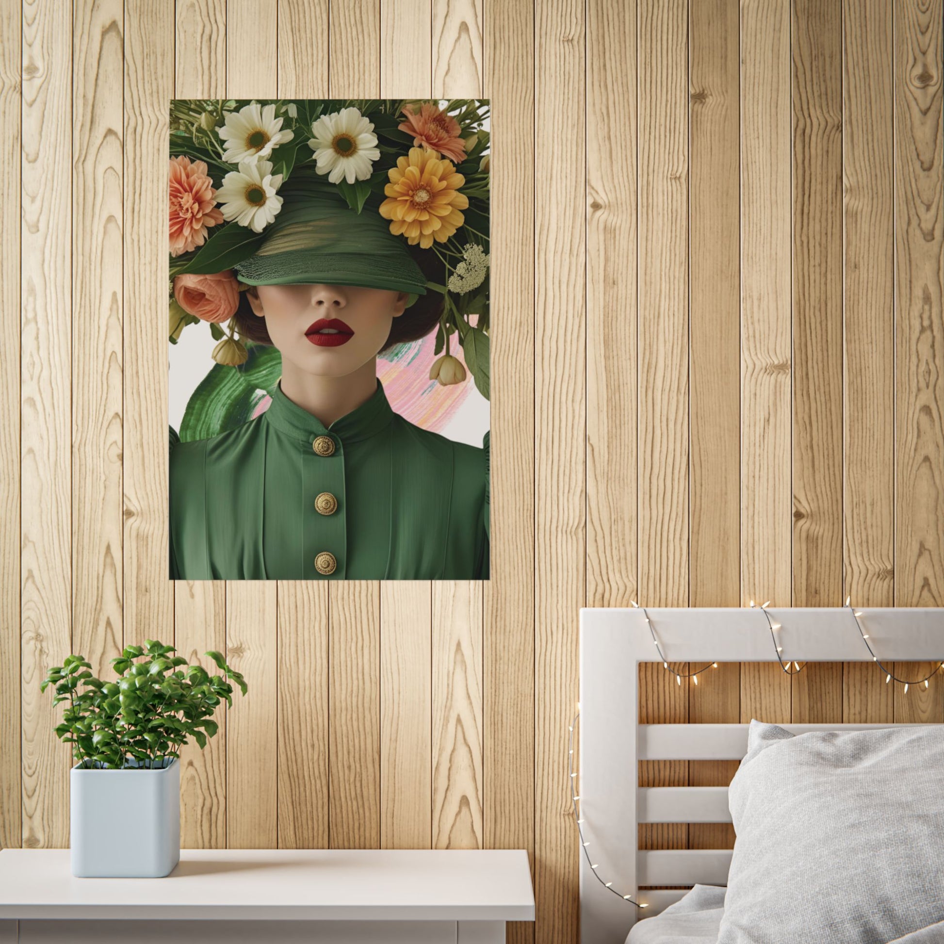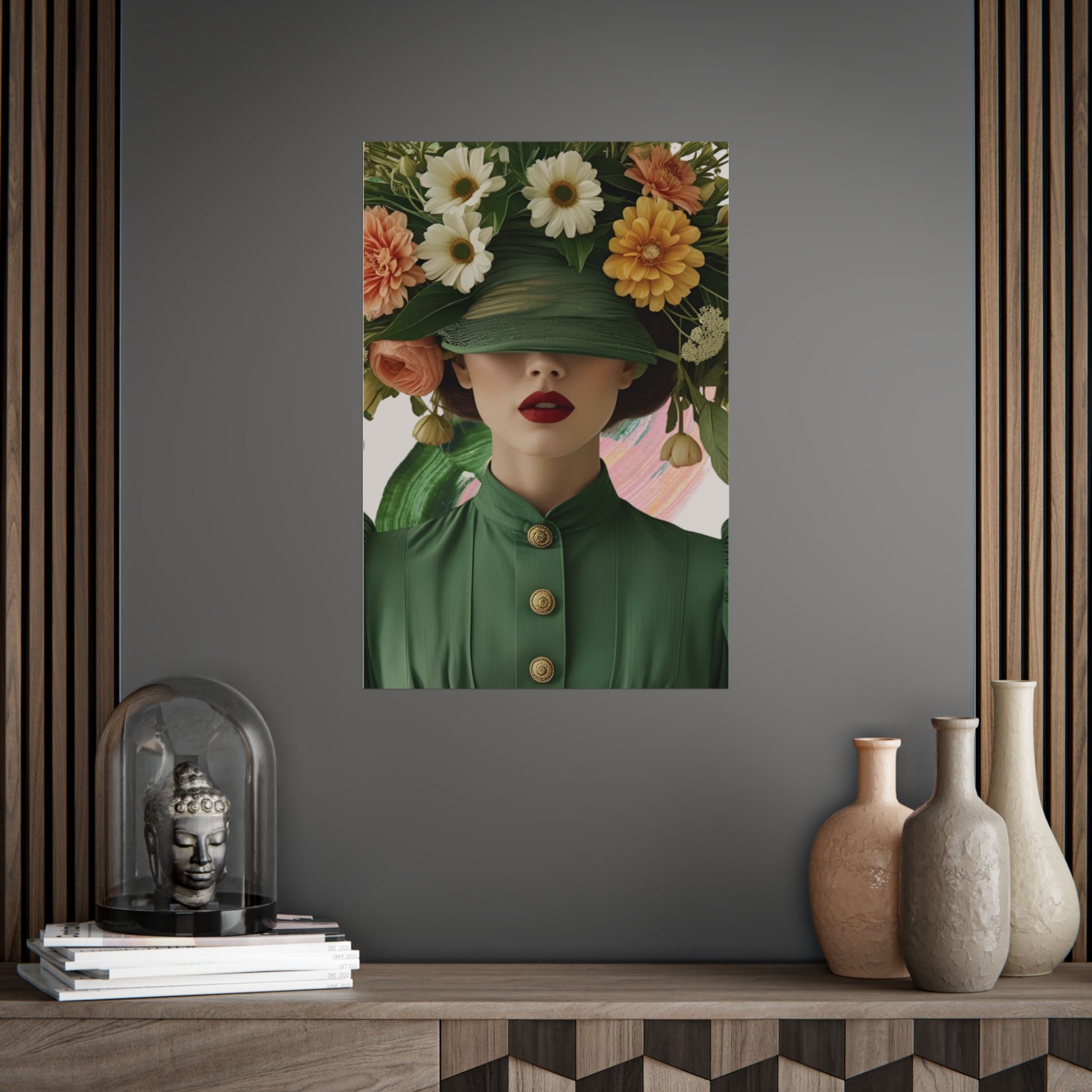 Elizabeth is a captivating art poster that fuses timeless fashion with the poetry of nature. A woman dressed in vintage green, her eyes hidden, becomes a vision of mystery and strength. Adorned in an arrangement of vibrant blooms, framing her with softness and vitality. Bold red lips provide a dramatic contrast, symbolizing passion and confidence. This piece evokes both vintage elegance and modern flair, offering a statement of grace and individuality. Elizabeth brings beauty, power, and botanical romance into any space, making it a striking centerpiece for contemporary interiors. Part of the Lily and Friends series.