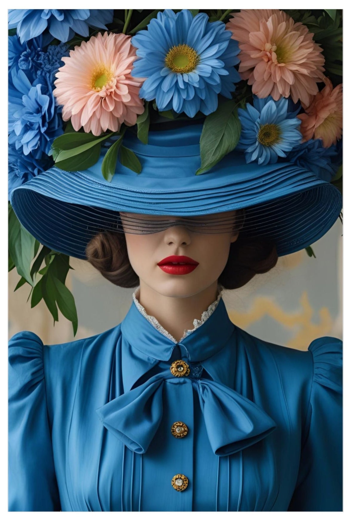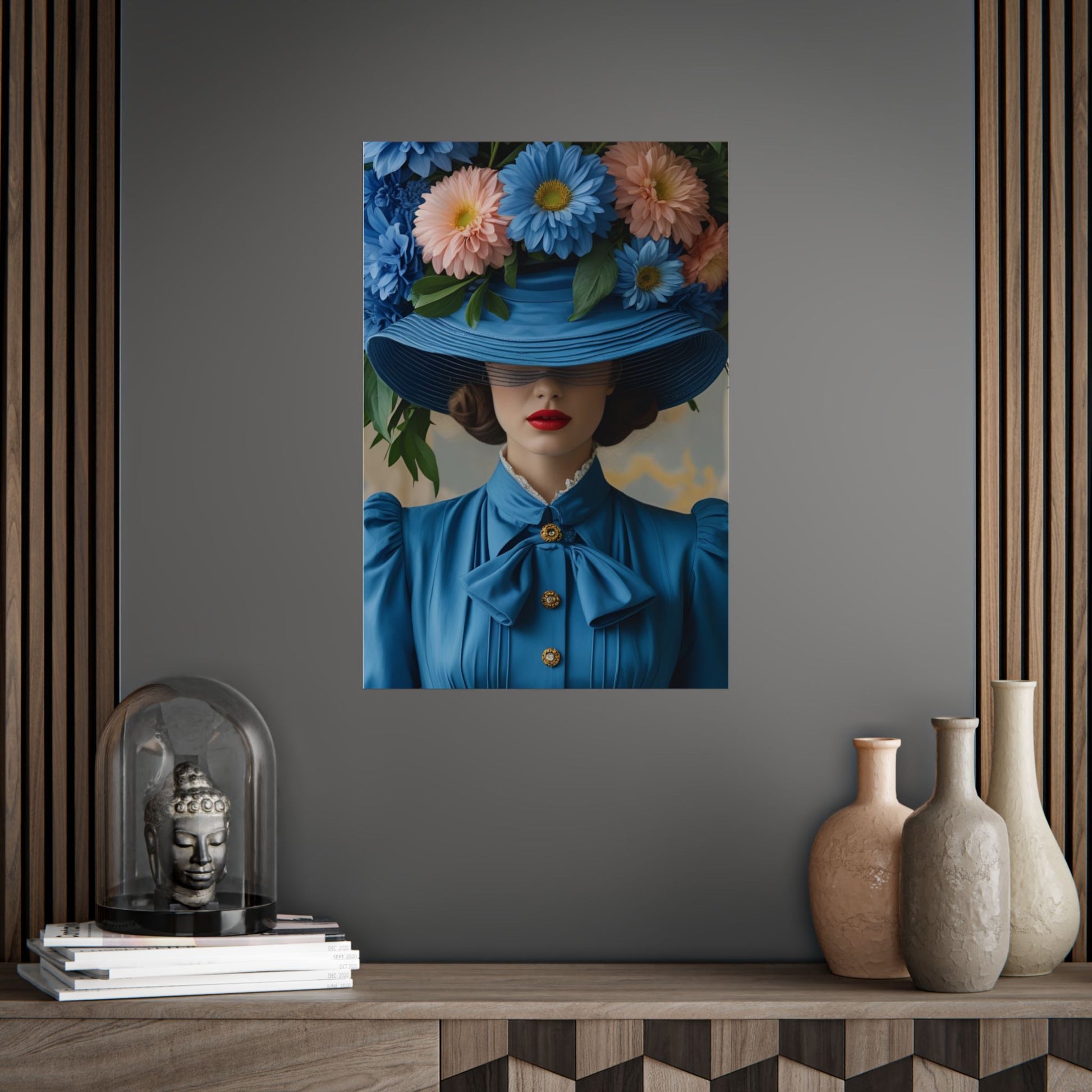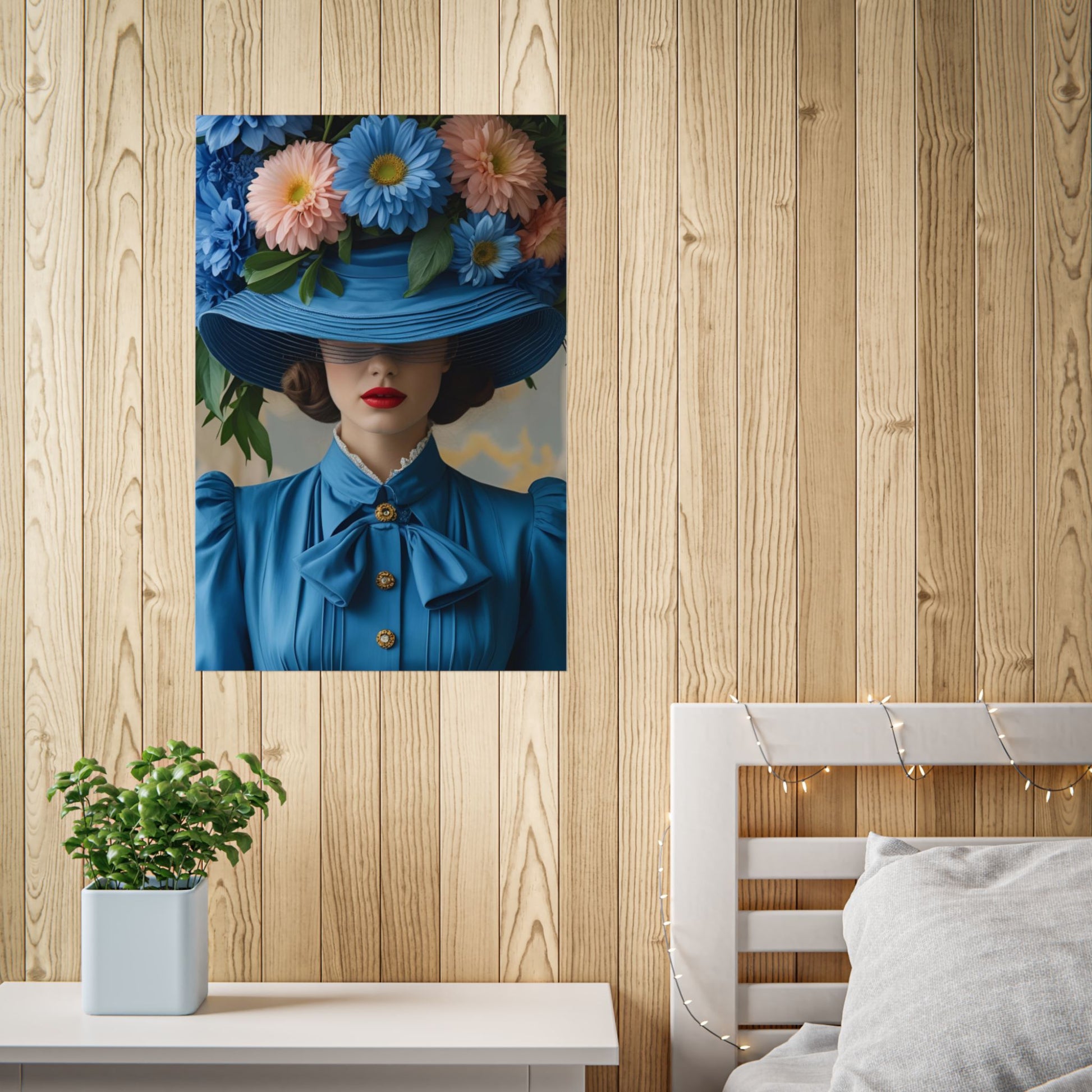 The Ella art print captures timeless elegance in a bold display of colour and poise. Dressed in a vivid cerulean blue ensemble with golden detailing, Ella’s striking presence is elevated by her wide-brimmed hat adorned with soft peach and azure blooms. Her red lips hint at quiet confidence, while the cascading florals embody grace and vitality. A piece that speaks of sophistication, restraint, and the beauty of balance—perfect for interiors that call for refinement with a touch of drama.