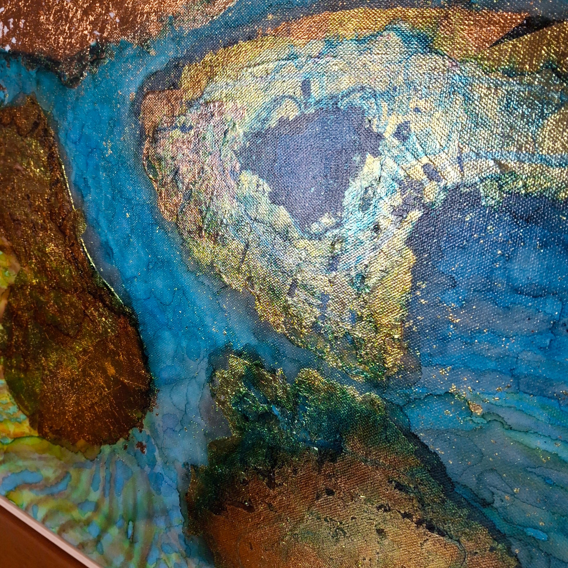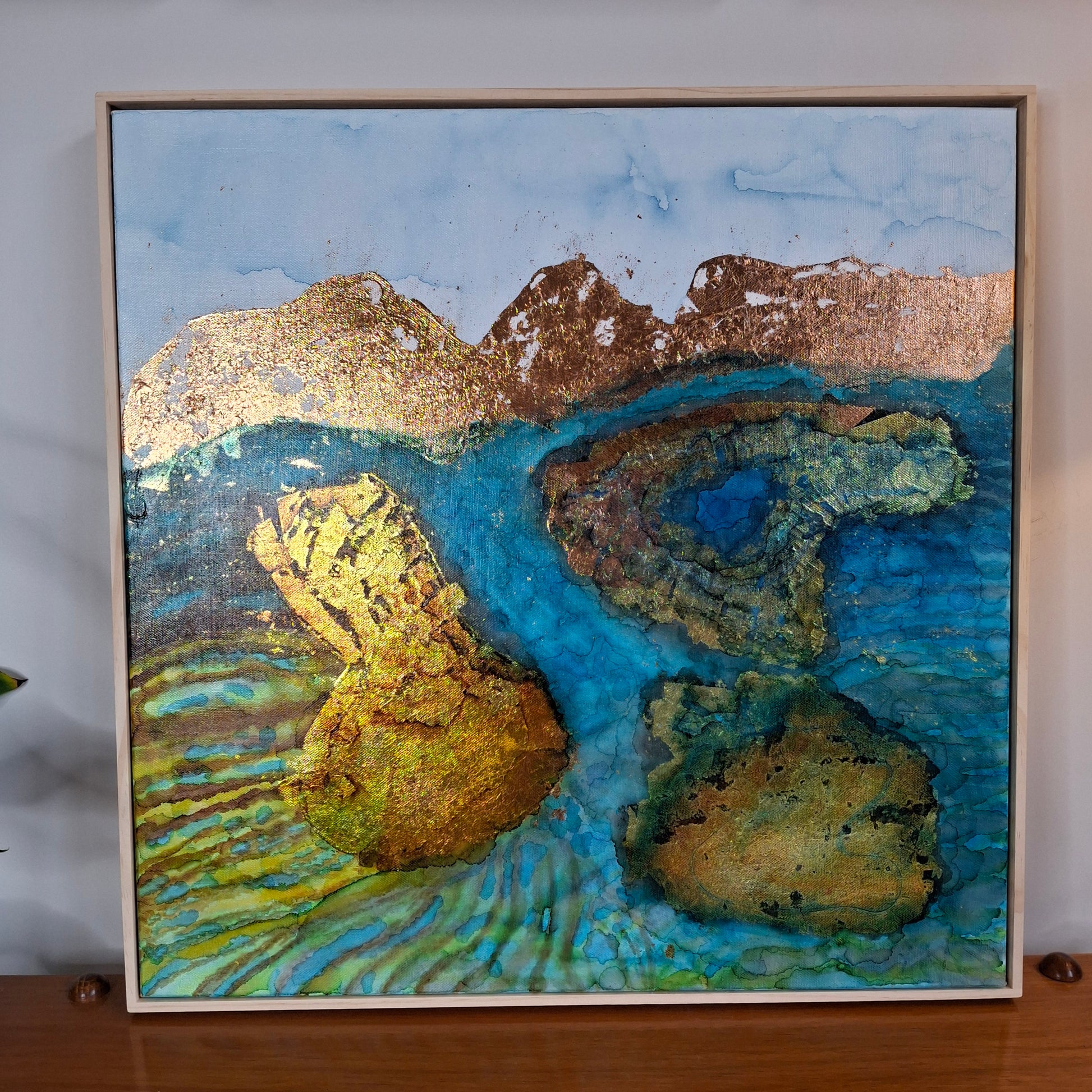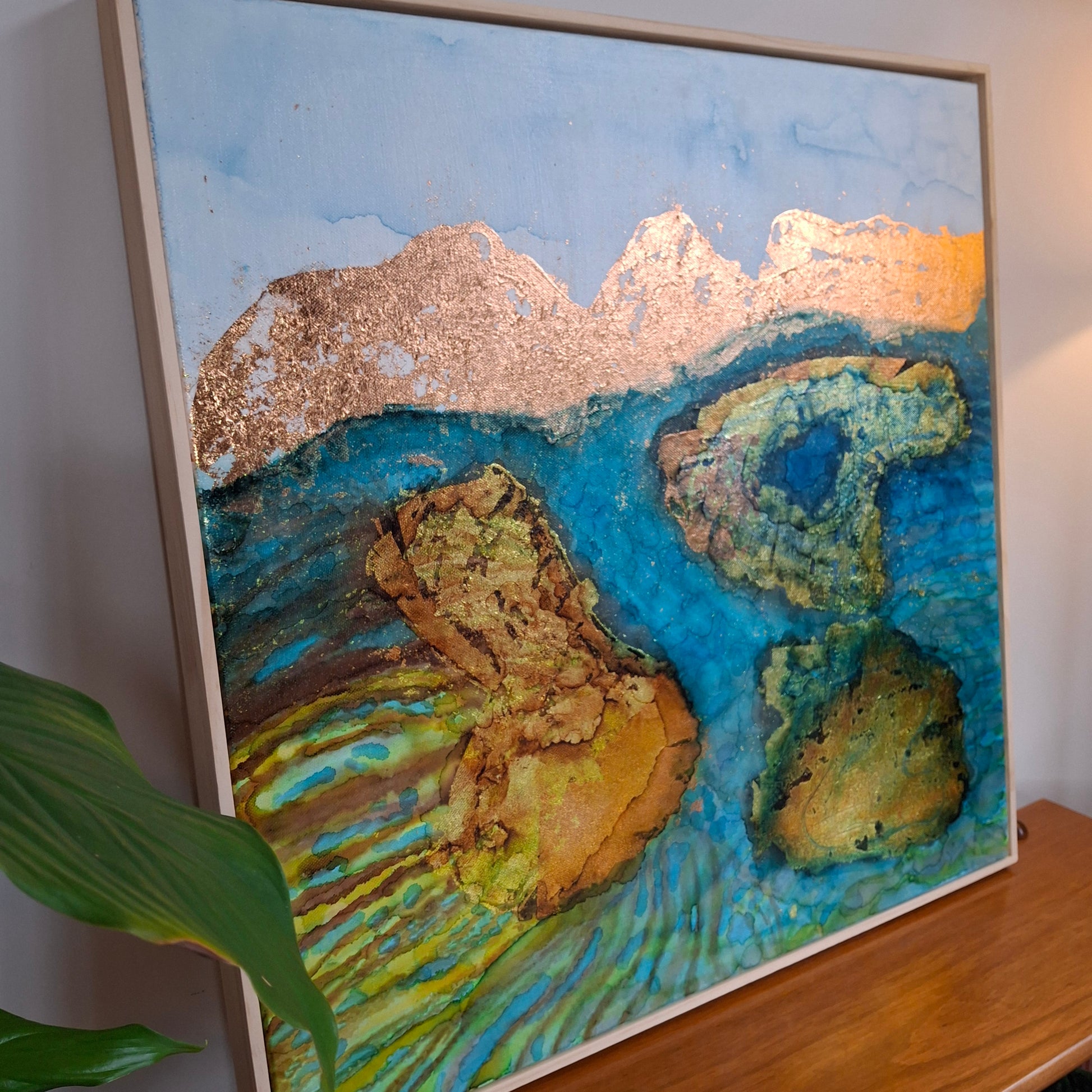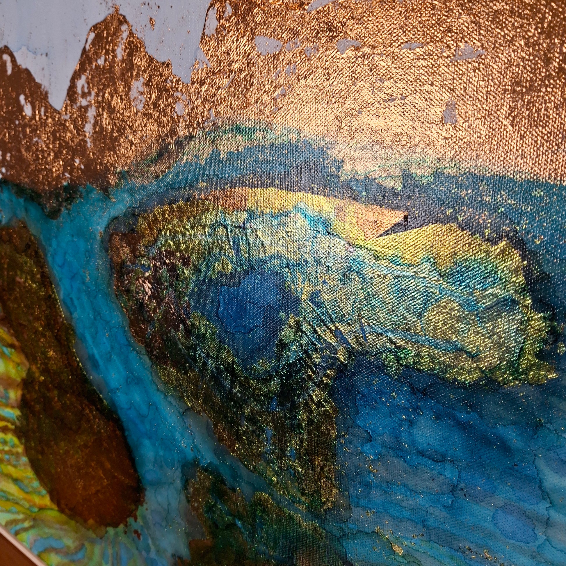 Alps to Ocean by Elizabeth Marshall traces the awe-inspiring path from New Zealand’s Southern Alps to the famous Moeraki Boulders. Created with metallic foils and alcohol inks, this piece is part of the My Country series. Shimmering bronze peaks rise against a soft sky, flowing into deep turquoise rivers and finally the sea, where the rounded boulders rest in timeless stillness. Light dances across the textured surface, echoing the movement of water and the play of sun on rock. This work celebrates the grandeur, vitality, and enduring beauty of Aotearoa’s landscapes, from mountain heights to ocean’s edge.