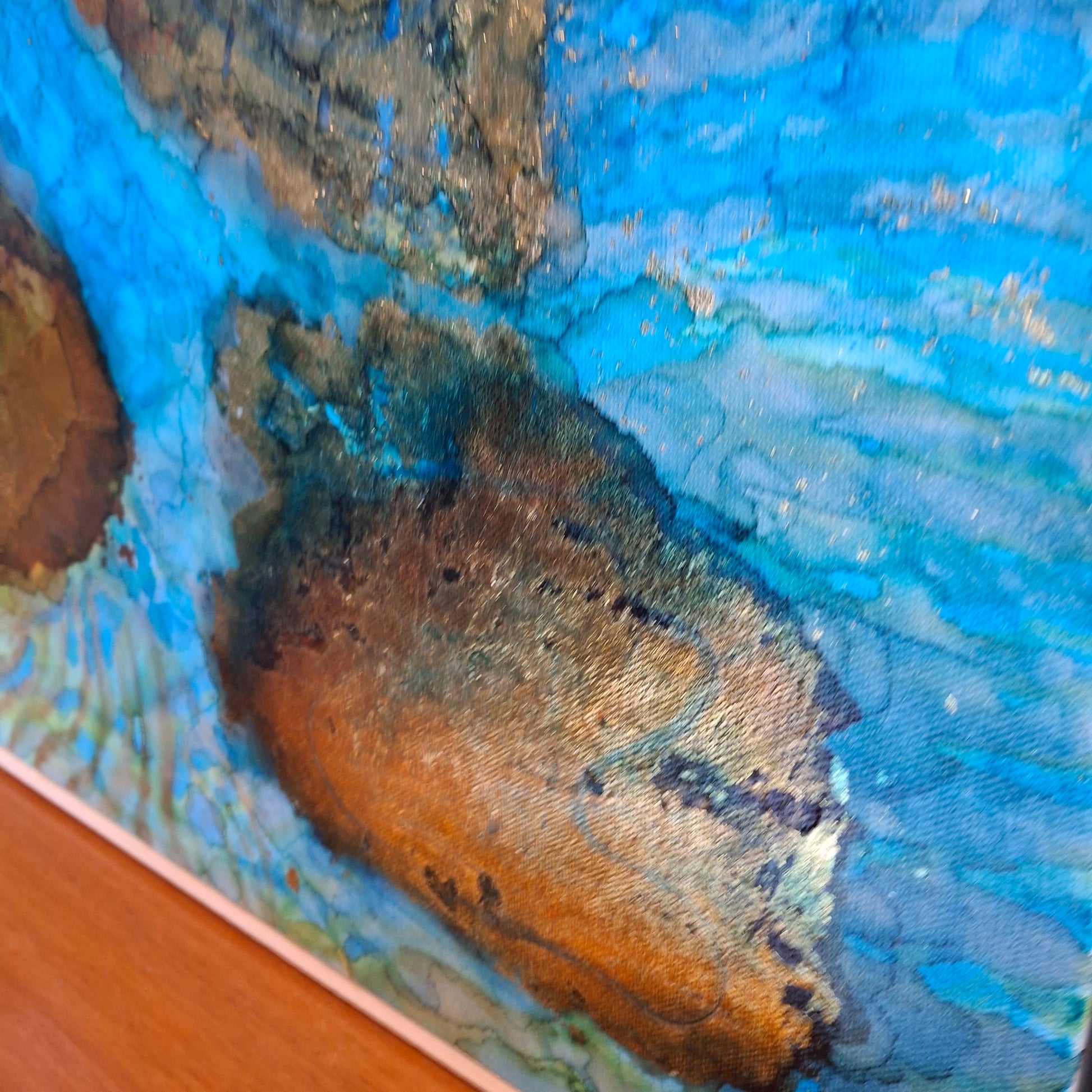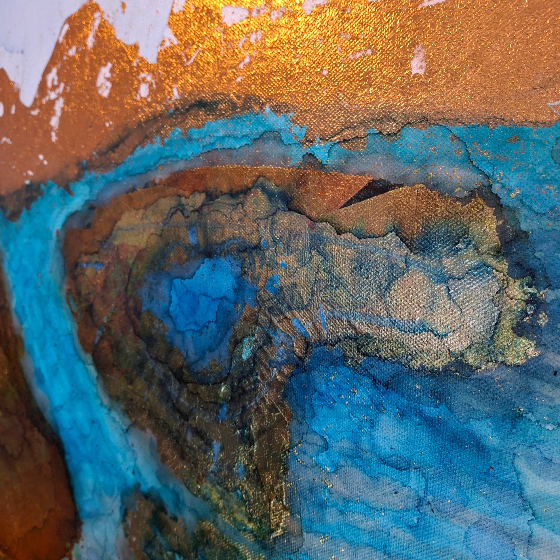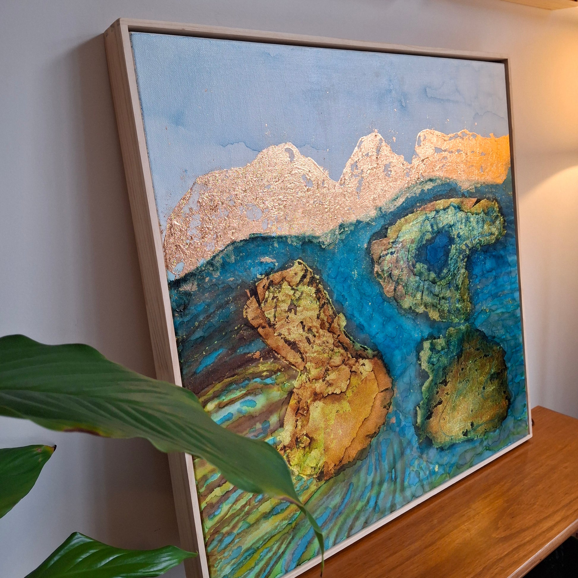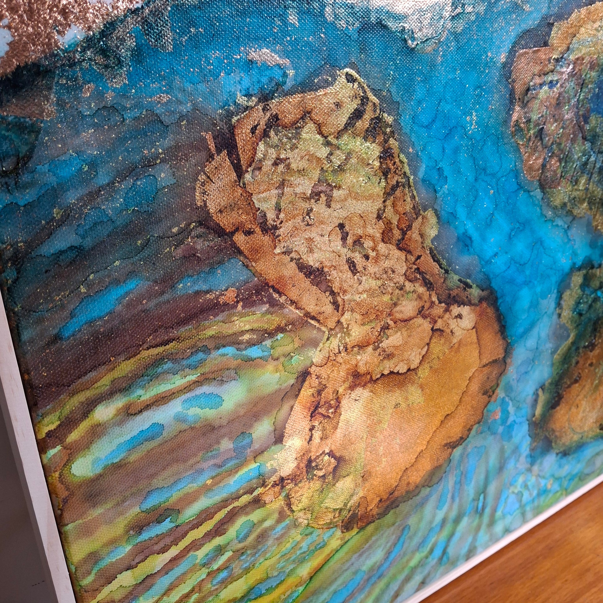 Alps to Ocean by Elizabeth Marshall traces the awe-inspiring path from New Zealand’s Southern Alps to the famous Moeraki Boulders. Created with metallic foils and alcohol inks, this piece is part of the My Country series. Shimmering bronze peaks rise against a soft sky, flowing into deep turquoise rivers and finally the sea, where the rounded boulders rest in timeless stillness. Light dances across the textured surface, echoing the movement of water and the play of sun on rock. This work celebrates the grandeur, vitality, and enduring beauty of Aotearoa’s landscapes, from mountain heights to ocean’s edge.