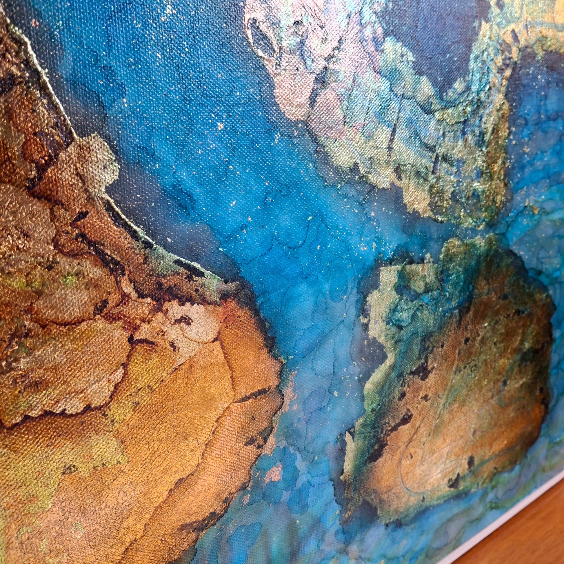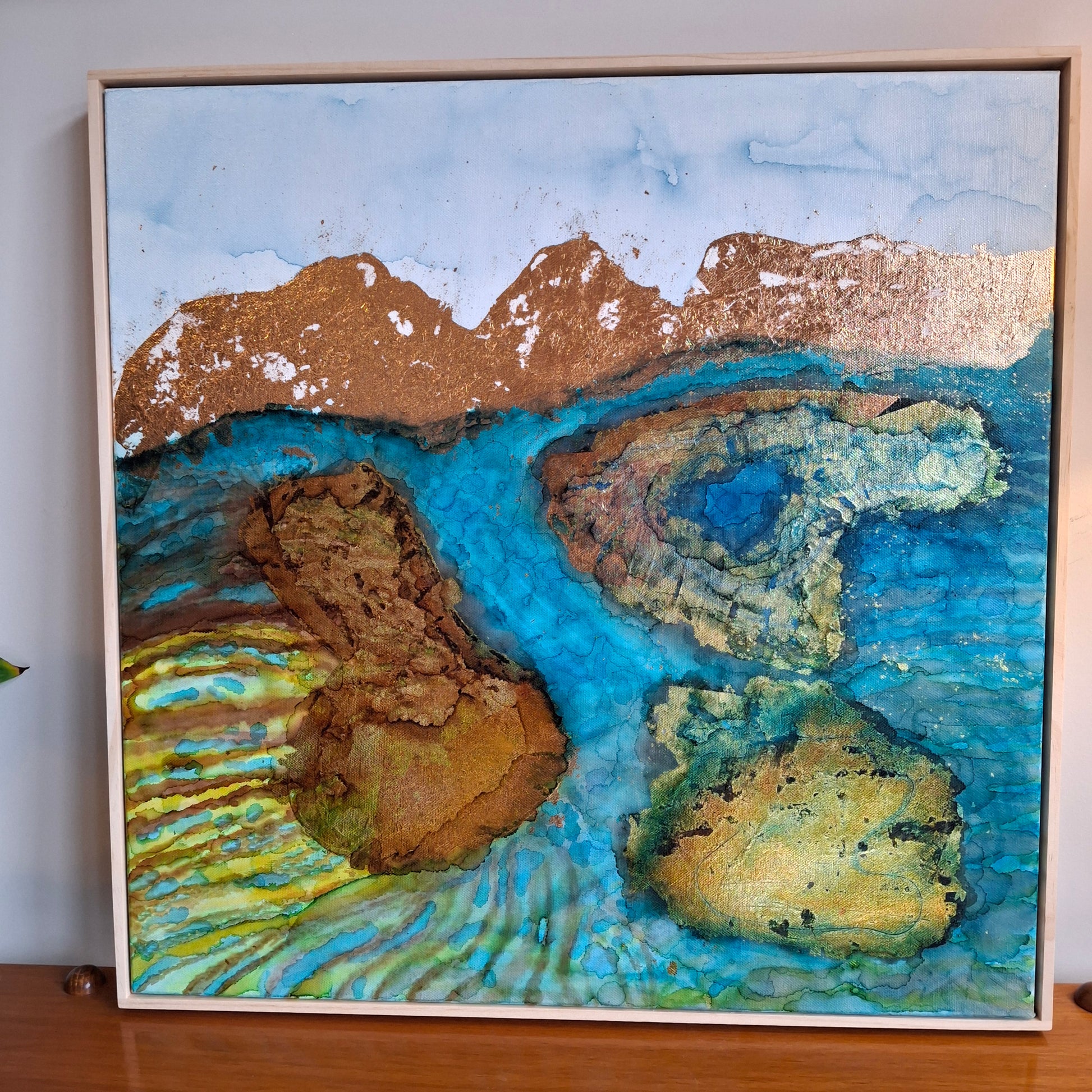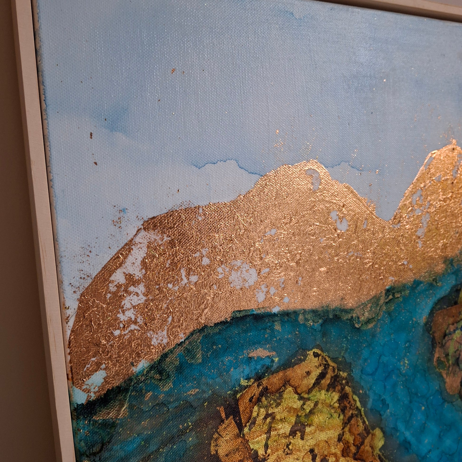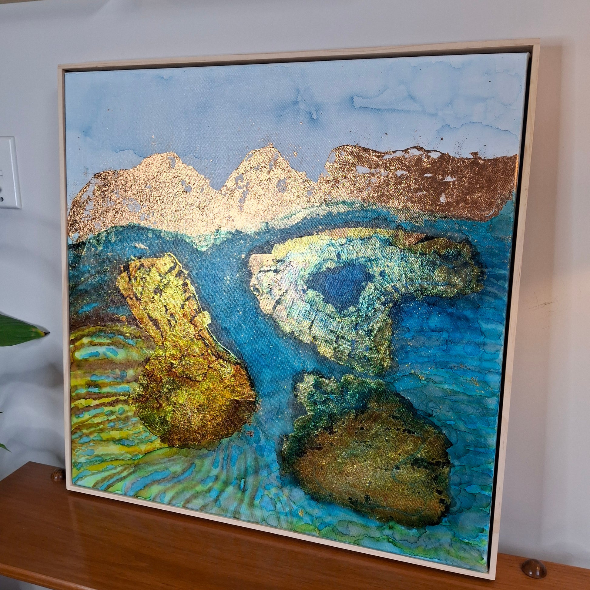 Alps to Ocean by Elizabeth Marshall traces the awe-inspiring path from New Zealand’s Southern Alps to the famous Moeraki Boulders. Created with metallic foils and alcohol inks, this piece is part of the My Country series. Shimmering bronze peaks rise against a soft sky, flowing into deep turquoise rivers and finally the sea, where the rounded boulders rest in timeless stillness. Light dances across the textured surface, echoing the movement of water and the play of sun on rock. This work celebrates the grandeur, vitality, and enduring beauty of Aotearoa’s landscapes, from mountain heights to ocean’s edge.