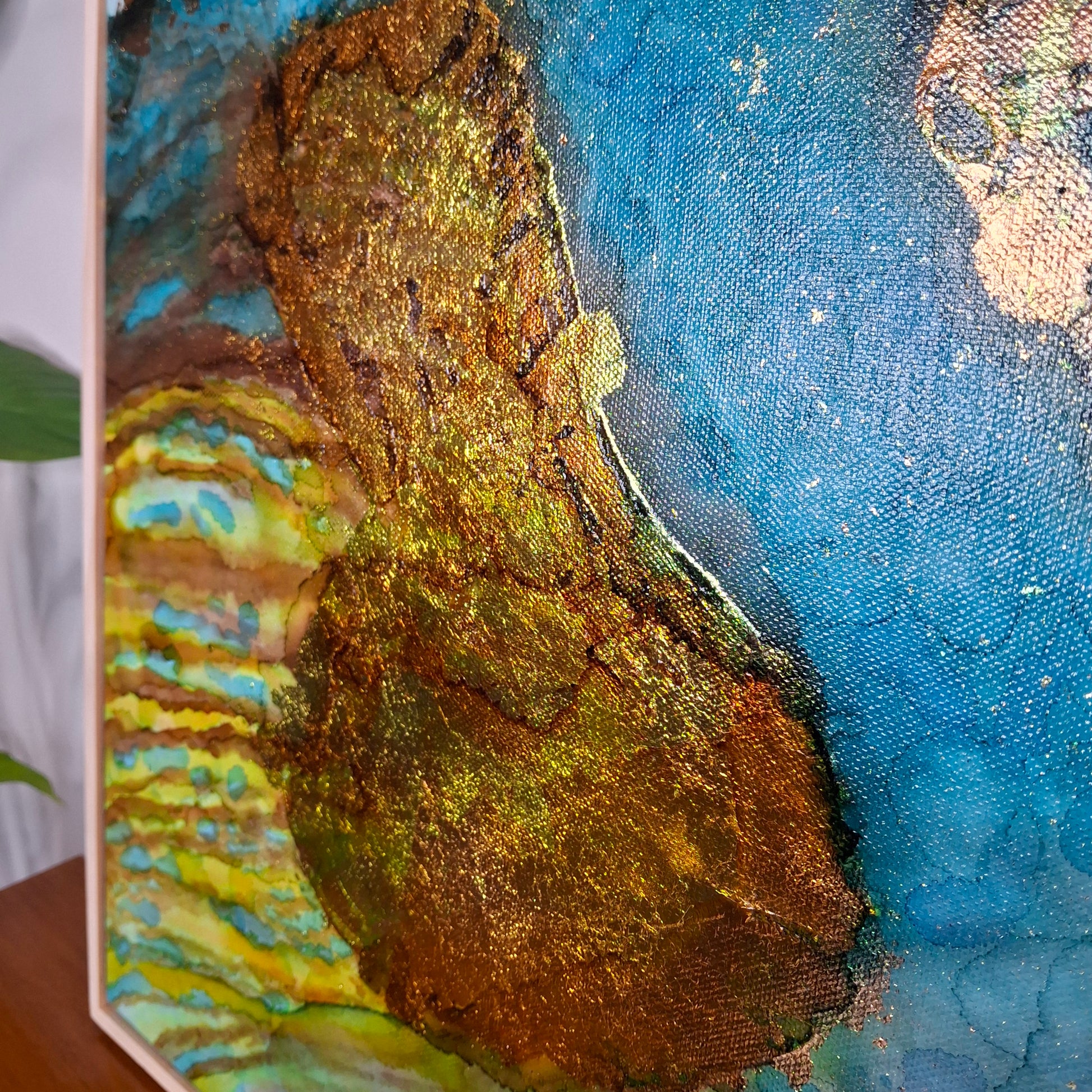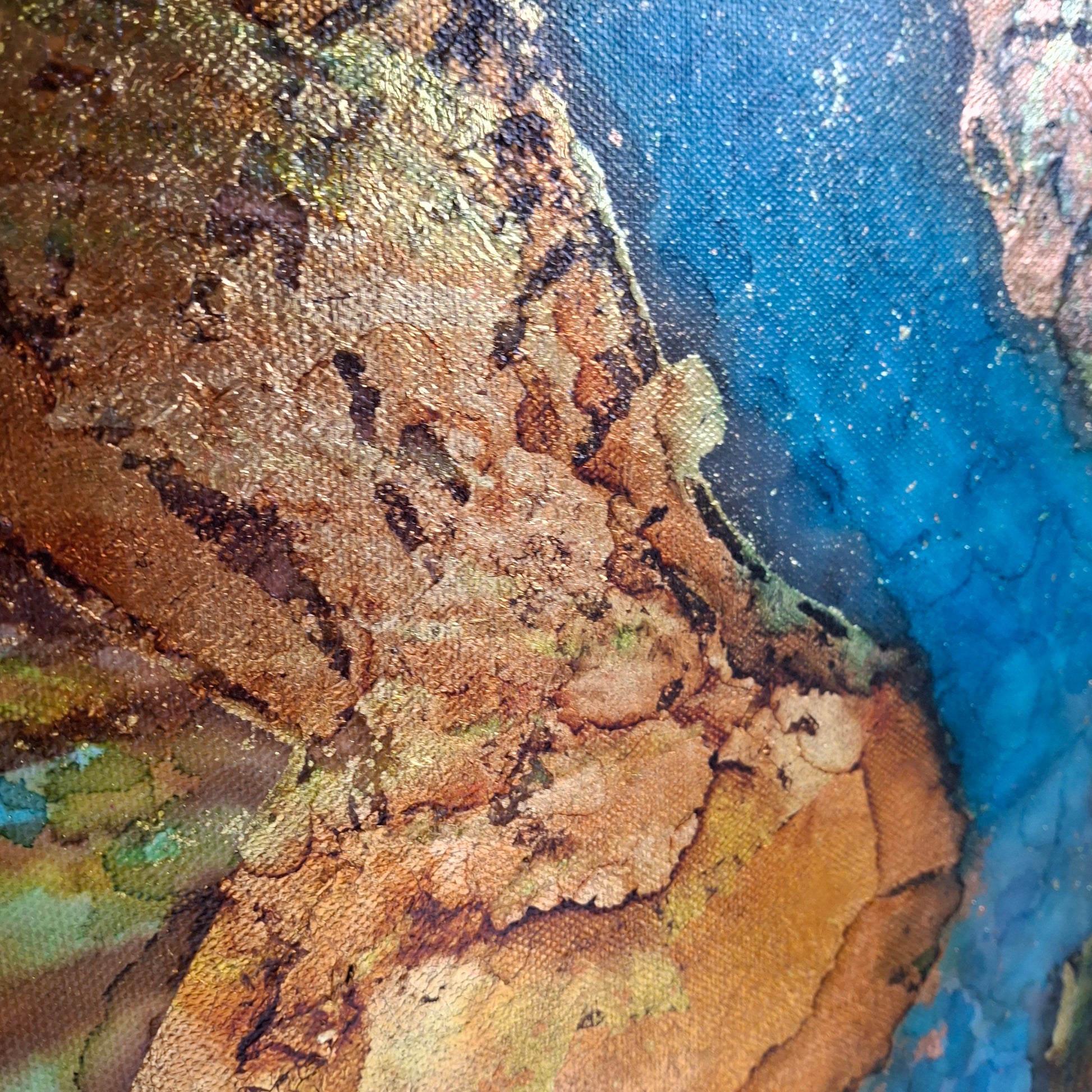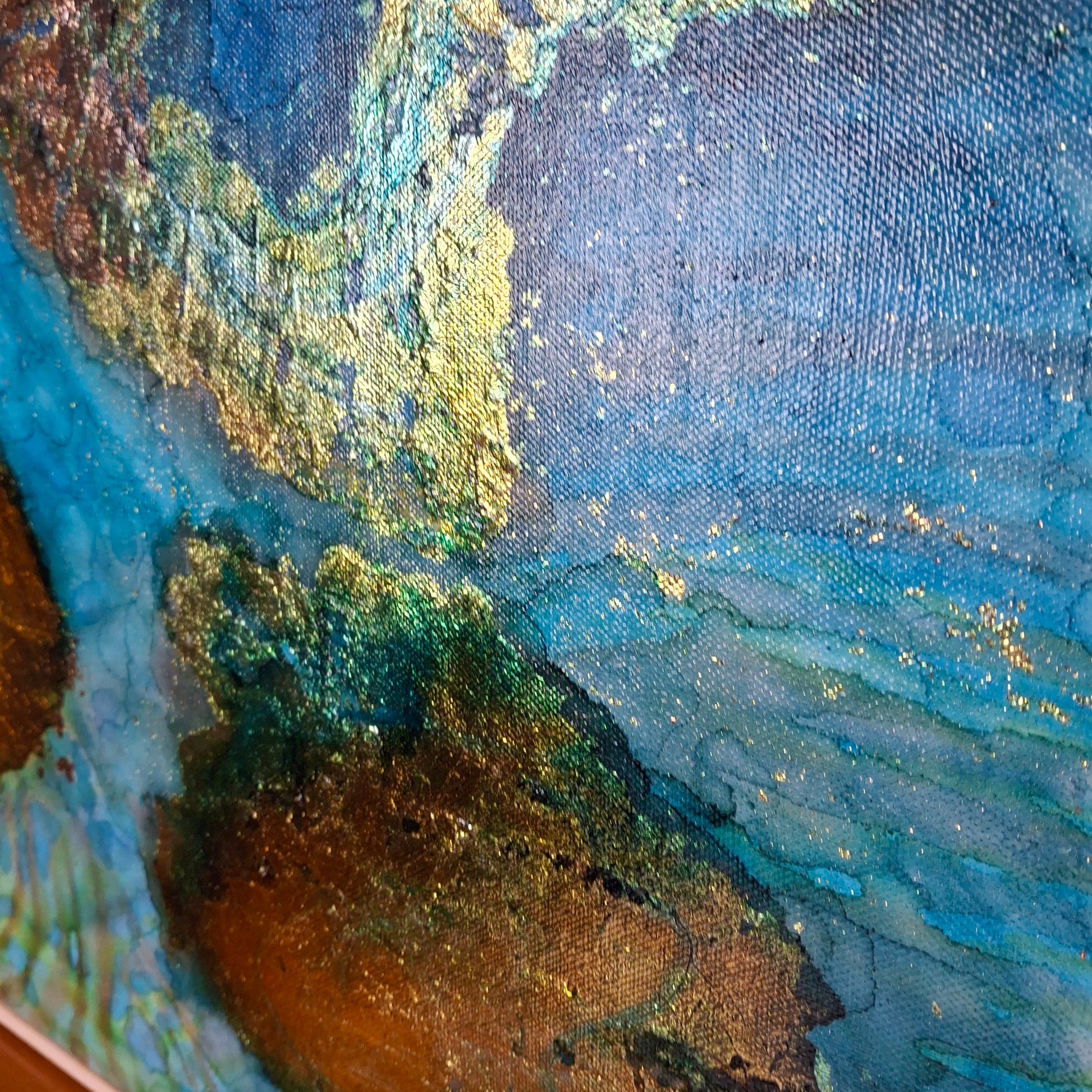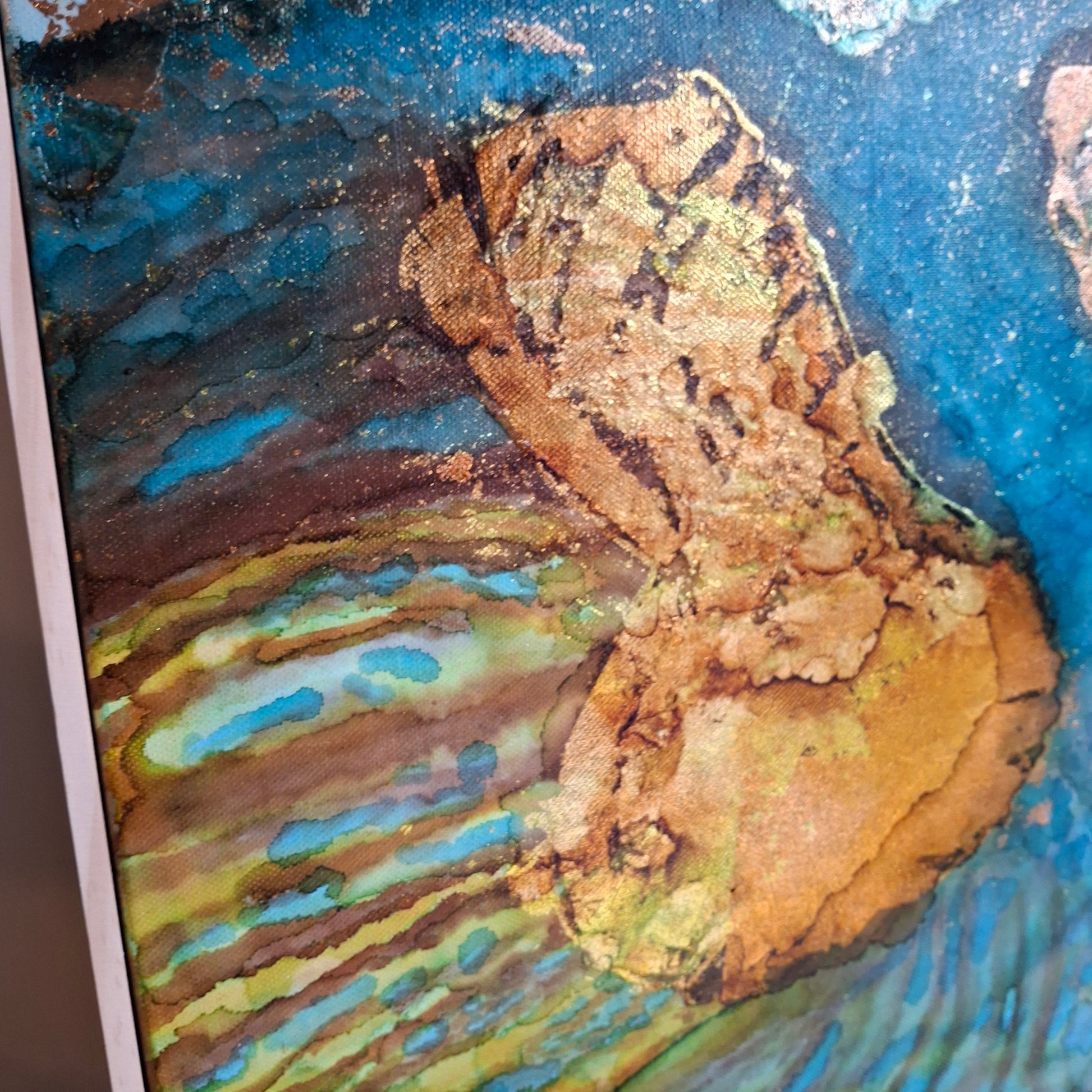 Alps to Ocean by Elizabeth Marshall traces the awe-inspiring path from New Zealand’s Southern Alps to the famous Moeraki Boulders. Created with metallic foils and alcohol inks, this piece is part of the My Country series. Shimmering bronze peaks rise against a soft sky, flowing into deep turquoise rivers and finally the sea, where the rounded boulders rest in timeless stillness. Light dances across the textured surface, echoing the movement of water and the play of sun on rock. This work celebrates the grandeur, vitality, and enduring beauty of Aotearoa’s landscapes, from mountain heights to ocean’s edge.