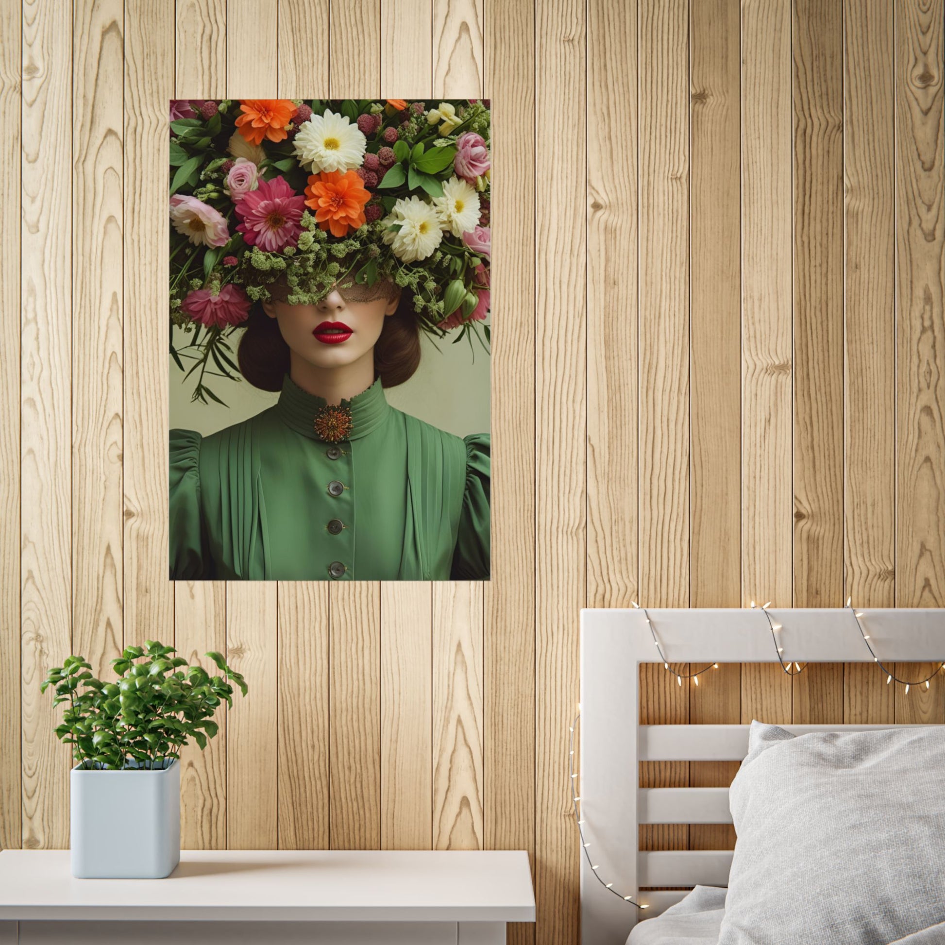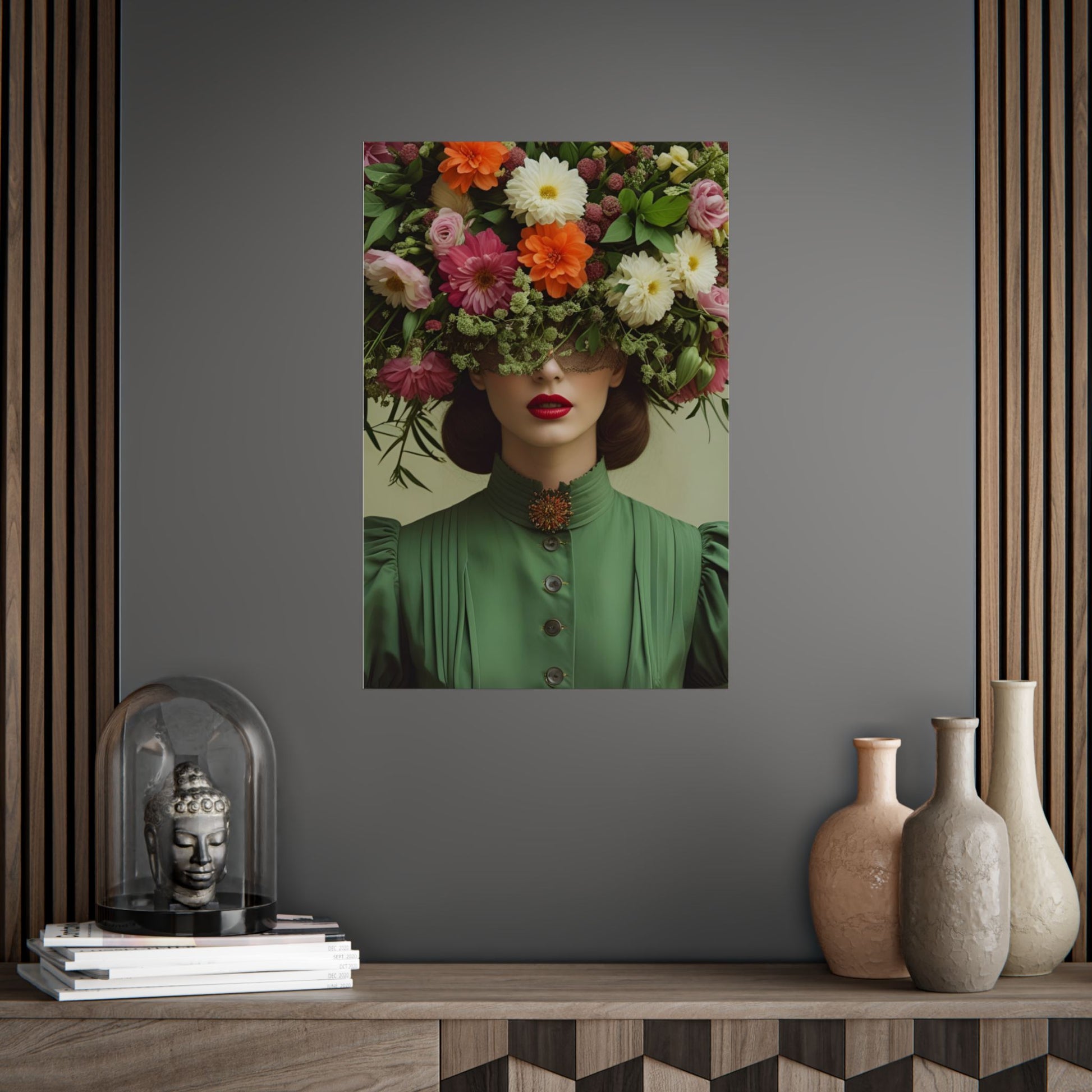 Hilary is a striking celebration of nature and elegance, where fashion meets floral artistry. The piece features a woman in a rich green, high-collared vintage-inspired dress, her poised composure contrasted by an exuberant, overflowing crown of blooms. Vibrant oranges, pinks, and creams cascade in a lush, organic arrangement, partially veiling her eyes and creating an air of mystery. Her bold red lips punctuate the composition, drawing attention to the harmony between human beauty and natural abundance. Hilary invites viewers to lose themselves in a world where florals transcend decoration and become a statement of identity and grace.