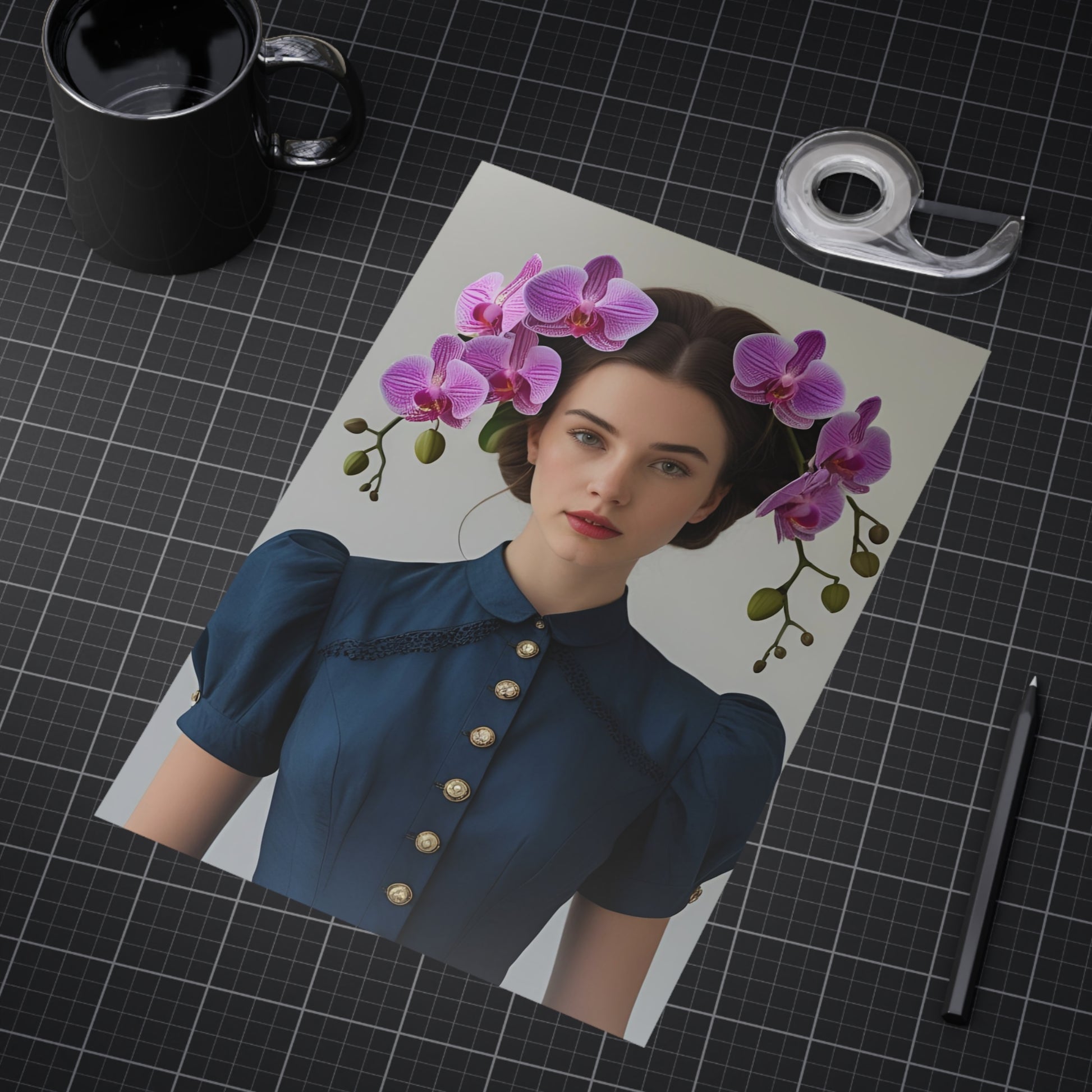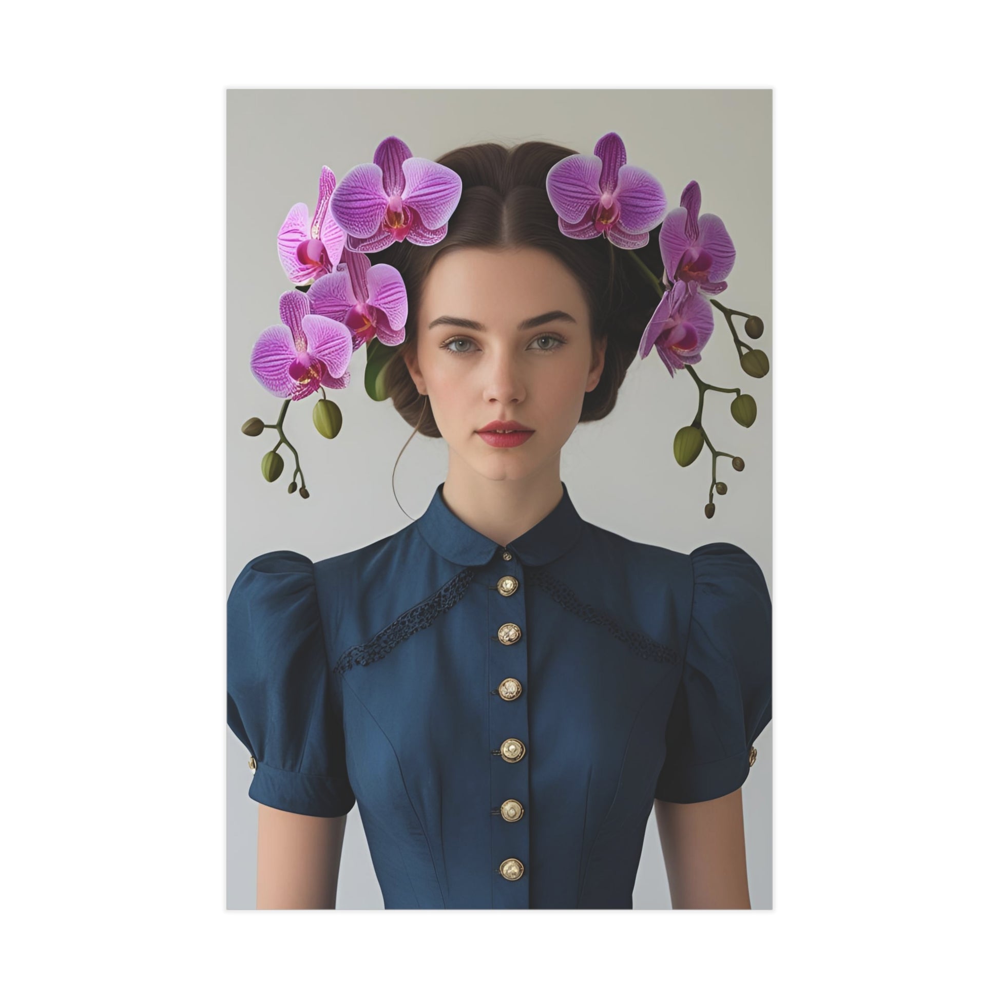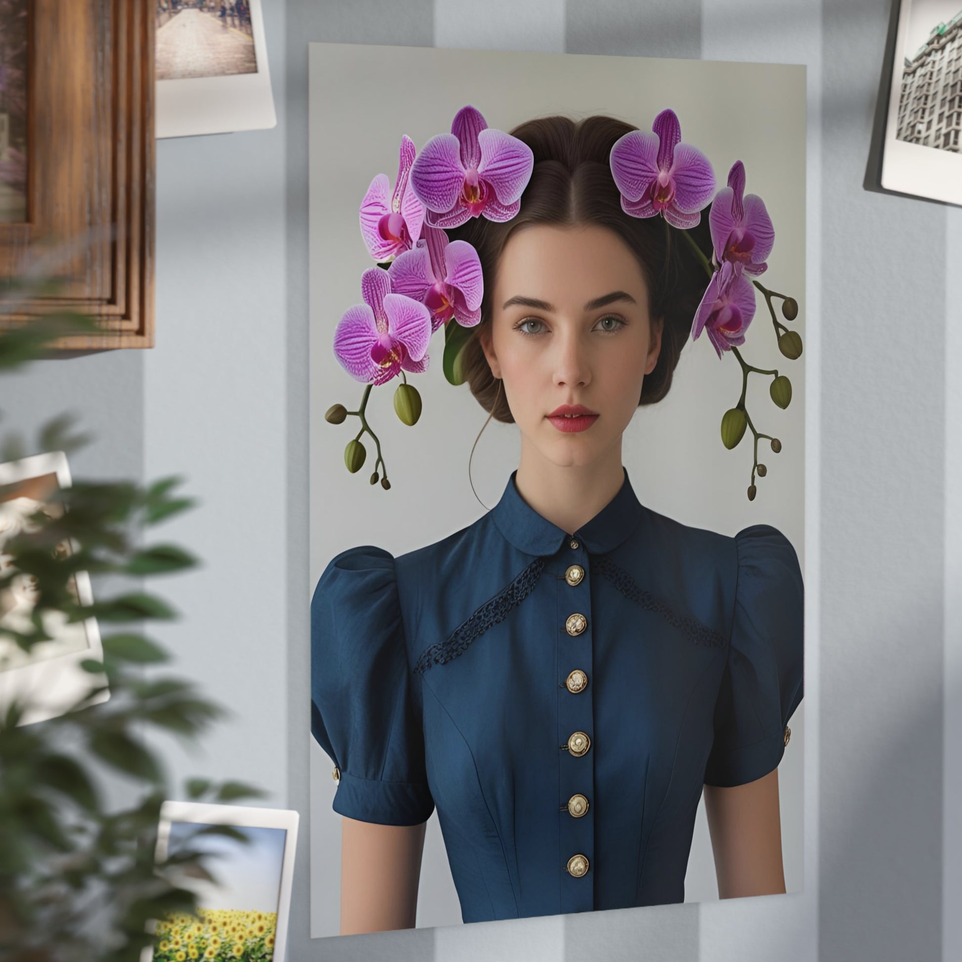Olenna is a vision of quiet strength and natural elegance. Her serene gaze is framed by vivid magenta orchids, symbols of beauty, resilience, and delicate power. Dressed in a vintage dress with golden buttons, she exudes timeless grace, blending vintage refinement with modern allure. The orchids, both tender and fierce, mirror the balance within Olenna—gentle yet unyielding, soft yet commanding. This art print celebrates femininity in full bloom, capturing the harmony between human spirit and nature’s artistry, making it a striking centerpiece for any collection.