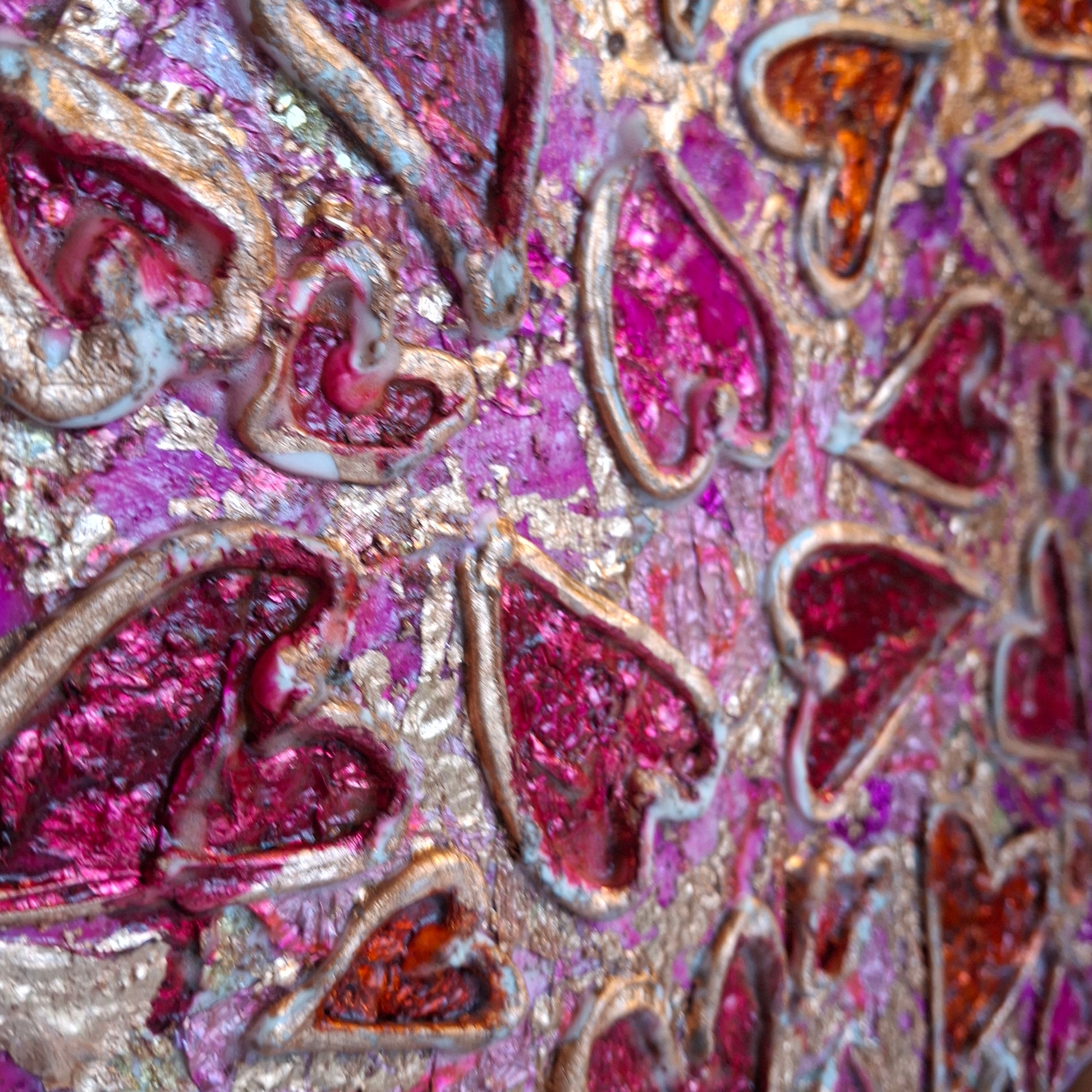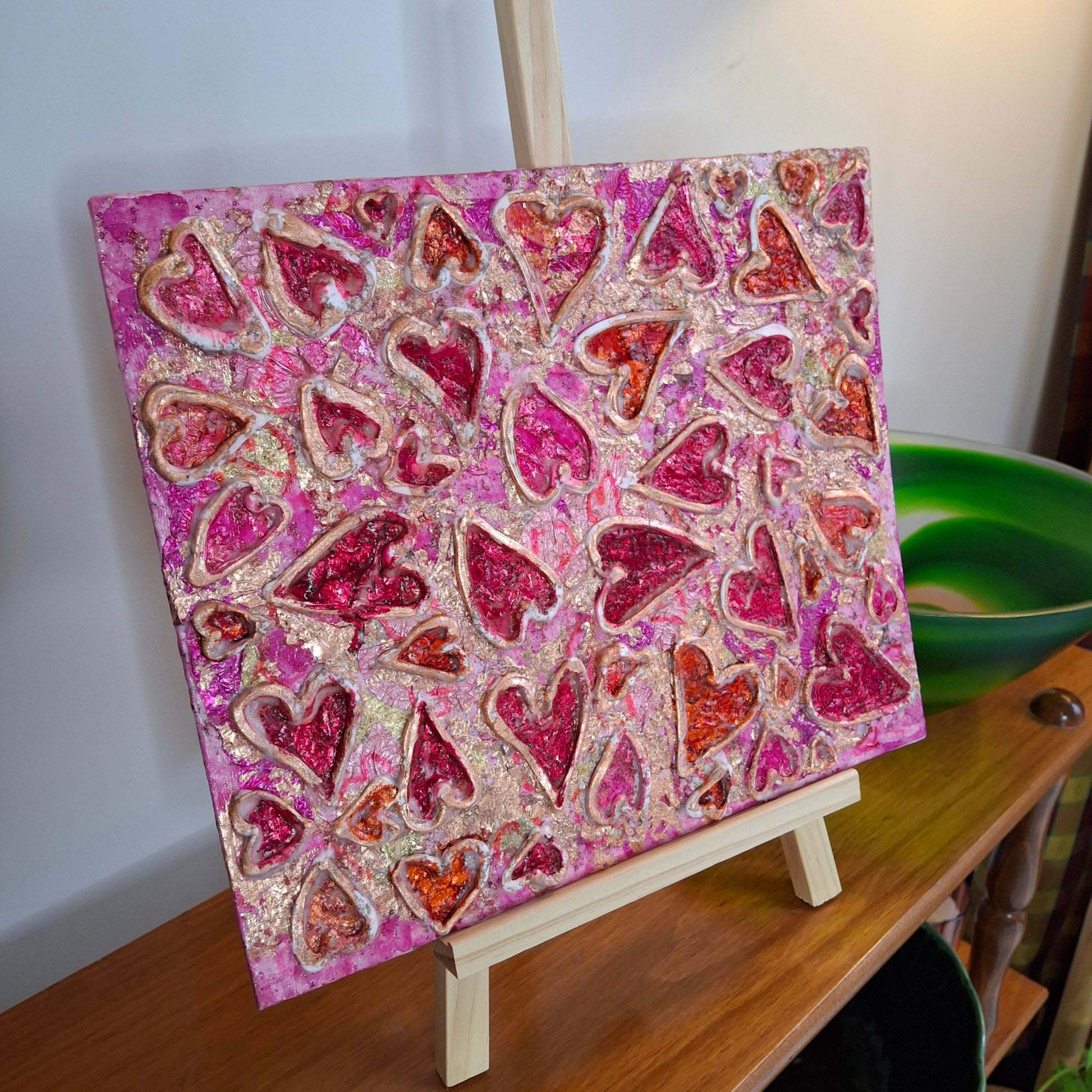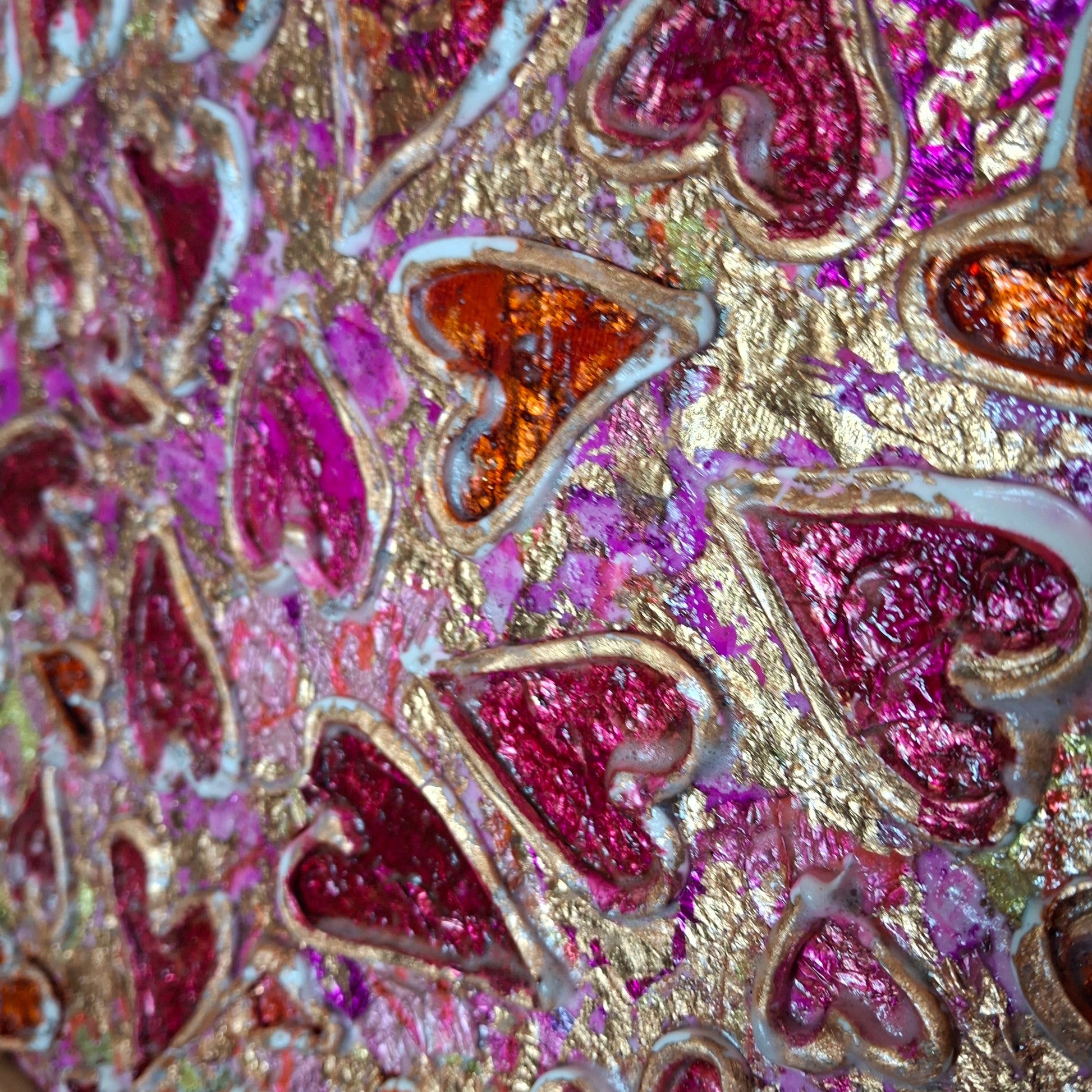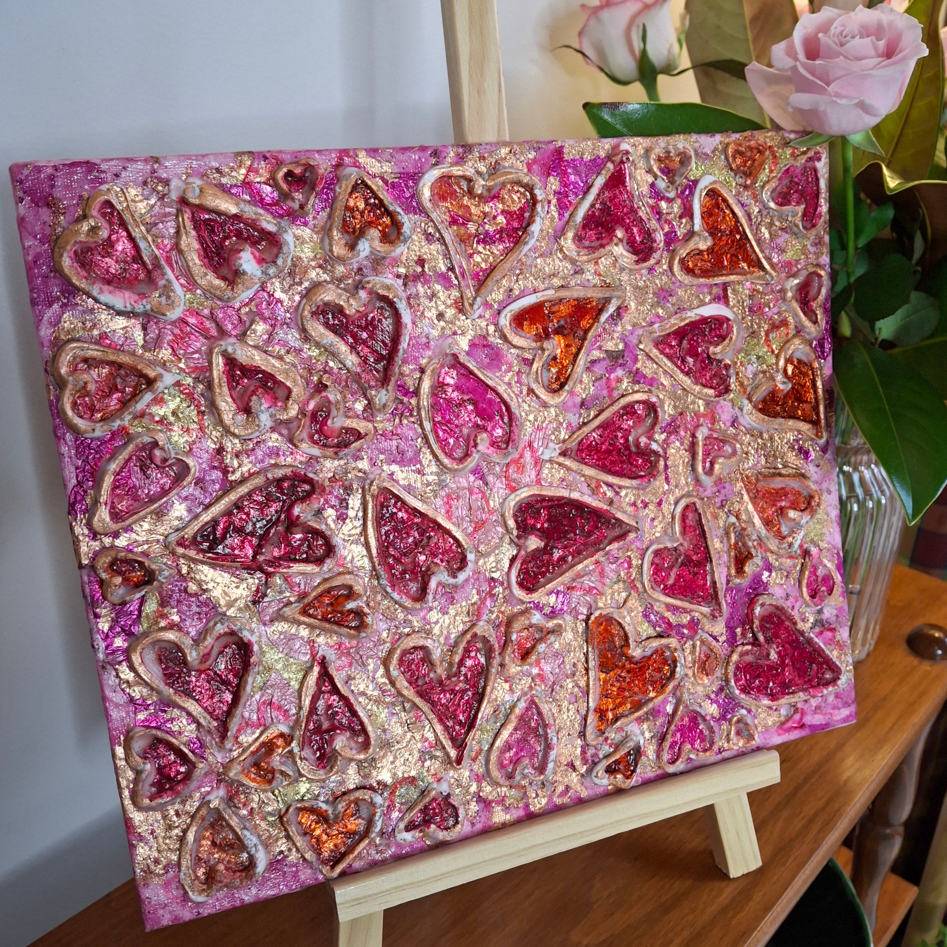 Part of the All for Love Series, Passion Erupts is a joyous mish mash of metallic infused colour. Created with alcohol inks on metallic foil, the highly textured piece shimmers with scattered hearts in vivid reds and pinks in the graffiti esque style of street art. There is passion, there is chaos, there is drama - wham bam thankyou mam.