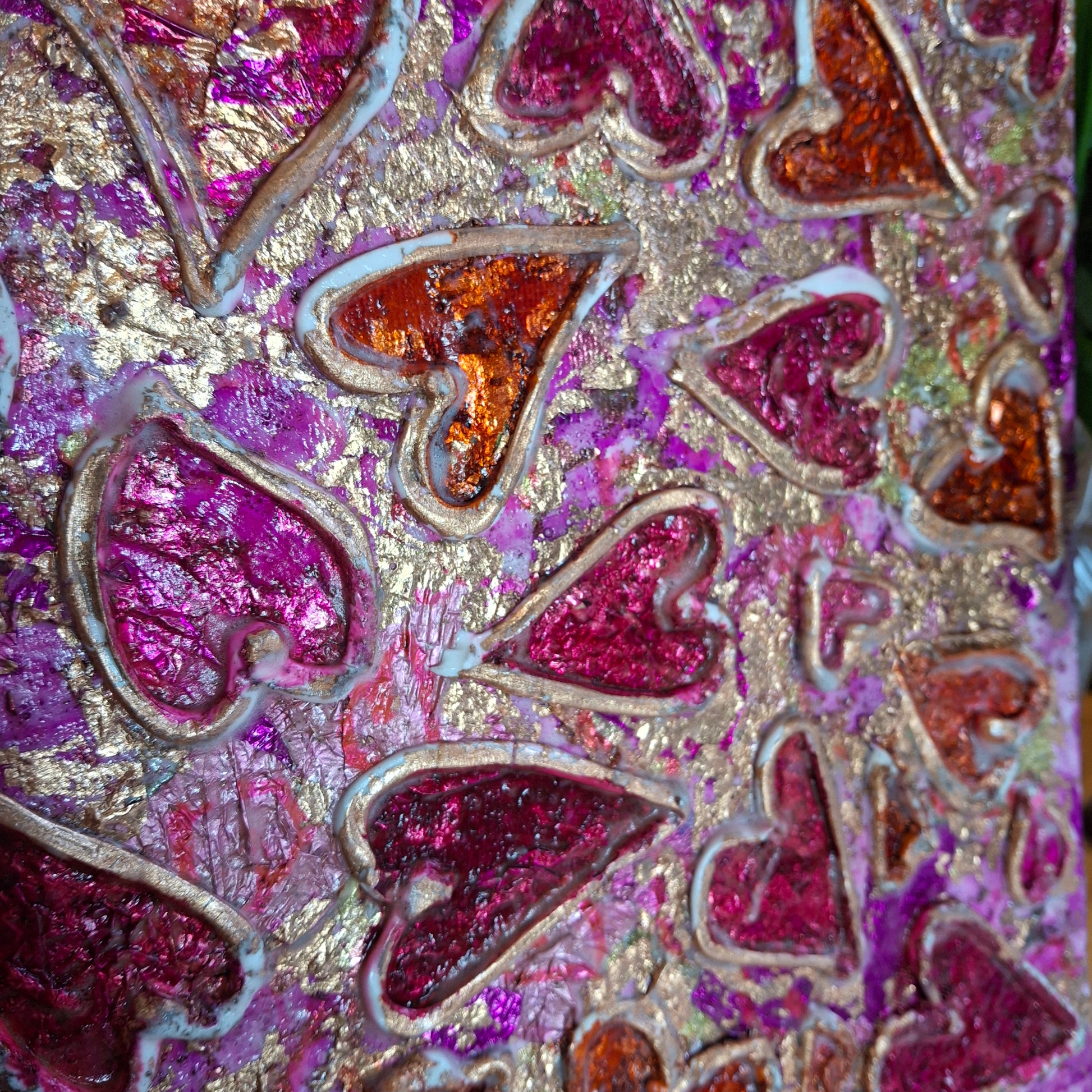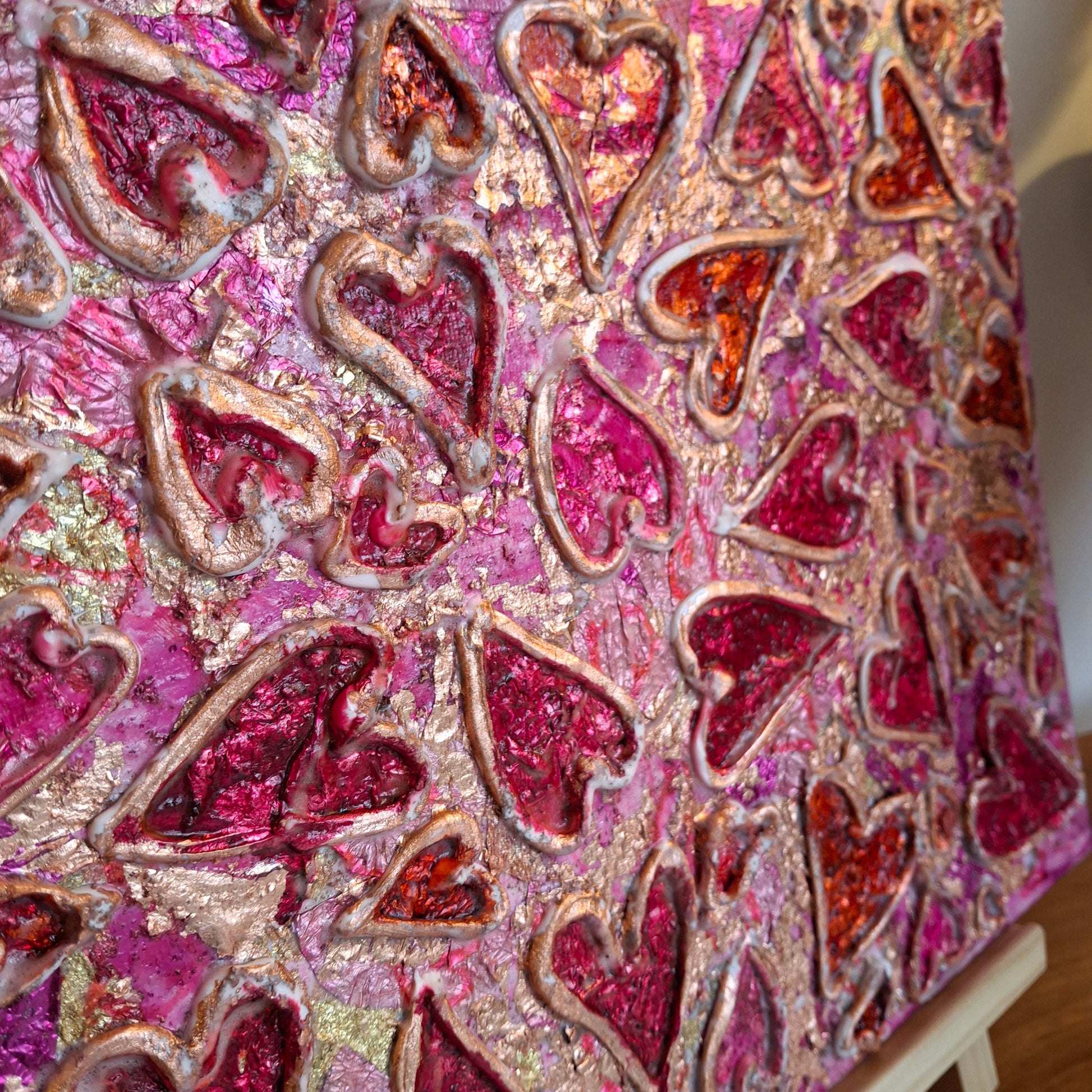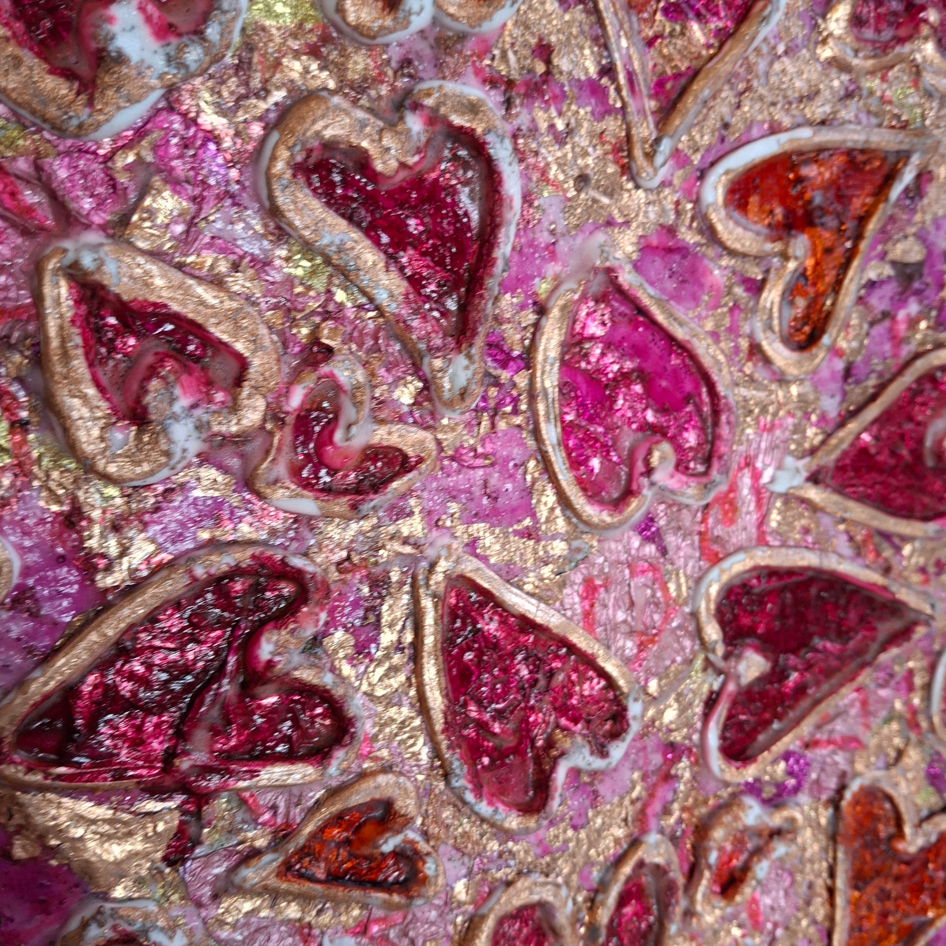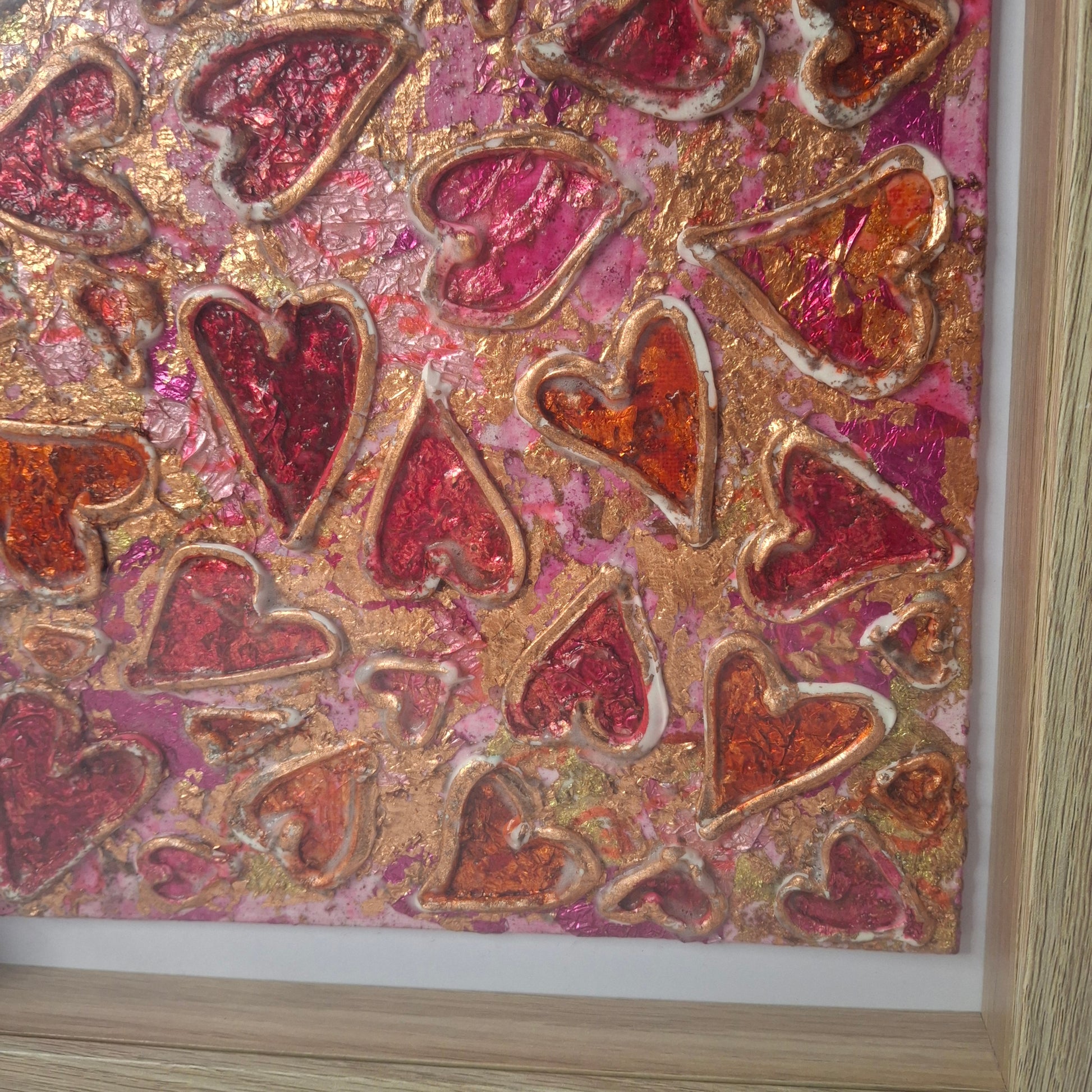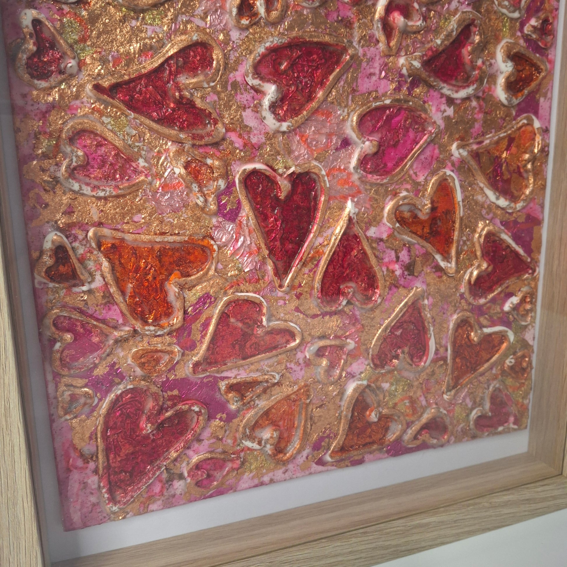 Part of the All for Love Series, Passion Erupts is a joyous mish mash of metallic infused colour. Created with alcohol inks on metallic foil, the highly textured piece shimmers with scattered hearts in vivid reds and pinks in the graffiti esque style of street art. There is passion, there is chaos, there is drama - wham bam thankyou mam.