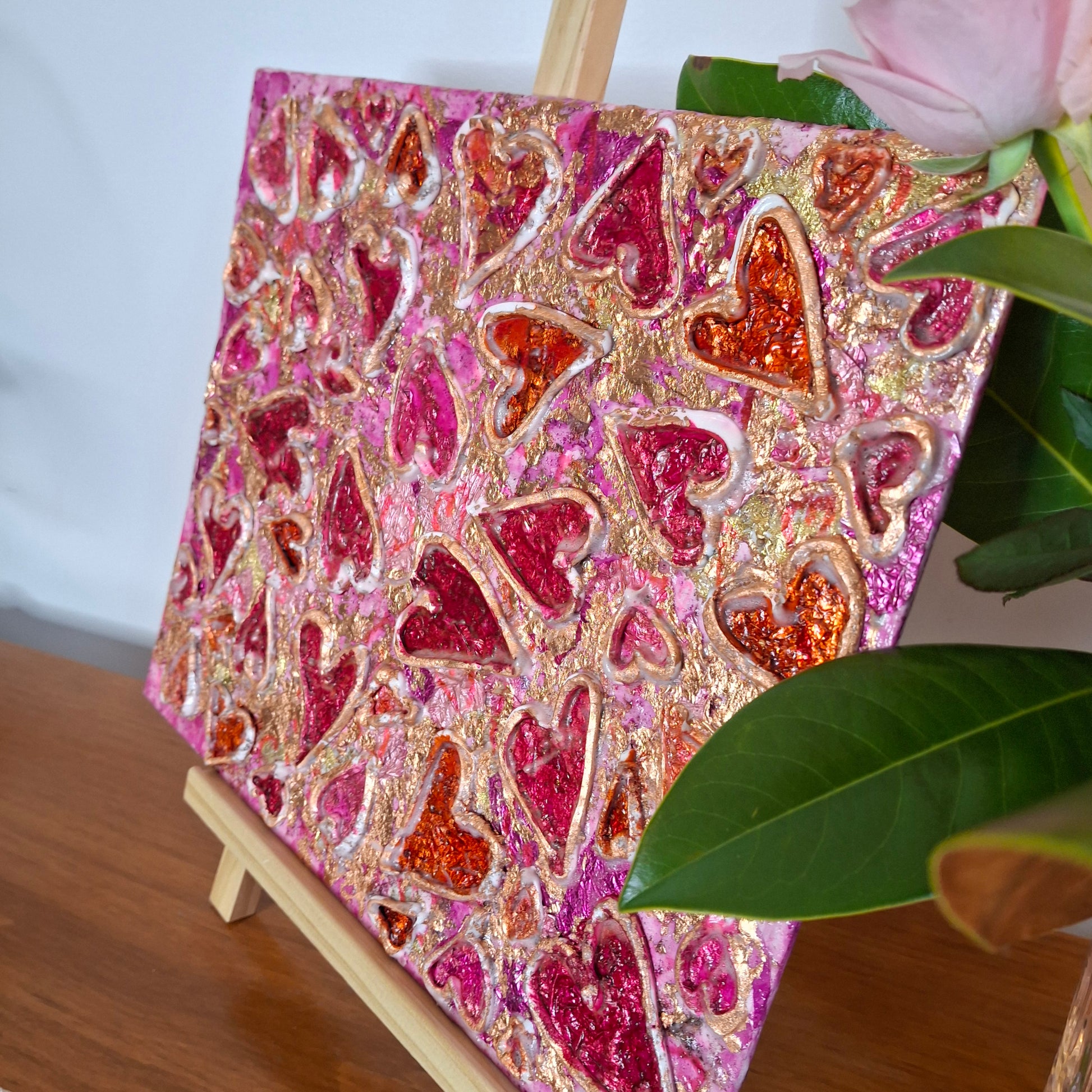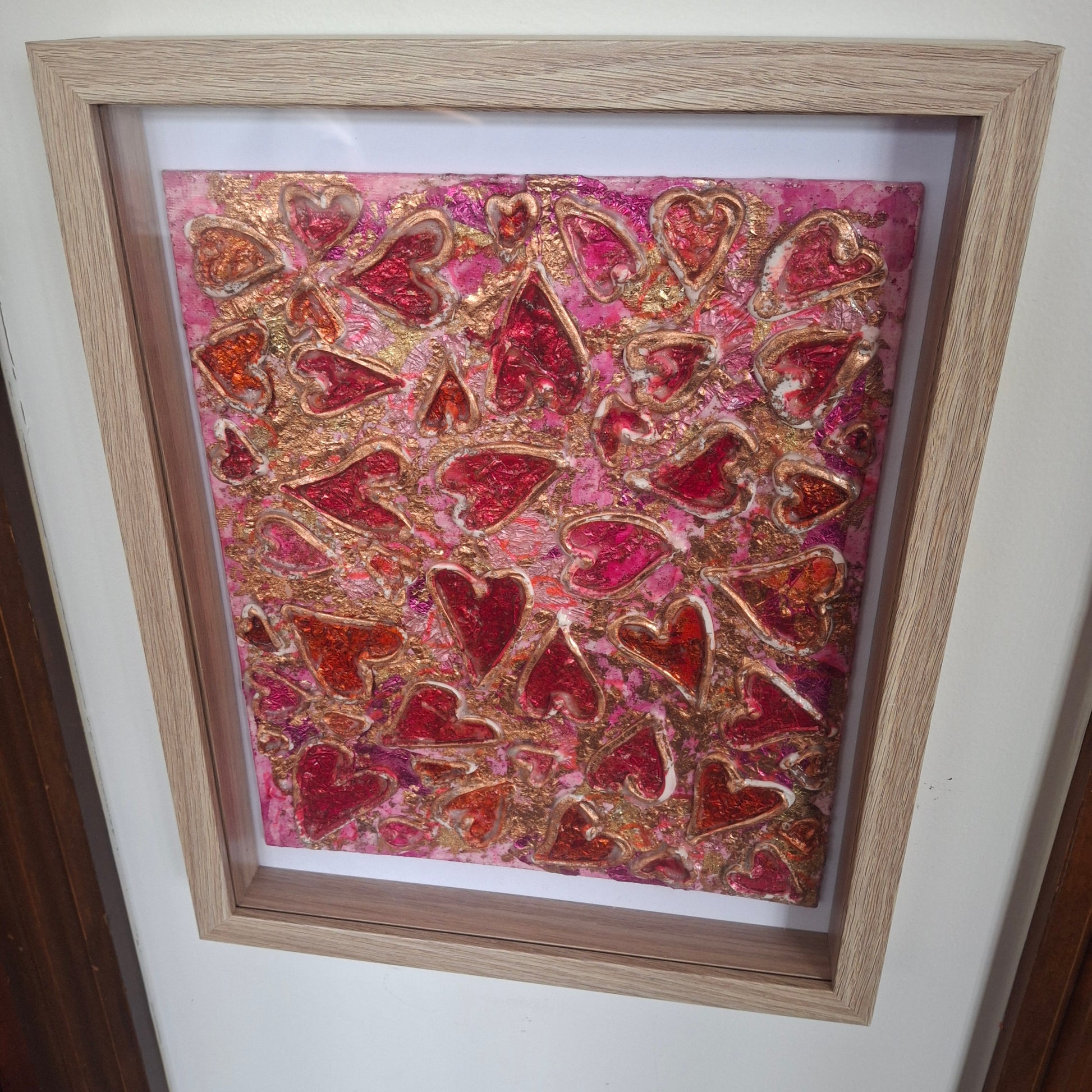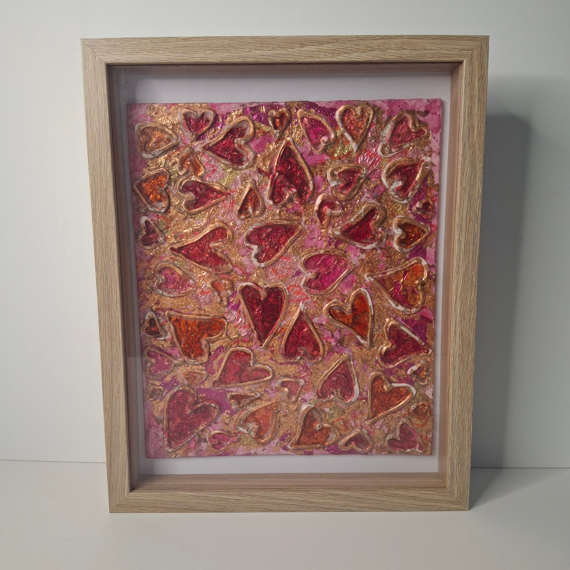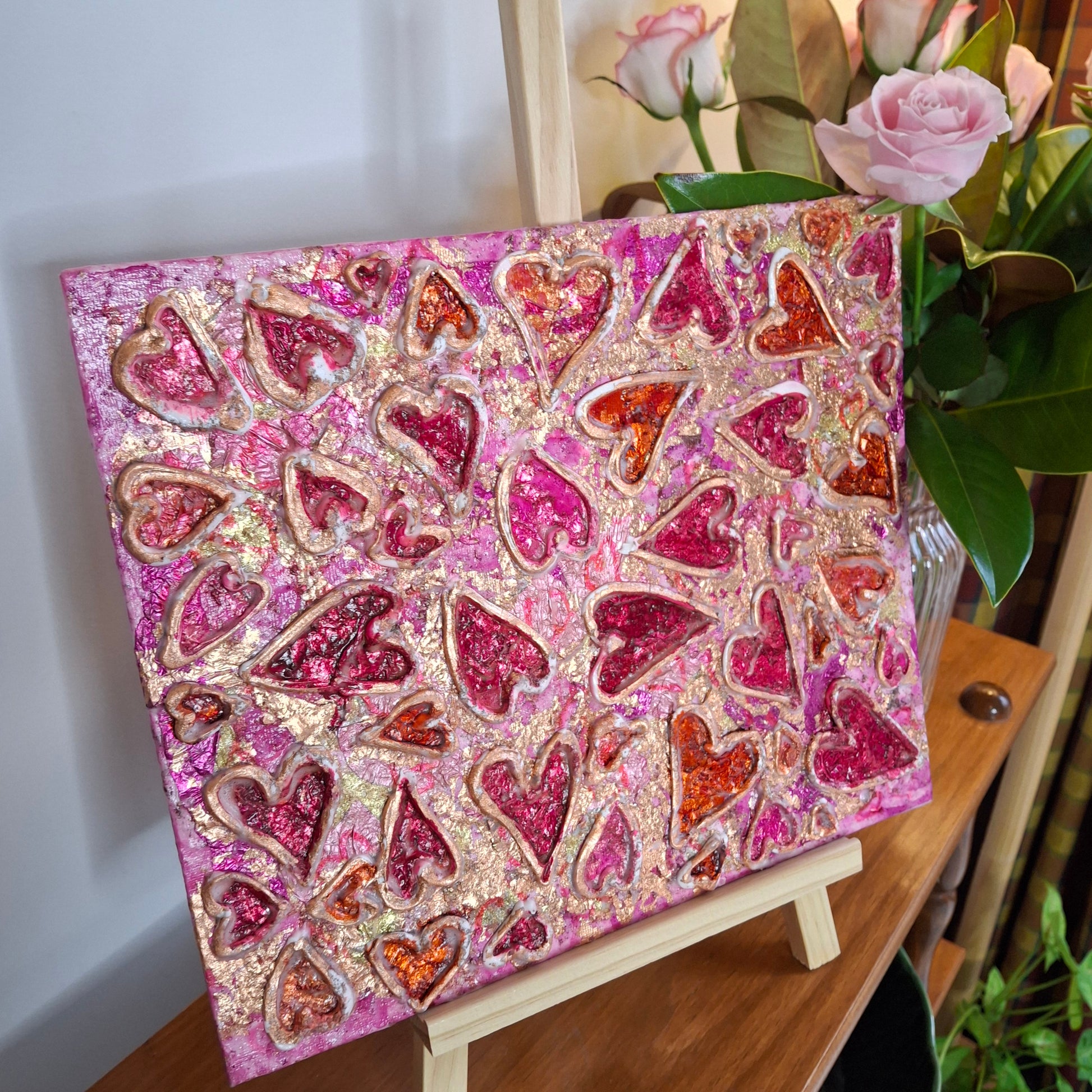 Part of the All for Love Series, Passion Erupts is a joyous mish mash of metallic infused colour. Created with alcohol inks on metallic foil, the highly textured piece shimmers with scattered hearts in vivid reds and pinks in the graffiti esque style of street art. There is passion, there is chaos, there is drama - wham bam thankyou mam.
