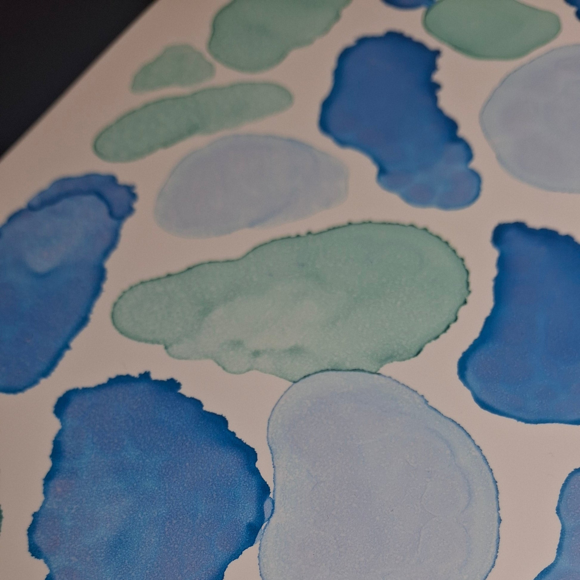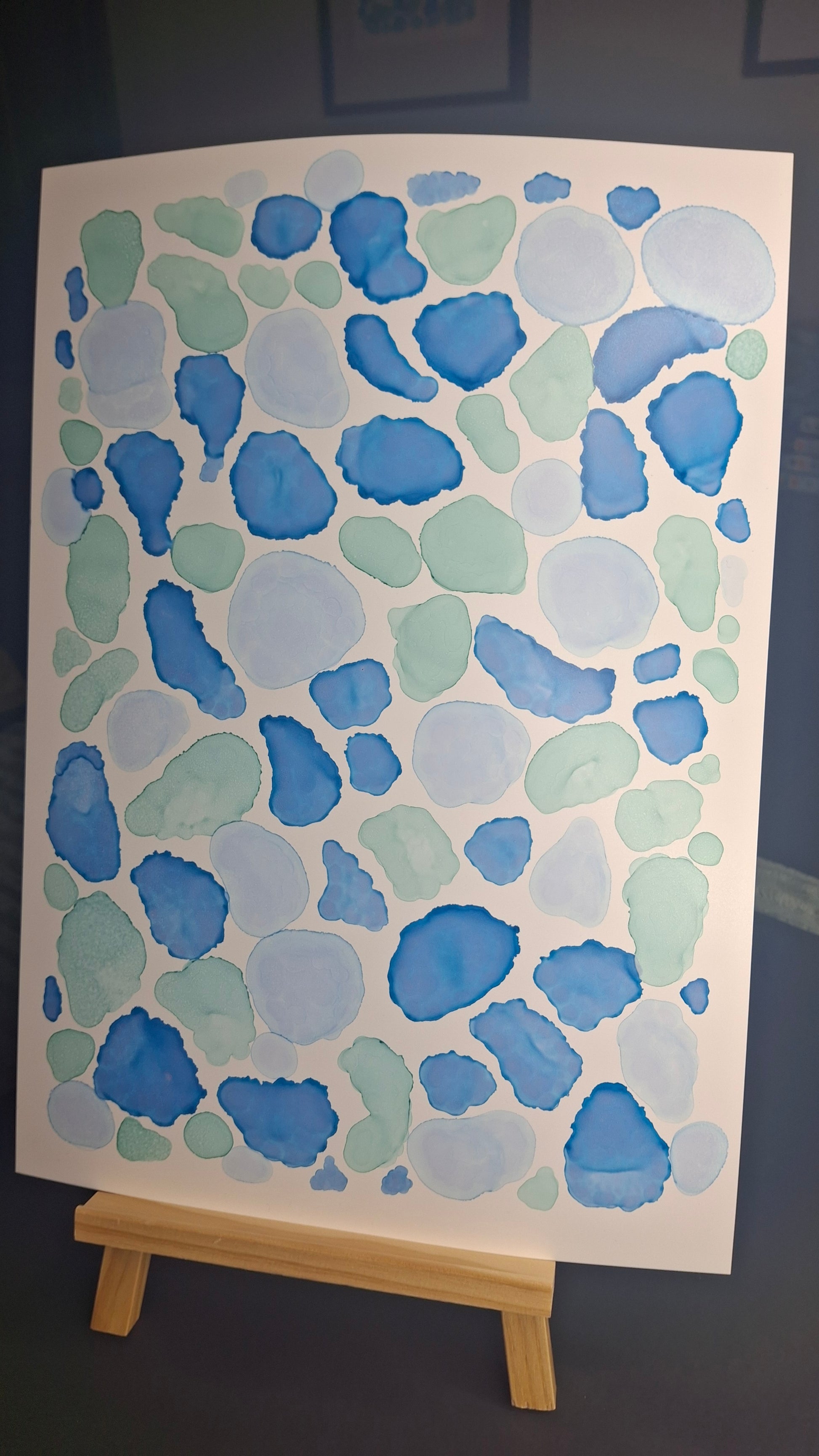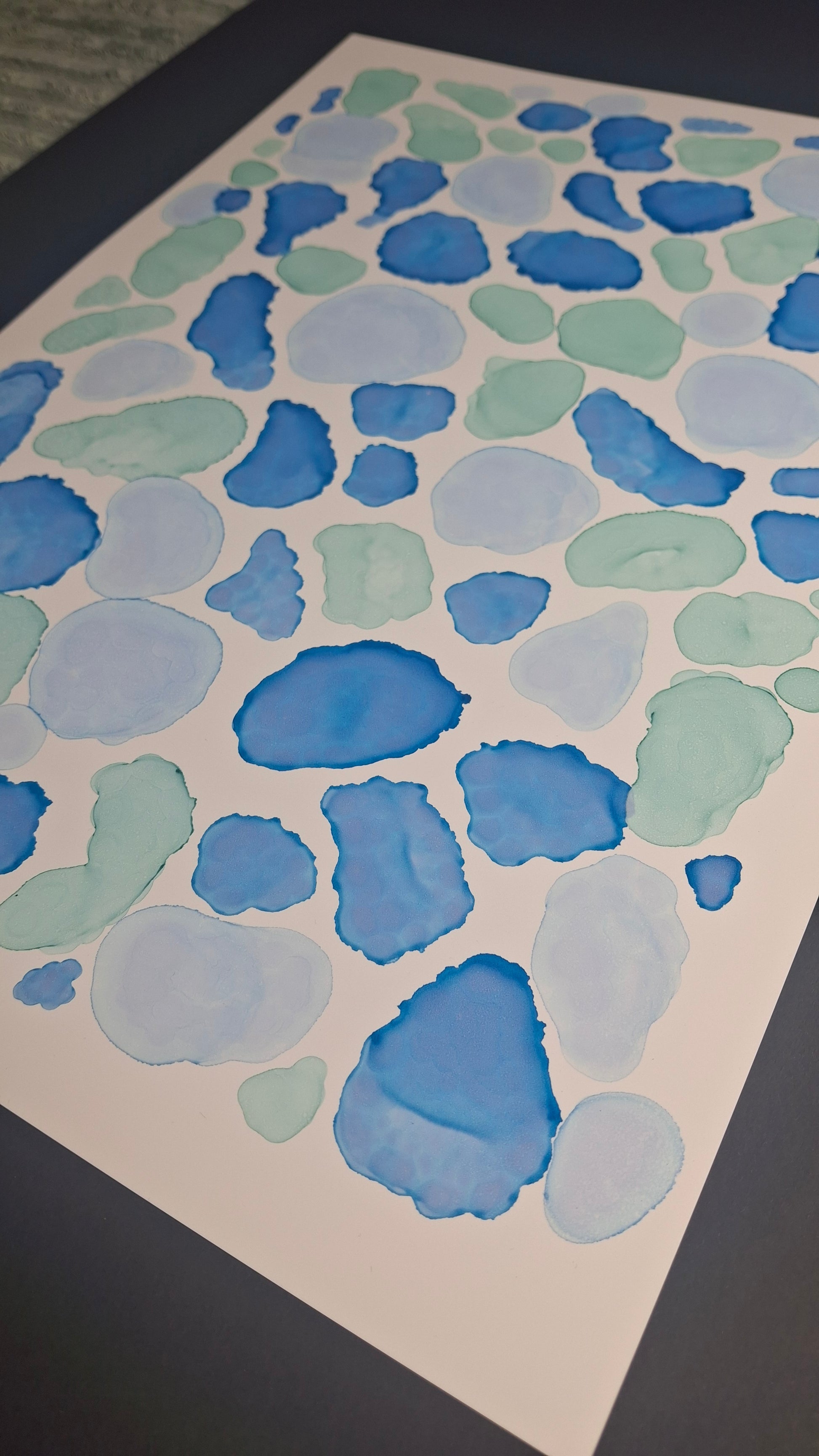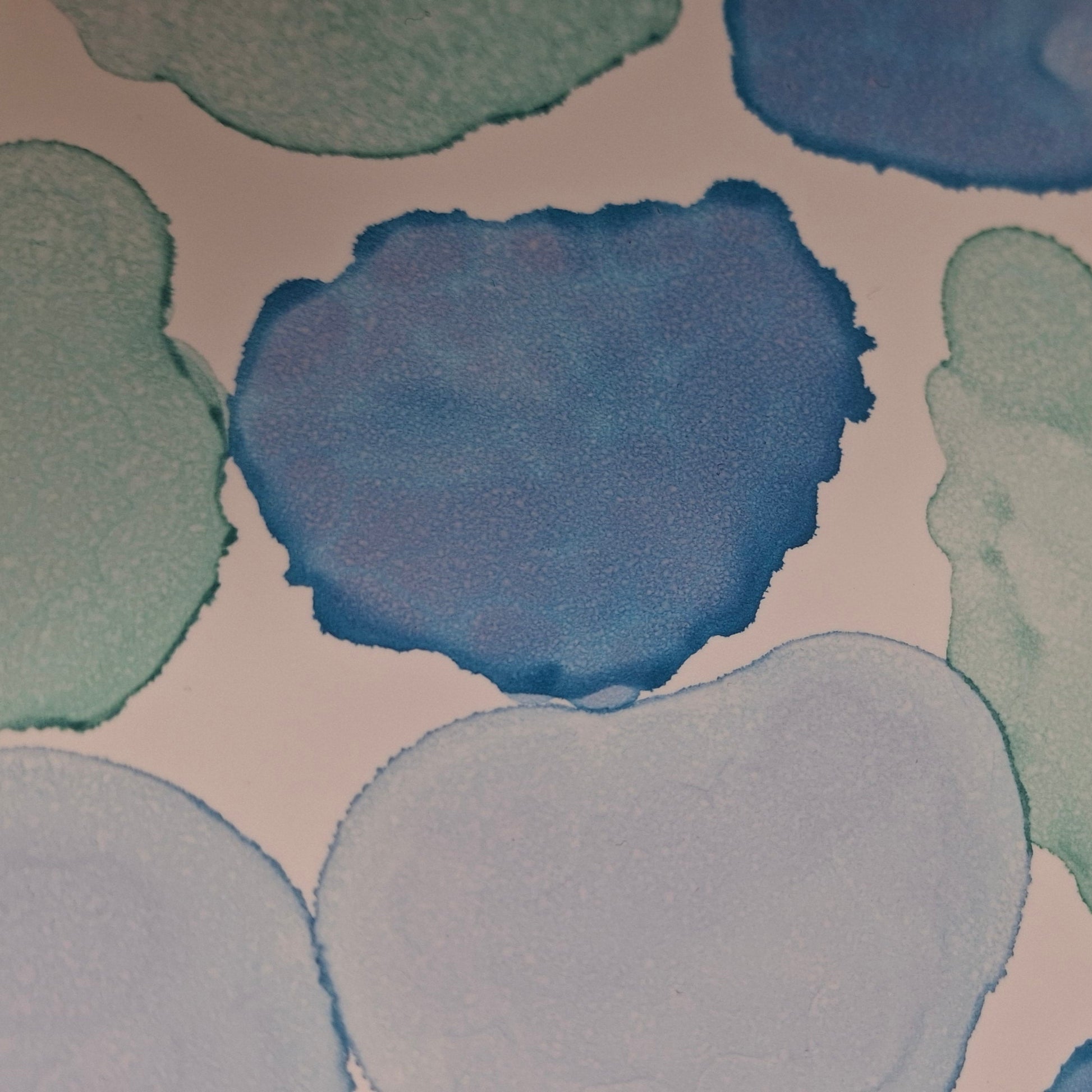 By the Sea is an A3 original artwork created with alcohol inks, inspired by the shapes, movement, and colours found along cold, quiet beaches. Layers of soft turquoise, sea green and deep ocean blue flow together in organic forms, echoing scattered seashells, smooth pebbles, sea glass and tidal pools revealed at low tide. Each shape has been carefully placed to evoke the meditative rhythm of wandering the shoreline, breathing in salty air, and feeling the crisp sea breeze. This piece captures the beauty of still moments by the water, offering a sense of calm and connection to the raw, untamed edge of the ocean.