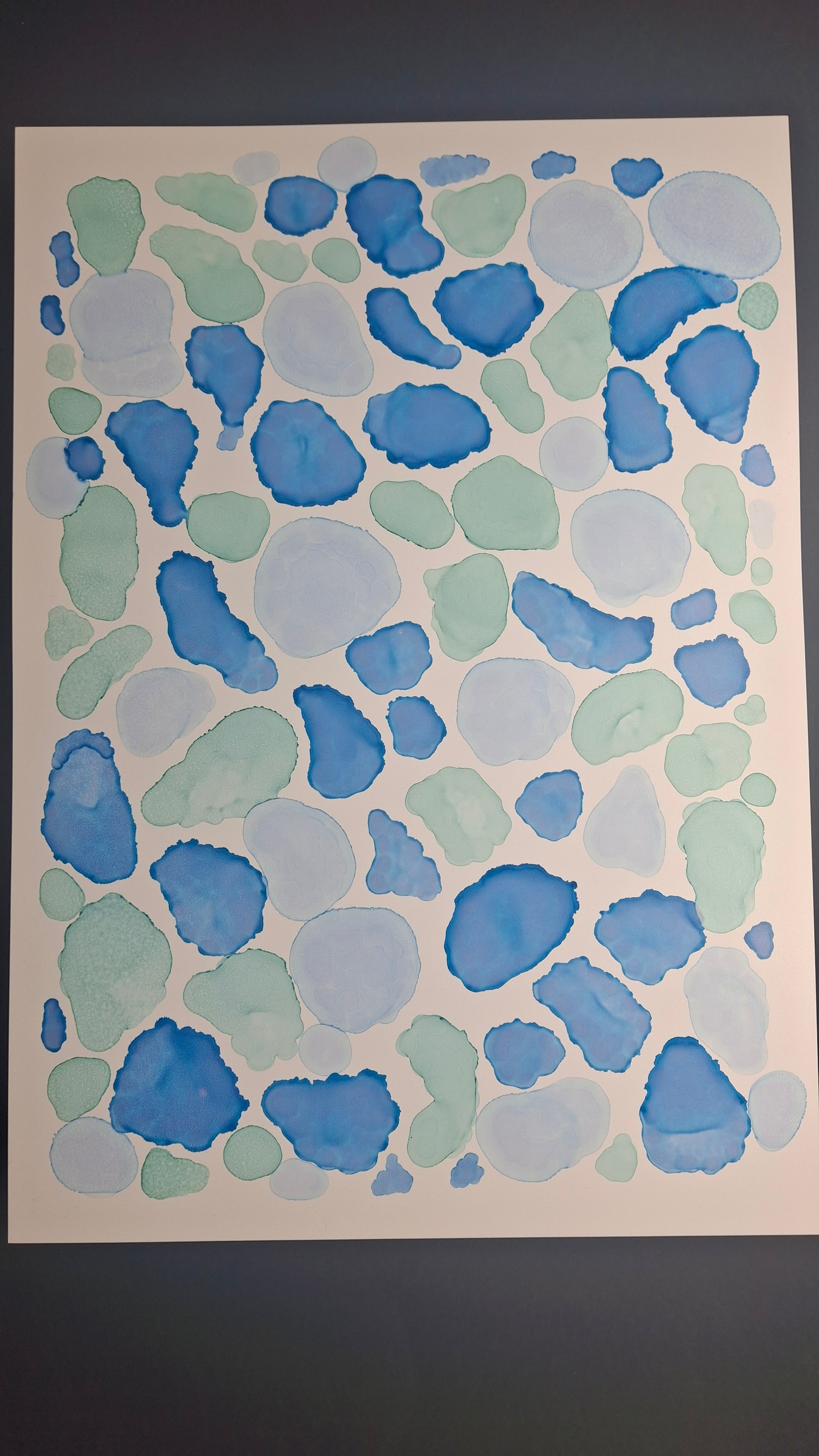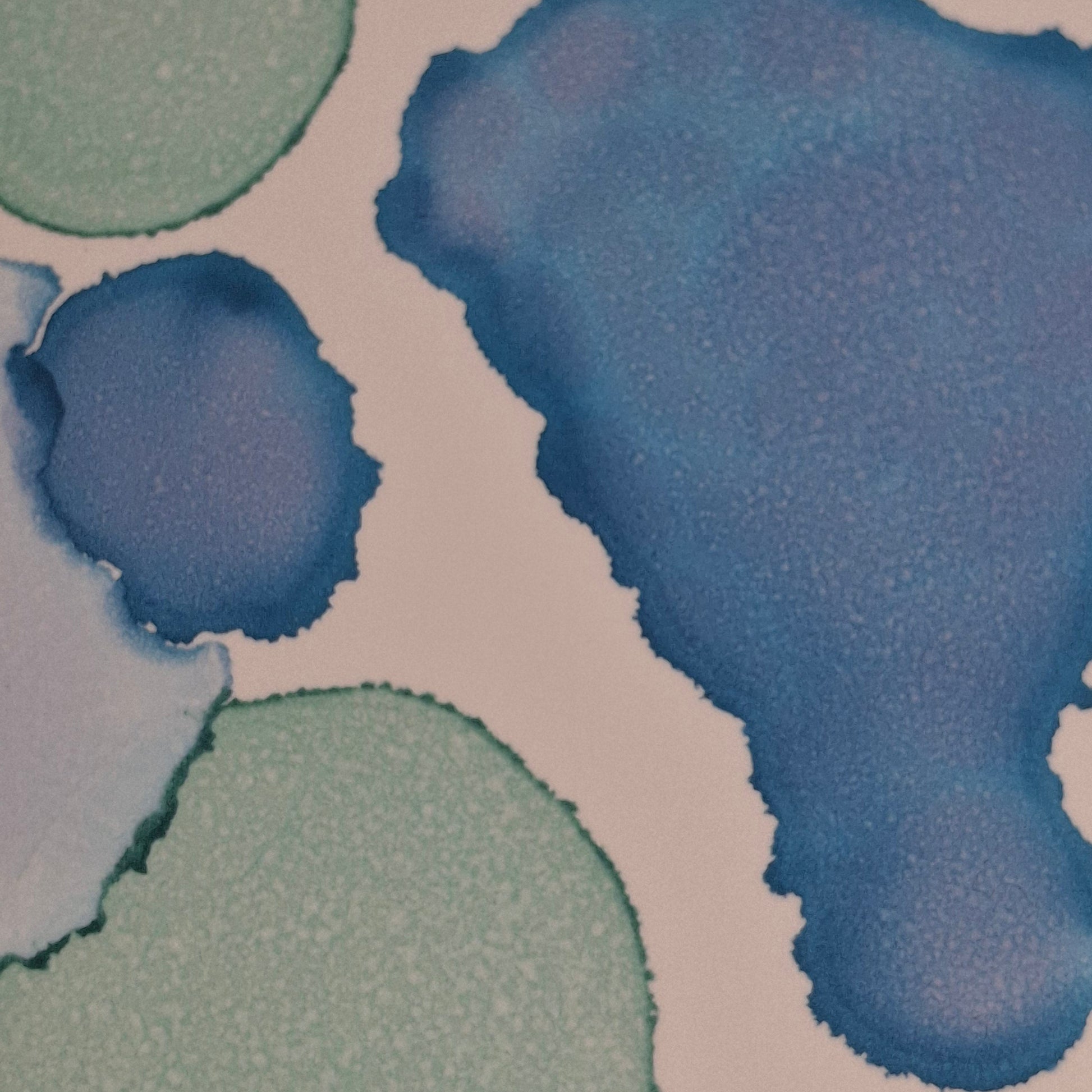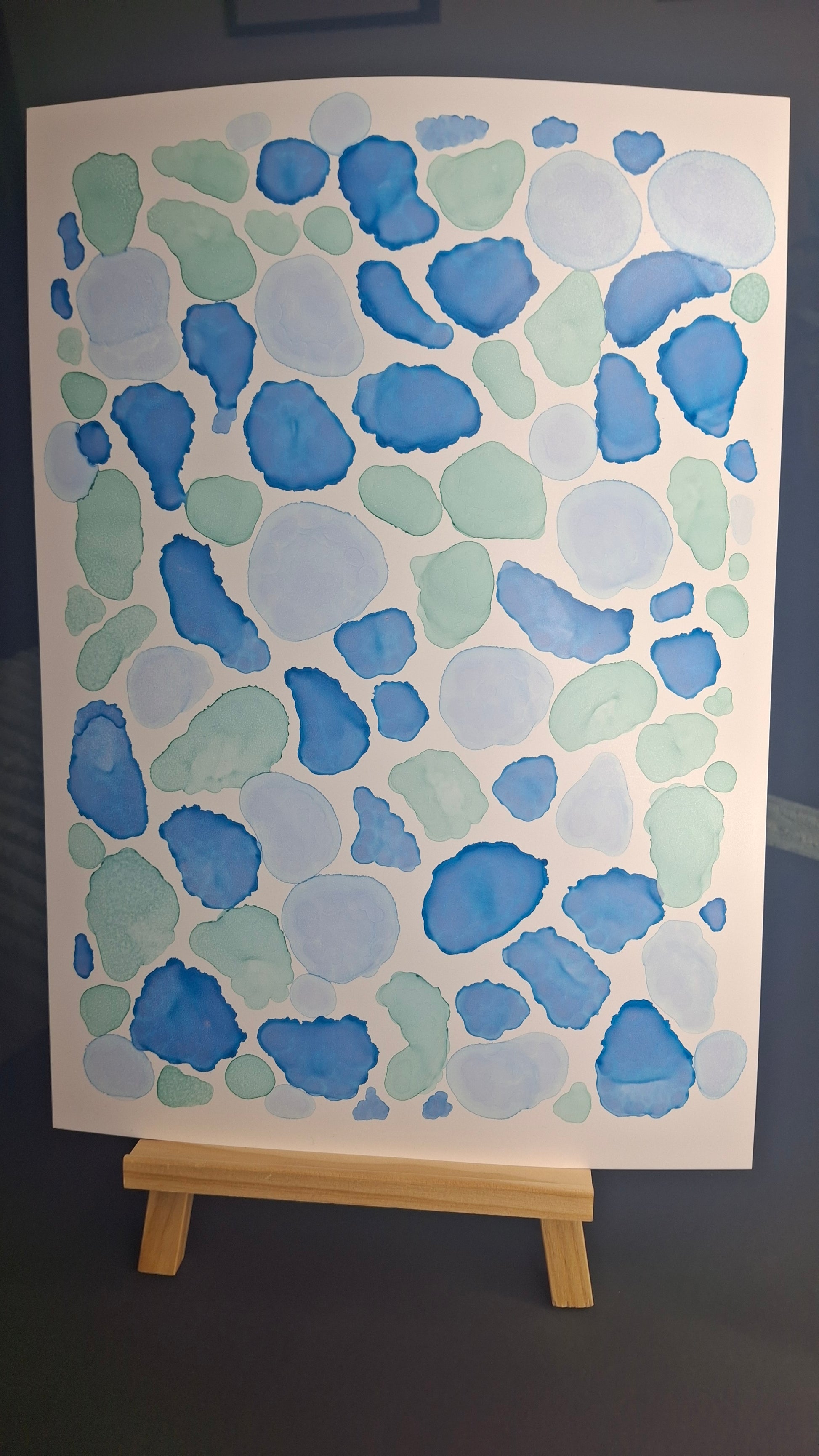 By the Sea is an A3 original artwork created with alcohol inks, inspired by the shapes, movement, and colours found along cold, quiet beaches. Layers of soft turquoise, sea green and deep ocean blue flow together in organic forms, echoing scattered seashells, smooth pebbles, sea glass and tidal pools revealed at low tide. Each shape has been carefully placed to evoke the meditative rhythm of wandering the shoreline, breathing in salty air, and feeling the crisp sea breeze. This piece captures the beauty of still moments by the water, offering a sense of calm and connection to the raw, untamed edge of the ocean.