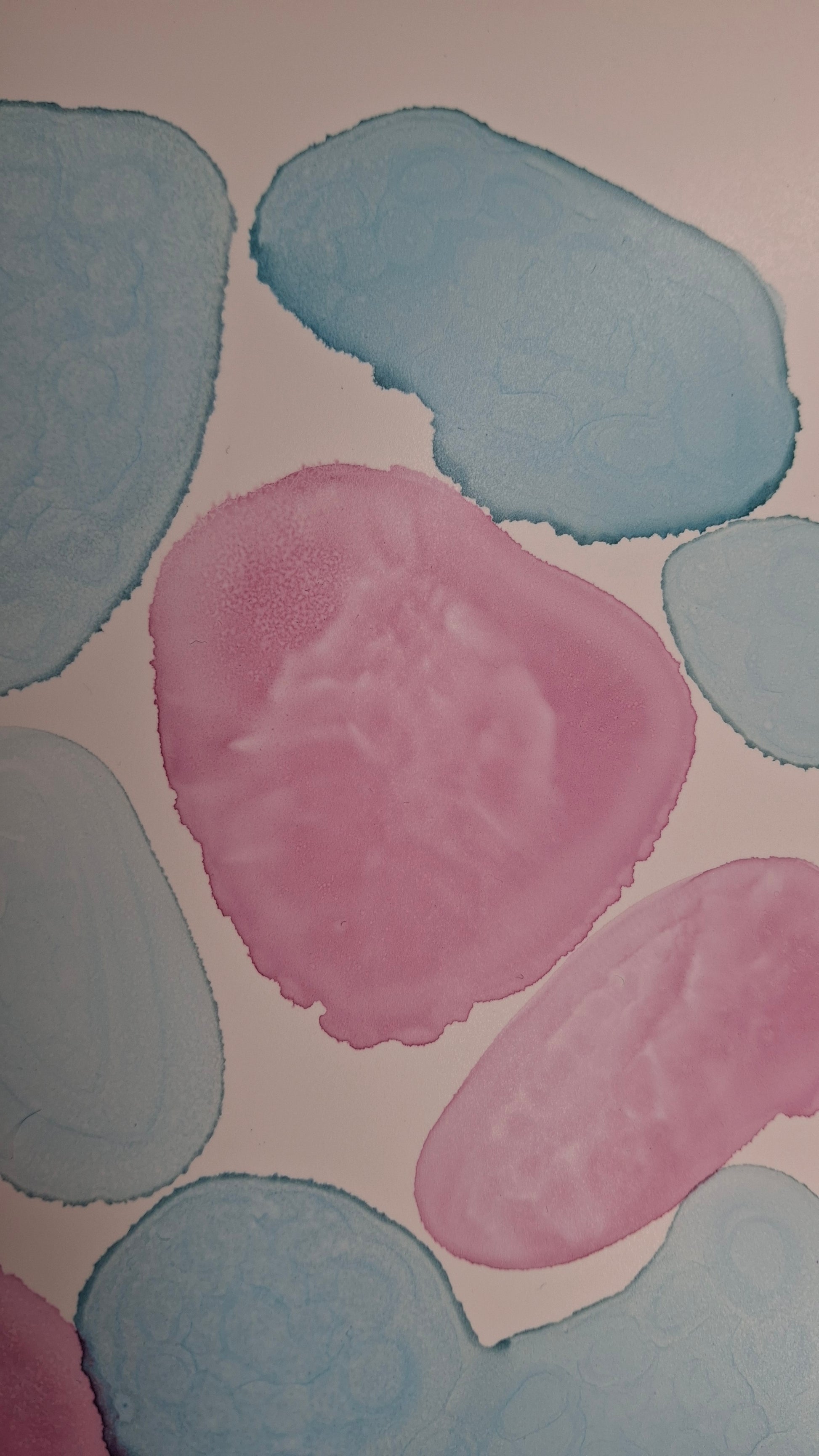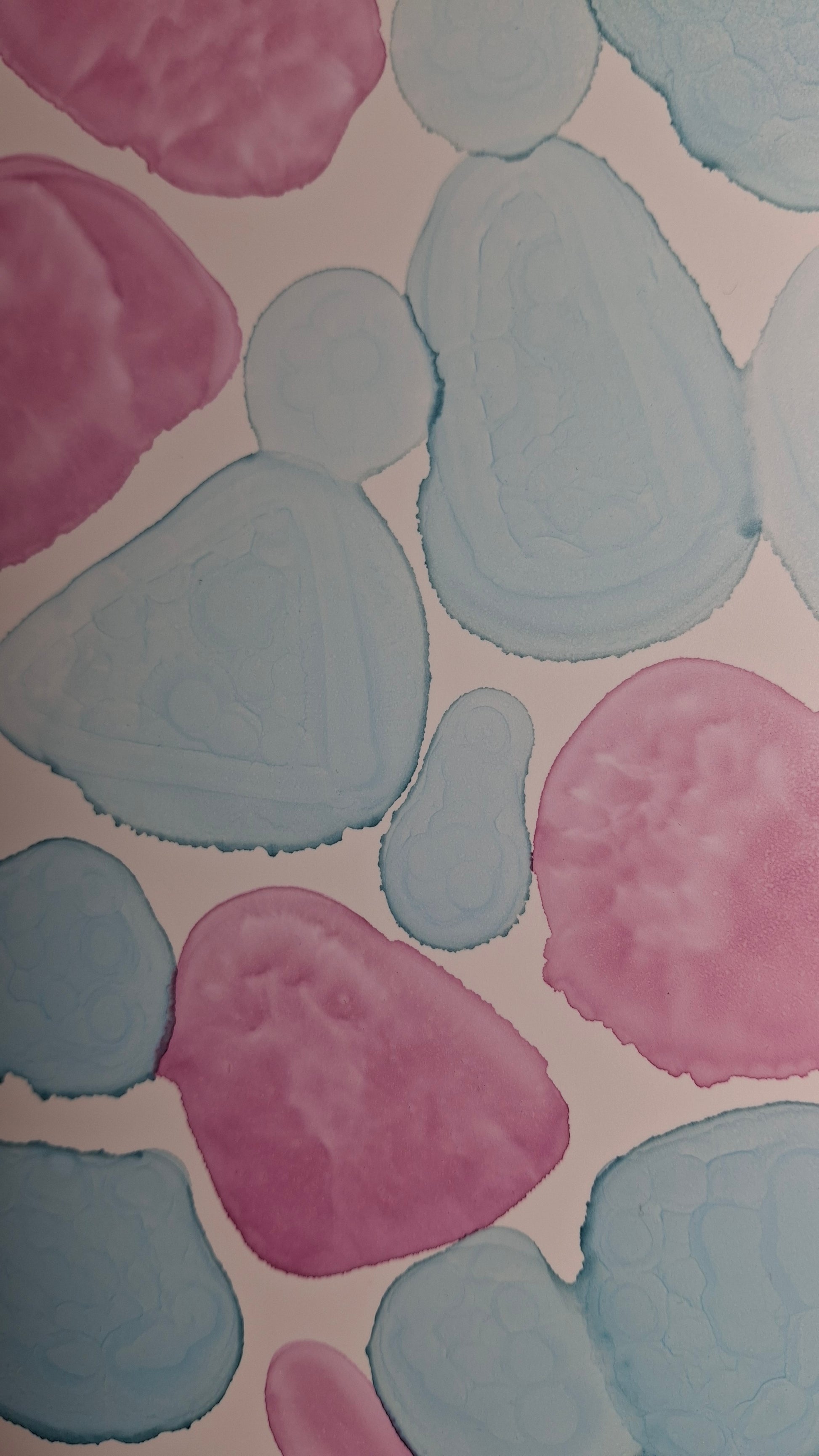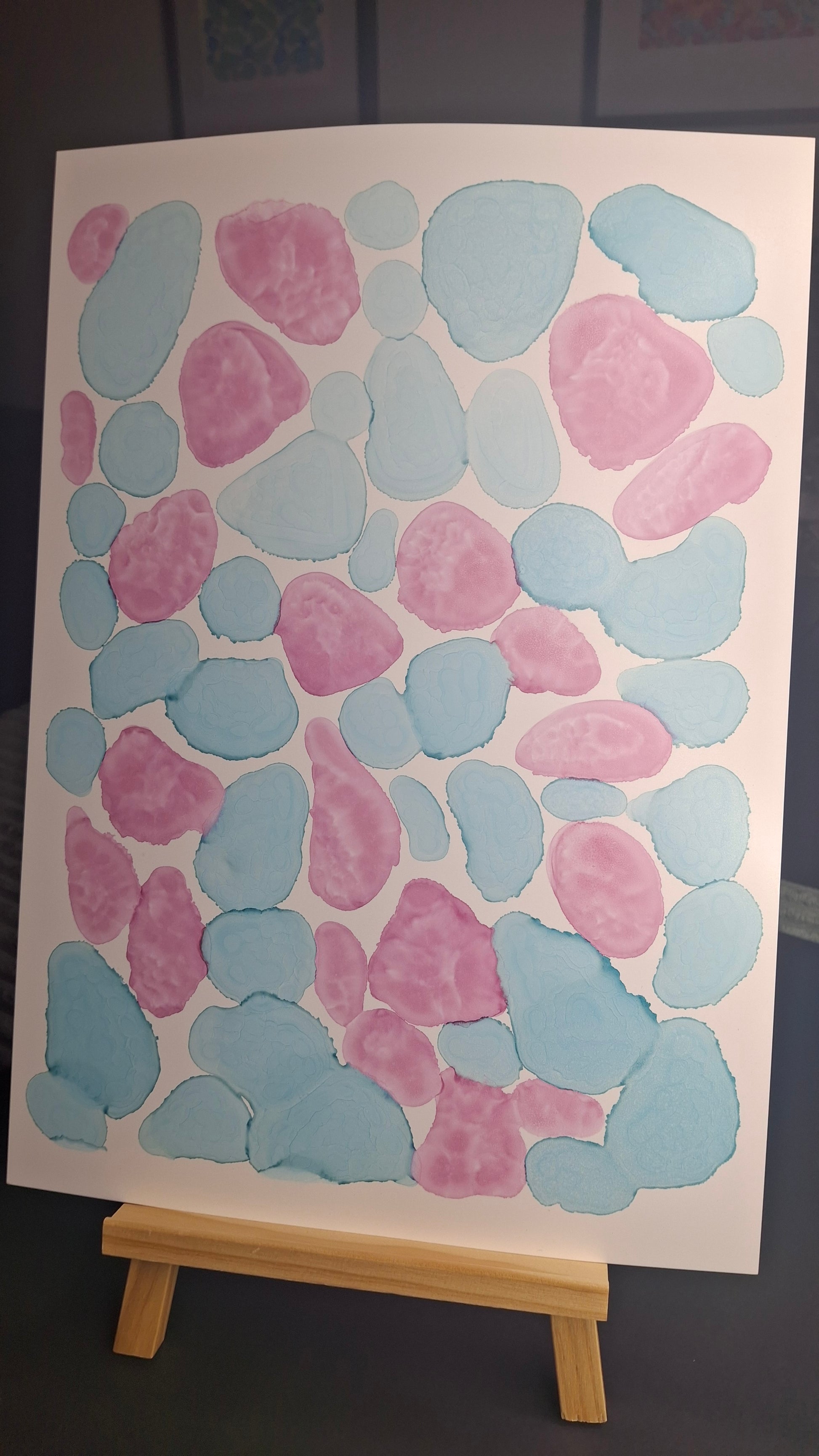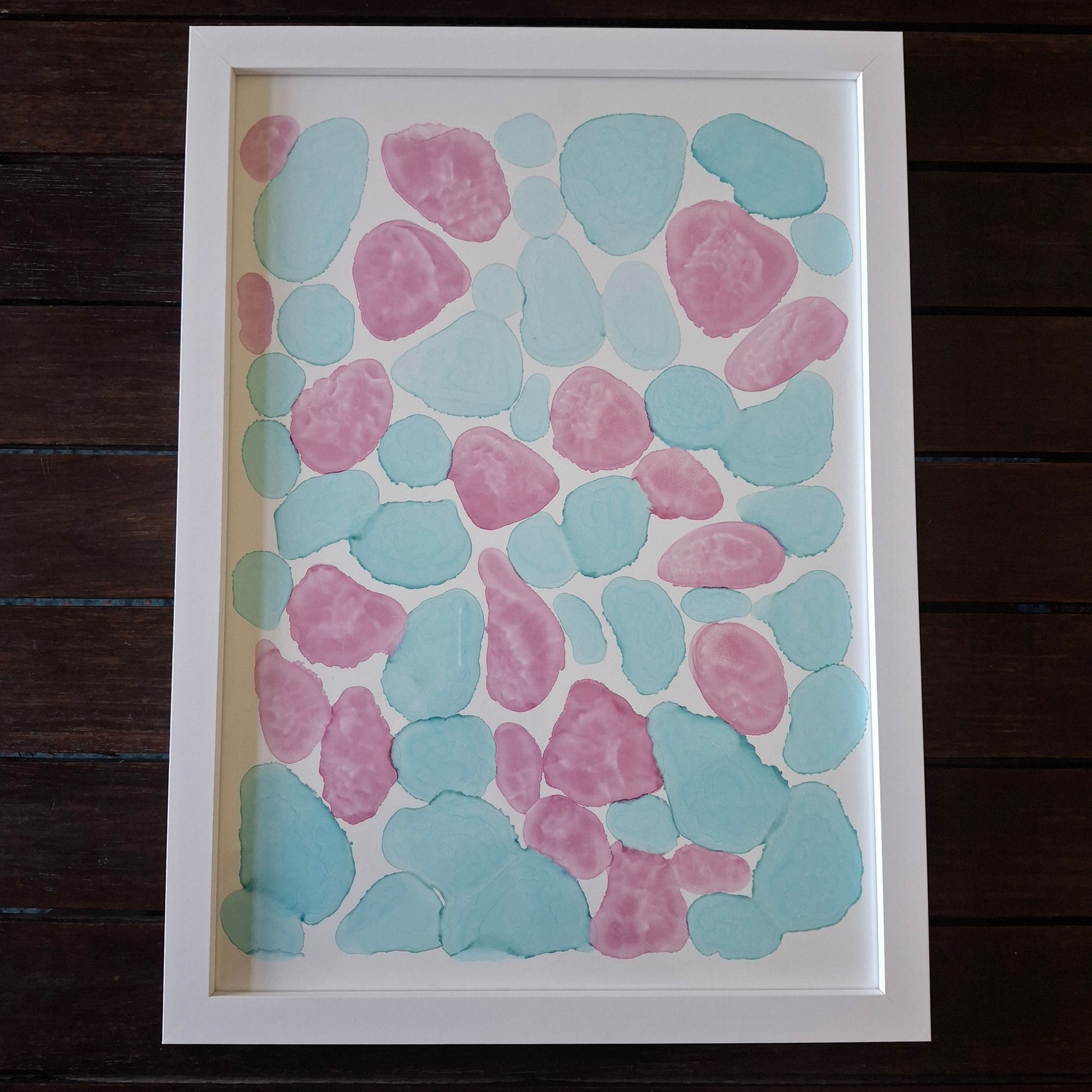 The Tide’s Whisper captures the gentle conversation between sea and shore. Soft shapes in sea blue and coral pink drift across the canvas like smooth pebbles beneath clear water, their edges melting and merging as if swayed by an always there current. Created with alcohol inks, this A3 original by Elizabeth Marshall is part of The Sea is My Lover series, a collection that celebrates the beauty, calm, and intimacy of the ocean. Each form seems to hold a memory of the tide—its ebb, its flow, its quiet song—inviting the viewer to pause, breathe, and listen to the whispers of the sea.